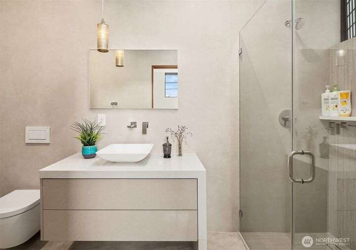 Rare culmination of modern & luxury artfully executed with custom details throughout. Floor to ceiling windows capture lake, city & mountain views while flooding the interior with natural light. Generous great room wraps a two-story atrium with tropical plants & bubbling fountain, integrating the sights & sounds of nature. 5 ensuite bedrooms, including a main floor guest & separate home office. Lower level suite w/private entry offers MIL potential. Smart home features enable remote automation. Private yard with tranquil koi pond. Gorgeous landscaping surrounds the home with a rainbow of perennial color. Exceptional Lk WA schools & just steps to waterfront parks, shops & dining. Unsurpassed quality & design near desirable downtown Kirkland!