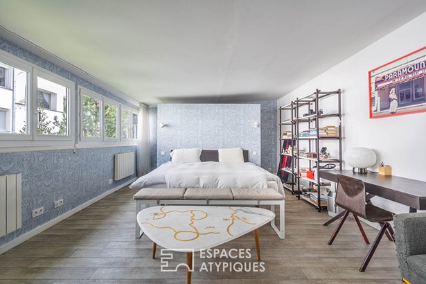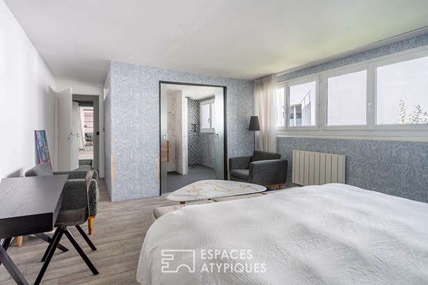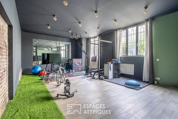 An entrance with a large dressing room successively leads to a bathroom, a water closet and a gym of 39m2 and 3m high, adorned with a brick wall bringing a resolutely New York spirit.