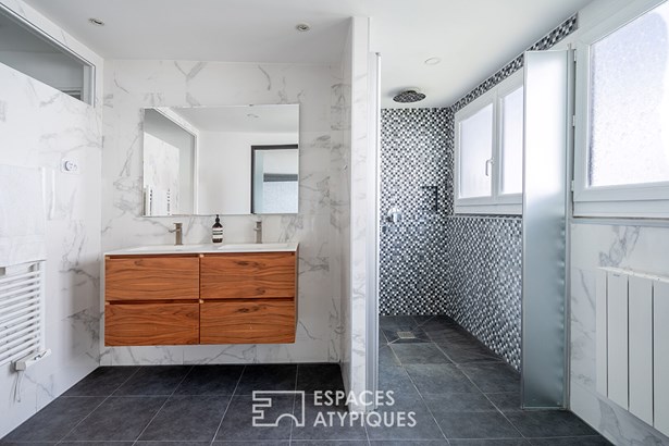On the other side, the master suite benefits from large windows, a dressing room cleverly hidden behind the headboard and an XXL-sized shower room. A water closet completes the level.