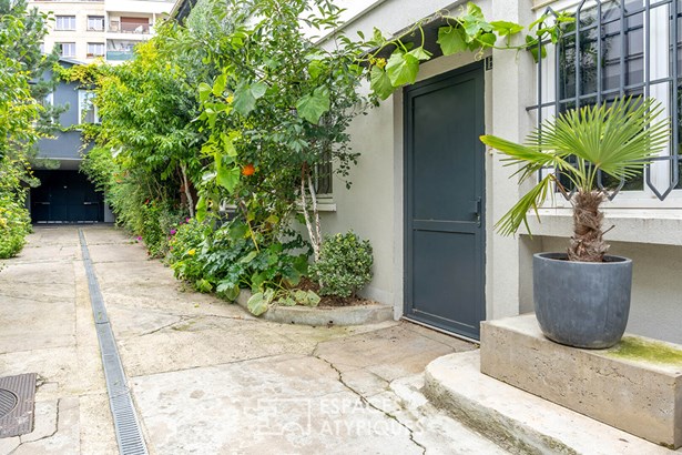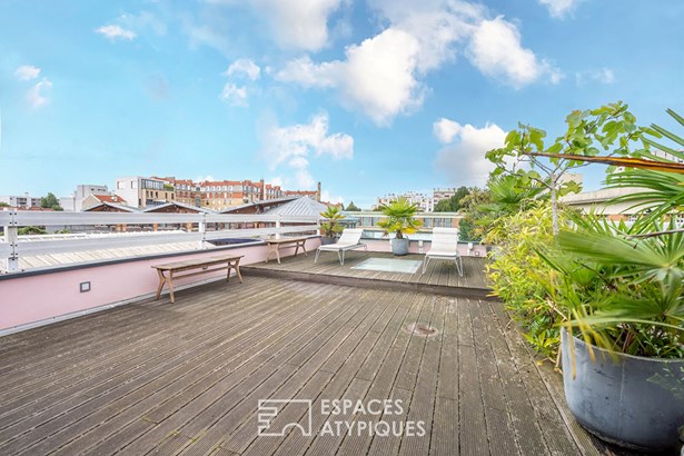 Located between Aubervilliers Town Hall and Square Lucien Brun, sheltered from a private green courtyard, there is a 174.41m2 habitable Carrez loft, resulting from the rehabilitation of an industrial building and built on two levels with a roof terrace.