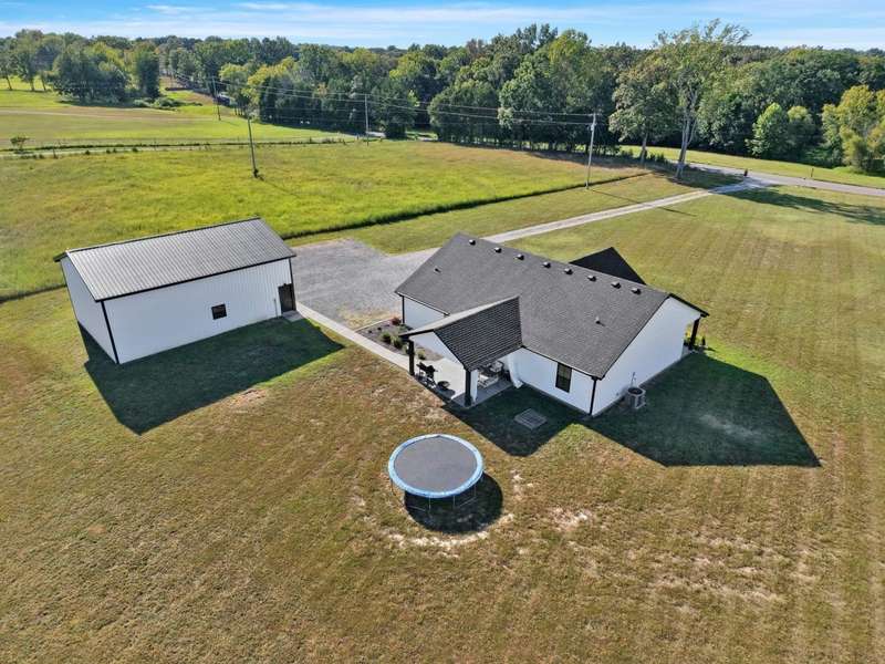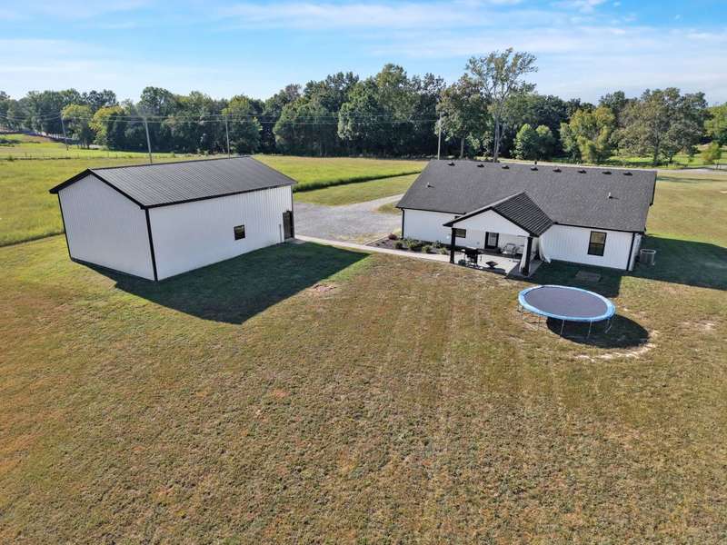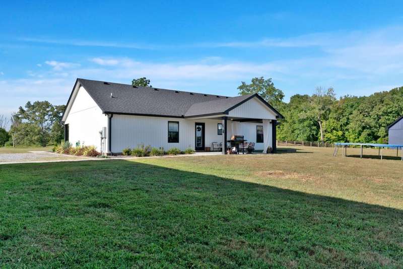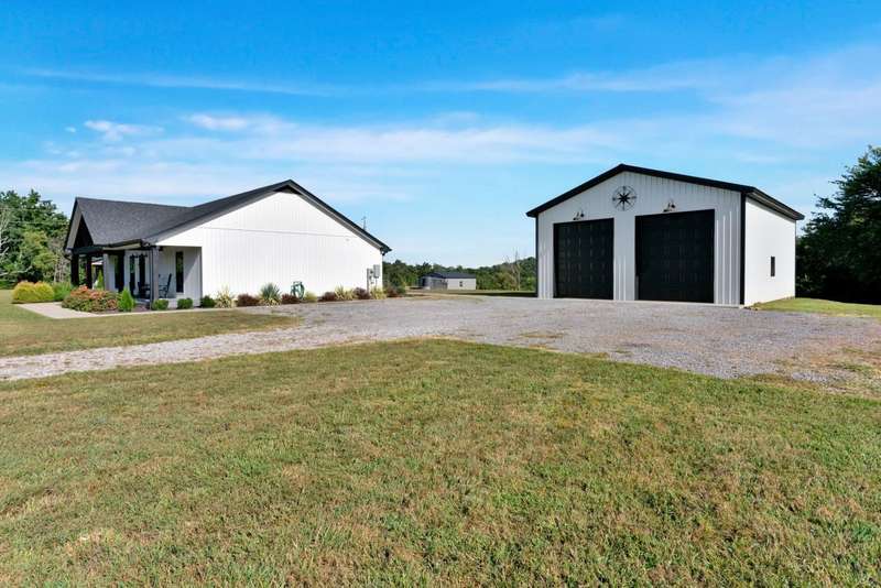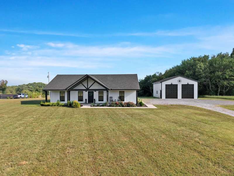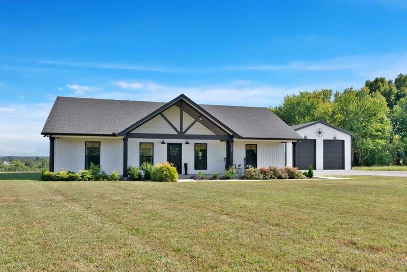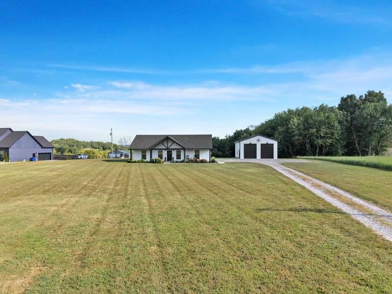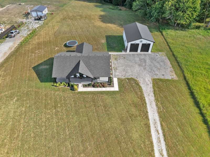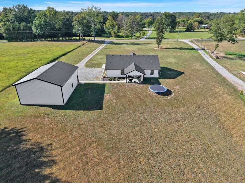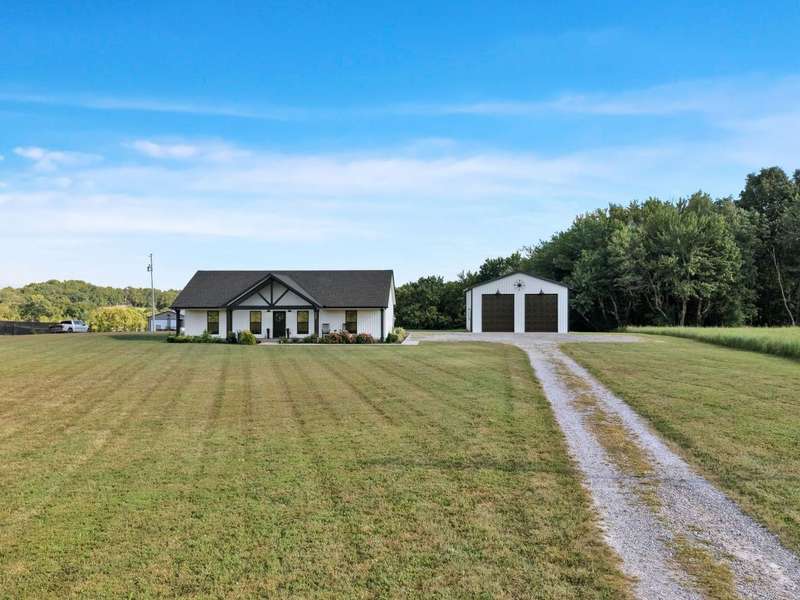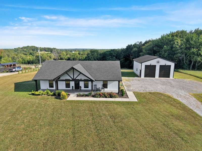 Welcome to this stunning 2021-built farmhouse-style home nestled on 5.25 serene acres, offering the perfect blend of modern comfort and country charm. Featuring 3 spacious bedrooms and 2 full baths, this home offers an open floor plan that invites natural light and effortless flow-ideal for everyday living and entertaining.The thoughtfully designed split-bedroom layout provides privacy with the spacious primary suite located opposite the secondary bedrooms. The primary retreat includes a full bath with double vanities and a walk-in closet.Enjoy peaceful mornings on the inviting covered front porch, and host unforgettable gatherings on the stamped concrete back patio-both adorned with beautiful wood ceilings that elevate the home's rustic elegance.Need room for your hobbies, tools, or toys? You'll love the 30x40 detached shop, complete with two 12-foot doors, soaring 14-foot ceilings, and 220-volt electrical service-perfect for a workshop, RV storage, or home business.Whether you're looking for wide open space, a quiet escape, or a place to pursue your passions, this property delivers. Don't miss your chance to own this rare combination of land, style, and functionality! Curtains do not remain. Professional pictures coming soon