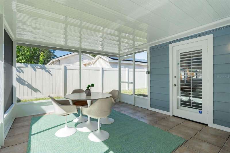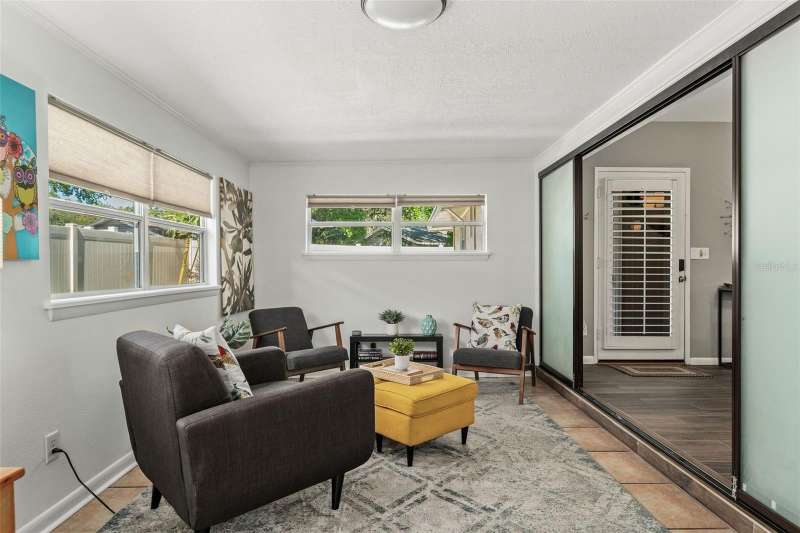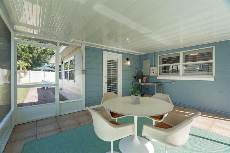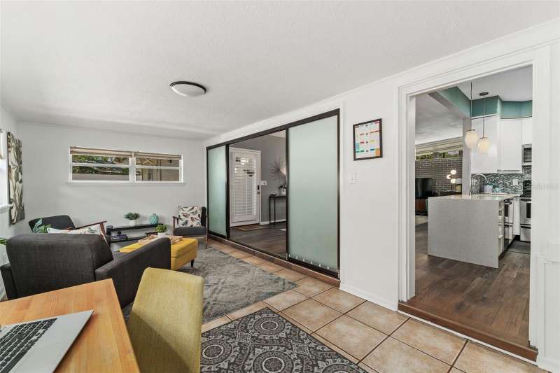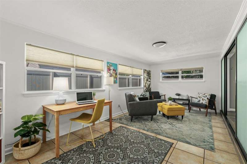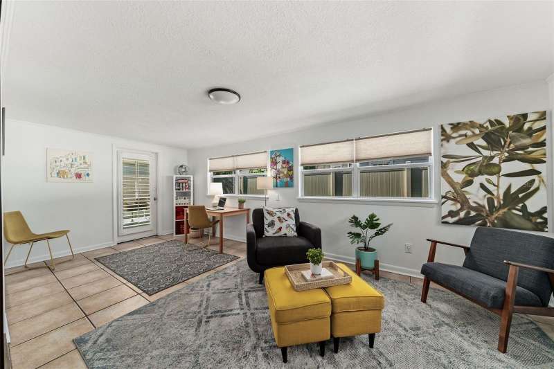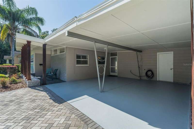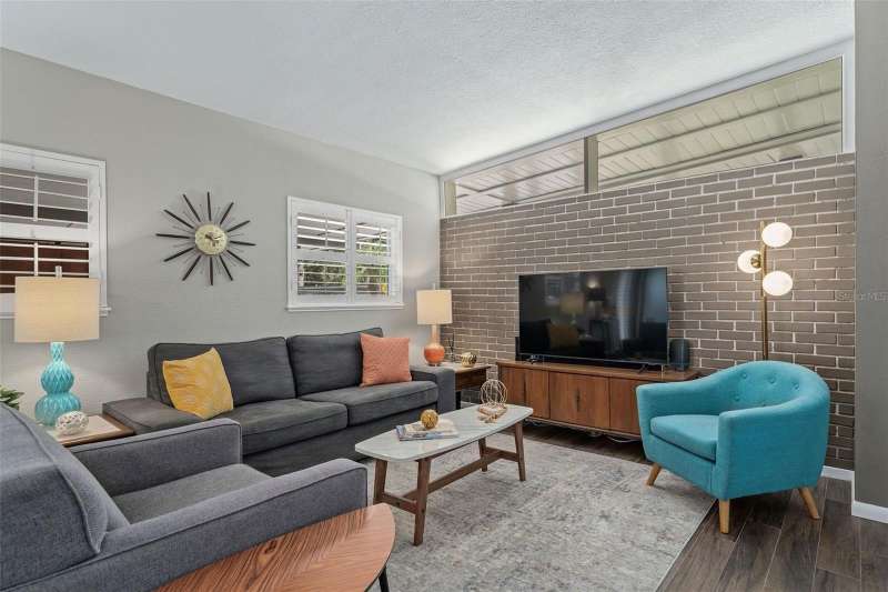 Under contract-accepting backup offers. Stylish Mid-Century Gem Tucked away on a quiet, tree-lined street, this beautifully updated Mid-Century home blends timeless design with fresh improvements, creating a space that feels modern, bright & effortlessly livable. Step inside to discover open living & dining areas filled with character and architectural charm — from the signature brick accent wall and clerestory windows that flood the space with natural light, to the newer wood grain tile flooring & era-appropriate lighting that perfectly complements the home’s design. The transformed kitchen is a showpiece — thoughtfully redesigned with sleek cabinetry, abundant storage, integrated illumination including under-cabinet, interior cabinet & drawer lighting, quartz countertops, a generous peninsula, and a stunning mosaic backsplash that ties it all together. An expansive bonus Florida room offers flexible space ideal for a home office, creative studio, or cozy den. Two spacious bedrooms feature plantation shutters & plush carpeting for comfort and warmth. The beautifully renovated bath blends charm with modern design. An oversized vanity with a marble countertop adds elegance and generous storage, while the tub and shower feature a striking full-height tile surround and upgraded fixtures like an added hand-held shower wand that create a spa-like feel. Designer floor tile and retro inspired lighting complete the look—fresh, inviting, and effortlessly sophisticated. Walk out the back door to the brand-new screened-in porch — the perfect spot for morning coffee or relaxed evening dining — overlooking the fenced backyard with new vinyl privacy fencing & a back patio for entertaining. Perfectly positioned, the laundry room brings comfort and convenience to daily living. Additional highlights include a brand-new 2025 roof, two-car covered carport, a freshly landscaped front yard and charming porch that nods to the home’s Mid-Century heritage. Immaculate, inviting & move-in ready — this home perfectly captures easy Florida living with a stylish, modern twist.