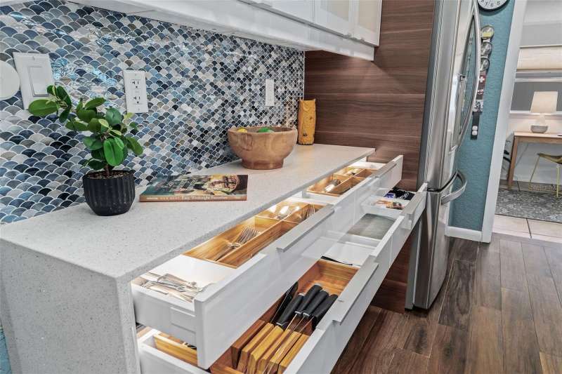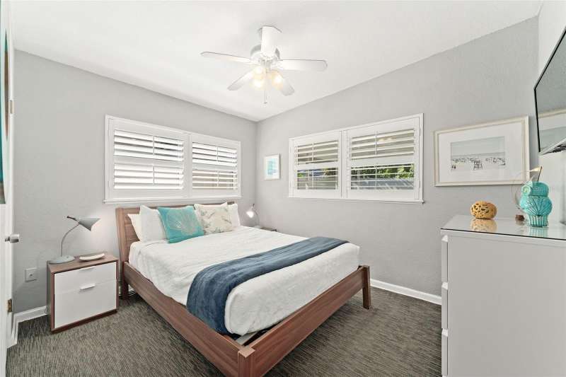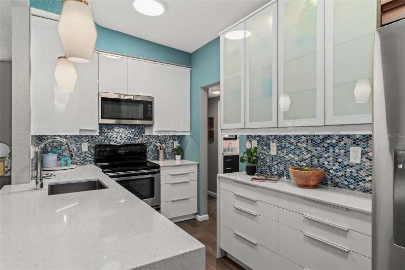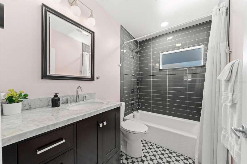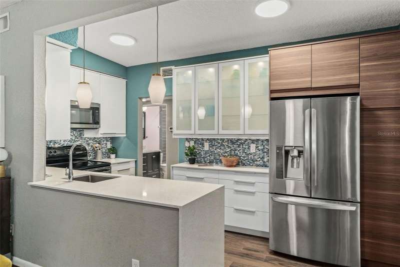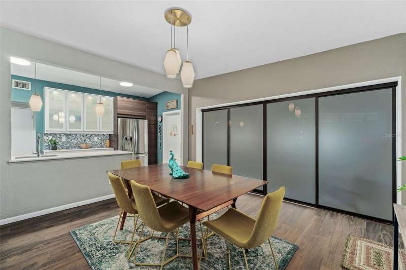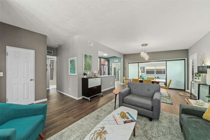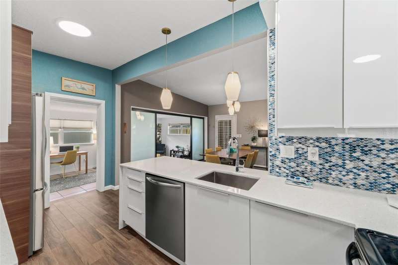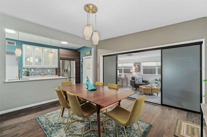 Under contract-accepting backup offers. Stylish Mid-Century Gem Tucked away on a quiet, tree-lined street, this beautifully updated Mid-Century home blends timeless design with fresh improvements, creating a space that feels modern, bright & effortlessly livable. Step inside to discover open living & dining areas filled with character and architectural charm — from the signature brick accent wall and clerestory windows that flood the space with natural light, to the newer wood grain tile flooring & era-appropriate lighting that perfectly complements the home’s design. The transformed kitchen is a showpiece — thoughtfully redesigned with sleek cabinetry, abundant storage, integrated illumination including under-cabinet, interior cabinet & drawer lighting, quartz countertops, a generous peninsula, and a stunning mosaic backsplash that ties it all together. An expansive bonus Florida room offers flexible space ideal for a home office, creative studio, or cozy den. Two spacious bedrooms feature plantation shutters & plush carpeting for comfort and warmth. The beautifully renovated bath blends charm with modern design. An oversized vanity with a marble countertop adds elegance and generous storage, while the tub and shower feature a striking full-height tile surround and upgraded fixtures like an added hand-held shower wand that create a spa-like feel. Designer floor tile and retro inspired lighting complete the look—fresh, inviting, and effortlessly sophisticated. Walk out the back door to the brand-new screened-in porch — the perfect spot for morning coffee or relaxed evening dining — overlooking the fenced backyard with new vinyl privacy fencing & a back patio for entertaining. Perfectly positioned, the laundry room brings comfort and convenience to daily living. Additional highlights include a brand-new 2025 roof, two-car covered carport, a freshly landscaped front yard and charming porch that nods to the home’s Mid-Century heritage. Immaculate, inviting & move-in ready — this home perfectly captures easy Florida living with a stylish, modern twist.