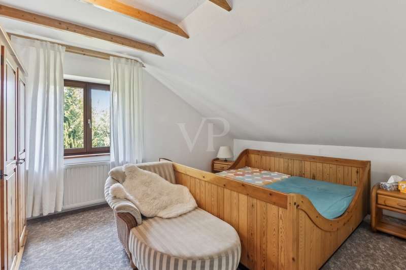 VON POLL IMMOBILIEN Zweibrücken presents this charming, solidly built country house with granny apartment in a wonderfully quiet location on the outskirts of Battweiler, just a few minutes from Zweibrücken. With a living space of around 210 m², spread over two floors and a mezzanine, the house offers generous space for families, multi-generational living or a combination of living and working under one roof. Built in 1982, the house impresses with its well thought-out room layout with two separate living units, each with its own kitchen and bathroom. On the first floor, handmade terracotta tiles and high-quality built-in cupboards emphasize the rustic character of the house. The existing fitted kitchen is functional and in good condition - as is the kitchen in the granny apartment on the upper floor. A stair lift provides barrier-free access from the garage area to the first floor, where there is also a disabled-friendly bathroom. Comfortable warmth is provided by oil central heating from 2002 and underfloor heating on the ground floor and mezzanine. In the living room, a brick-built stove provides additional warmth and a pleasant living atmosphere - with the option of heating the first floor with wood. The building, which has a basement, has a large garage and carport and therefore offers plenty of space for vehicles and storage. The approx. 1,350 m² well-kept plot is surrounded by natural vegetation and offers pleasant privacy. A garden shed and a greenhouse extend the potential uses for gardening enthusiasts and self-caterers. This house combines peaceful living close to nature with well thought-out features and plenty of space - a rare opportunity for anyone who wants to combine country living with comfort. See for yourself and arrange a personal viewing appointment now. We will be happy to send you further information such as the exact location, floor plans and further photos by email or answer your initial questions in advance at an appointment in our store in Zweibrücken, Homburger Str. 40.