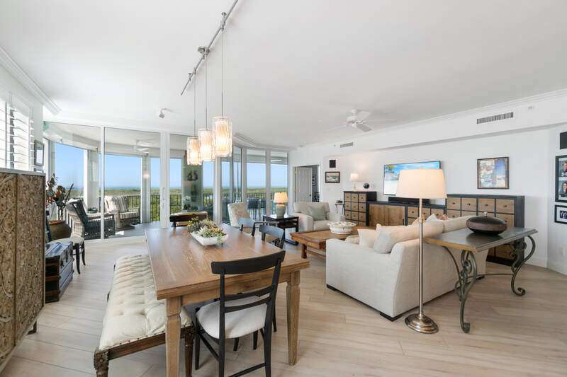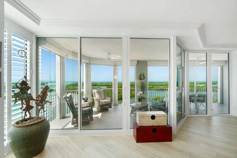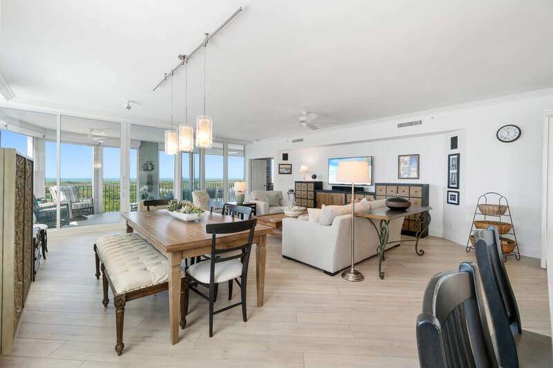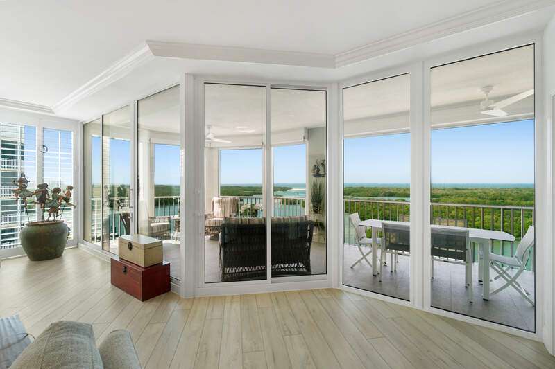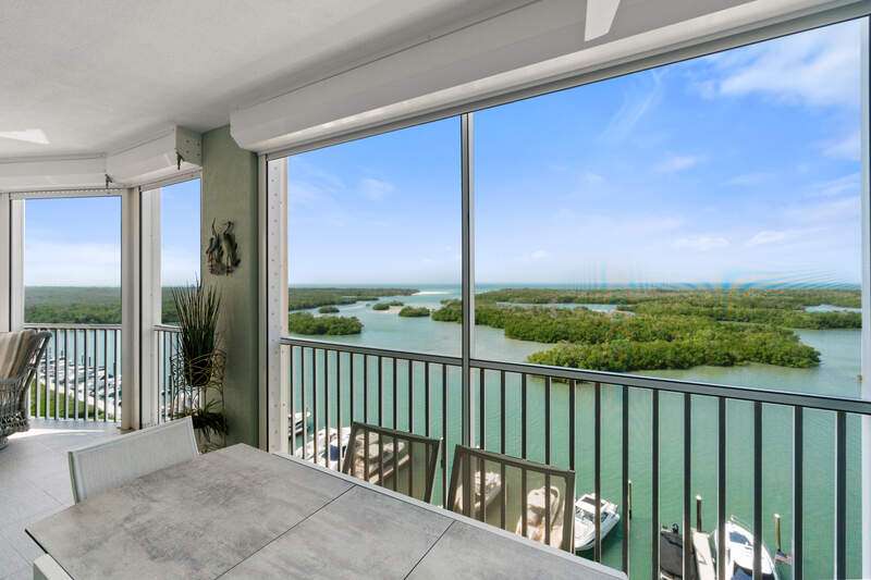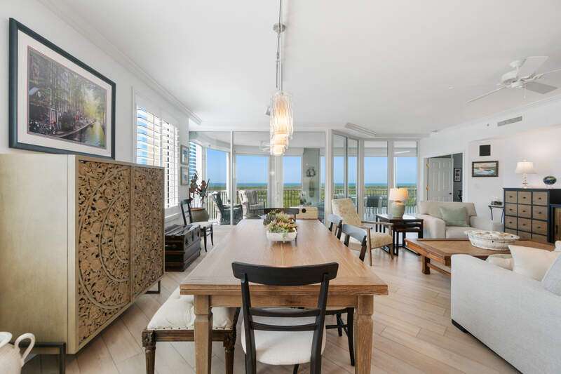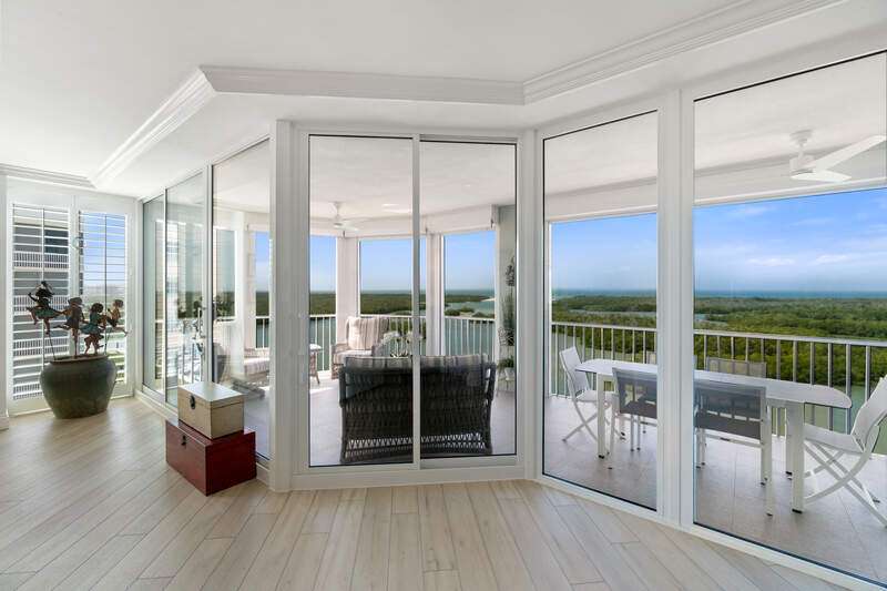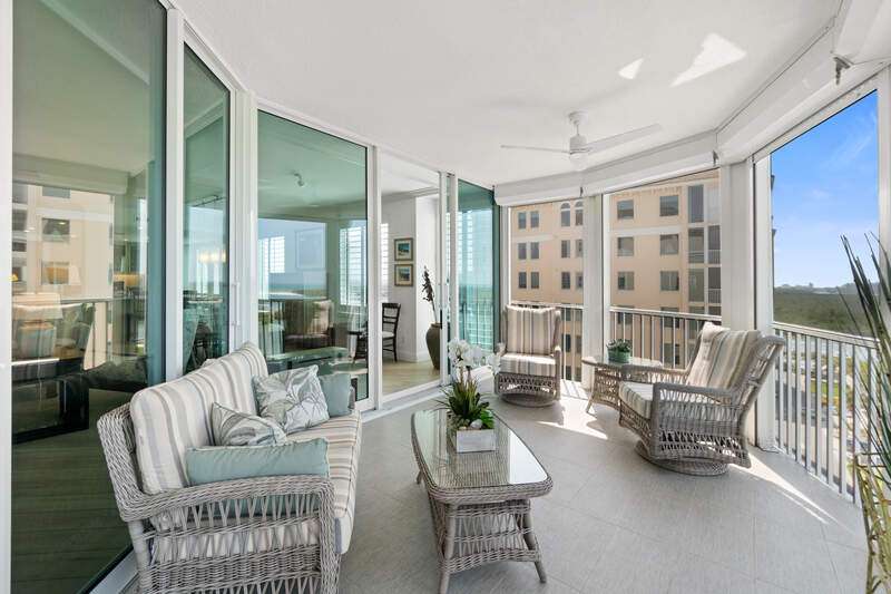 Beautifully remodeled coastal contemporary 9th floor END-UNIT offering spectacular views of the Bay and Gulf, located in the highly sought-after Pelican Isle. Indulge in breathtaking sunsets from the comfort of your spacious waterfront lanai. This property is a true paradise for beach and boating enthusiasts, situated on Wiggins Pass with direct Gulf-access and no bridges. Pelican Isle provides boat slips and lifts for vessels up to 55 feet, as well as a convenient beach shuttle for easy access to the shore (multiple slips currently available!) This unit has been meticulously upgraded with hurricane impact windows, electric hurricane shutters, new HVACs (2018), new water heater (2017), Sonos sound system, water wood and tile flooring, and a light and bright interior. Enjoy extraordinary natural light courtesy of the extra windows, only available in a rare end-unit. This exquisite residence features 2,866 square feet of living space, including an open-concept floor plan, 3 spacious bedrooms, a den, 3.5 bathrooms, and a beautifully remodeled kitchen. The chef's kitchen boasts white quartz waterfall countertops, light cabinetry, Everpure water filtration system, and high-end appliances including a Sub-Zero refrigerator, Wolf wall oven, steam oven and induction cooktop, and Bosch dishwasher. The spacious primary suite offers mesmerizing water views and a spa-like bathroom with dual vanities, a large walk-in shower, and a separate jetted soaking tub. Relax and unwind on your screened-in lanai, where you can enjoy the natural beauty of Southwest Florida, from the diverse wildlife to the dolphins and manatees gliding through the bay. Pelican Isle has a separate private Yacht Club membership available, ranked as one of the Top 50 Platinum Yacht Clubs in the world, granting access to endless boating opportunities, fine dining, fitness facilities, social activities, tennis, pickleball, and bocce courts. Residents also enjoy two pools with spas, a bike storage area, air-conditioned personal storage units, and secure, gated entry with 24/7 camera surveillance. The condo comes with assigned covered parking, guest parking, and a car wash area, as well as a newly renovated lobby and hallways. Located just minutes from Southwest Florida's finest beaches-Vanderbilt Beach and Barefoot Beach-as well as premier shopping and dining at Mercato, Waterside Shops, and Naples' iconic 5th Avenue, this residence offers easy access to both RSW and Naples airports.