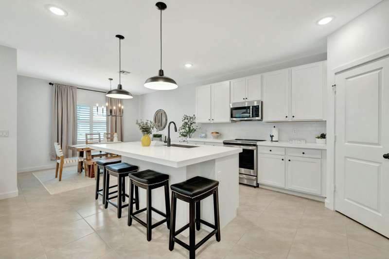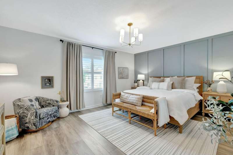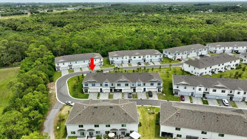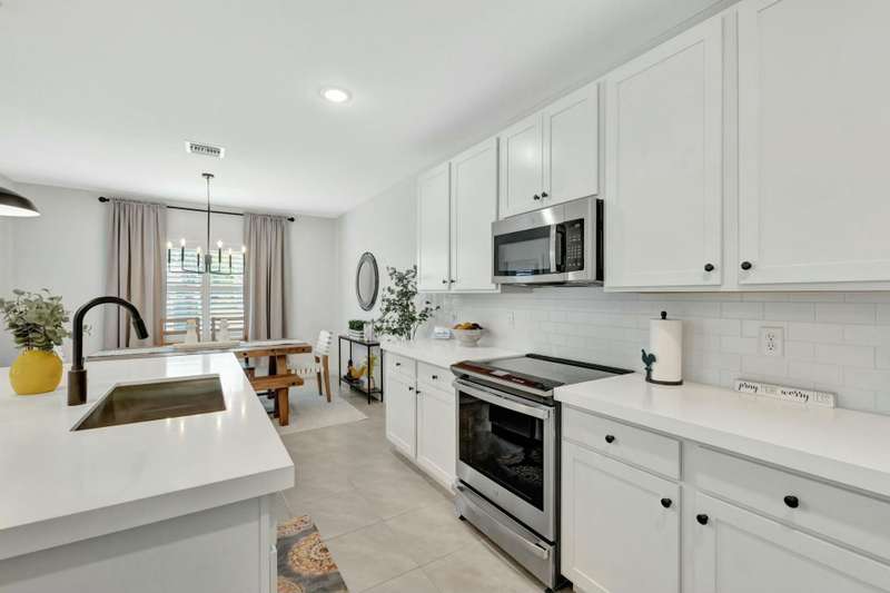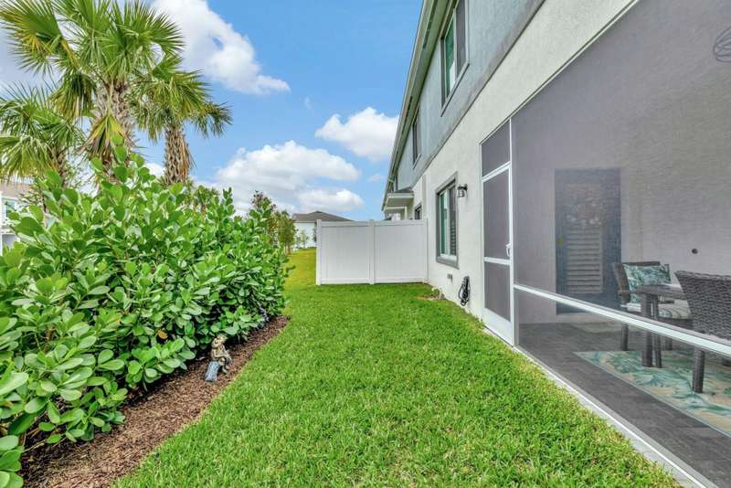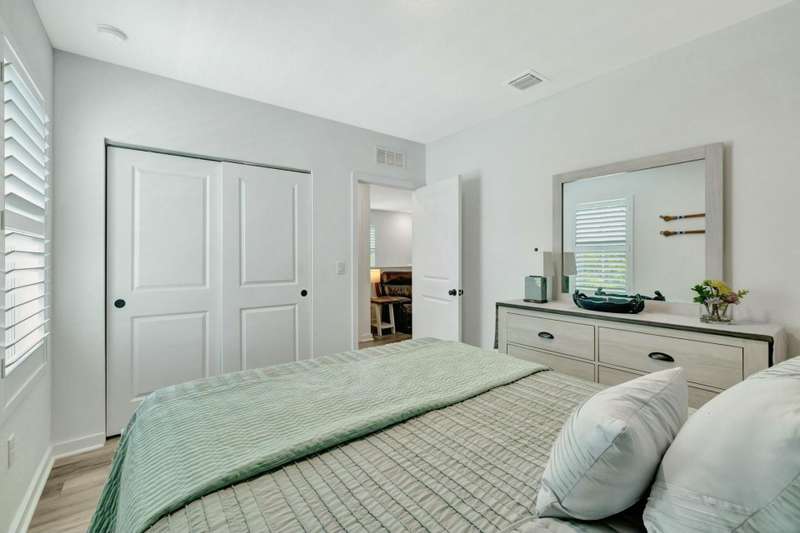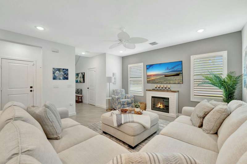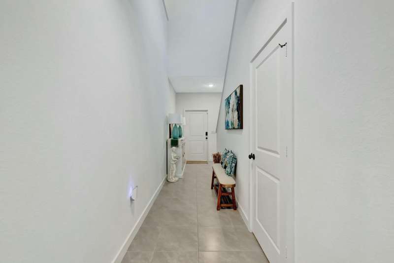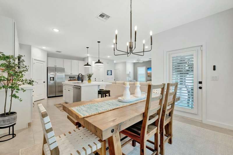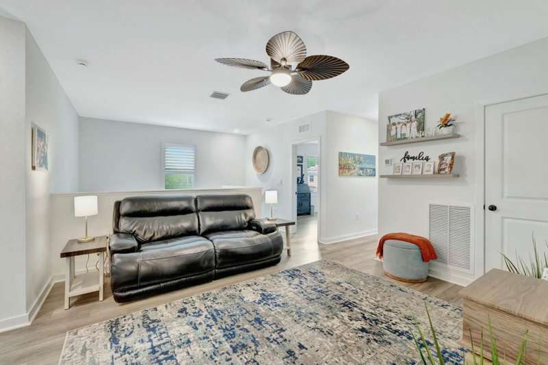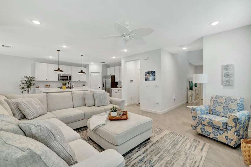 Great Beautiful 4-Bedroom, 2.5-Bath + Den Corner Unit with Farmhouse Charm! Welcome to this spacious and stylish corner unit, designed with a curated Farmhouse Design Palette and upgraded throughout for modern comfort. The home features plantation shutters on every window, engineered hardwood flooring throughout (no carpet!), and designer chandeliers, ceiling fans, and light fixtures that elevate every room. The open-concept layout is perfect for both everyday living and entertaining, with a beautifully screened-in lanai and a private patio framed by lush Clusia bushes, creating your own serene outdoor escape. Inside, enjoy 42 shaker-style cabinets, a stylish tile backsplash, and a versatile den ideal for a home office or flex space.