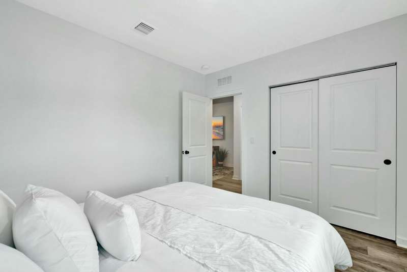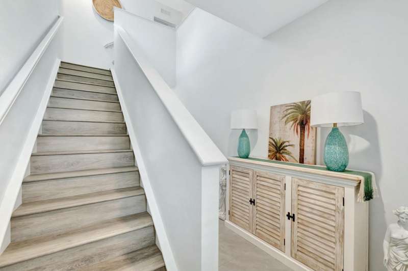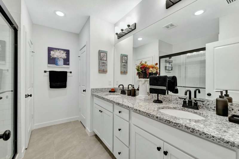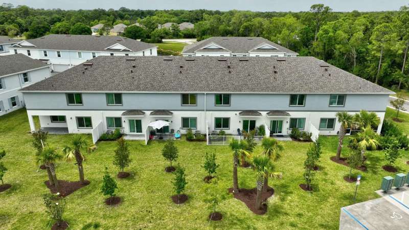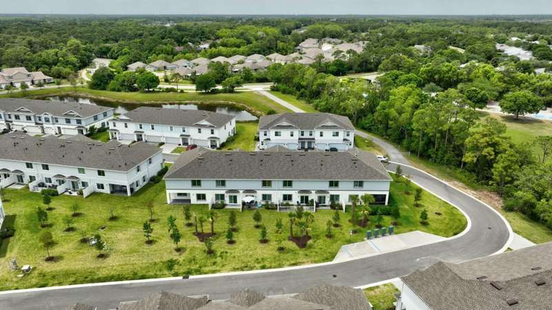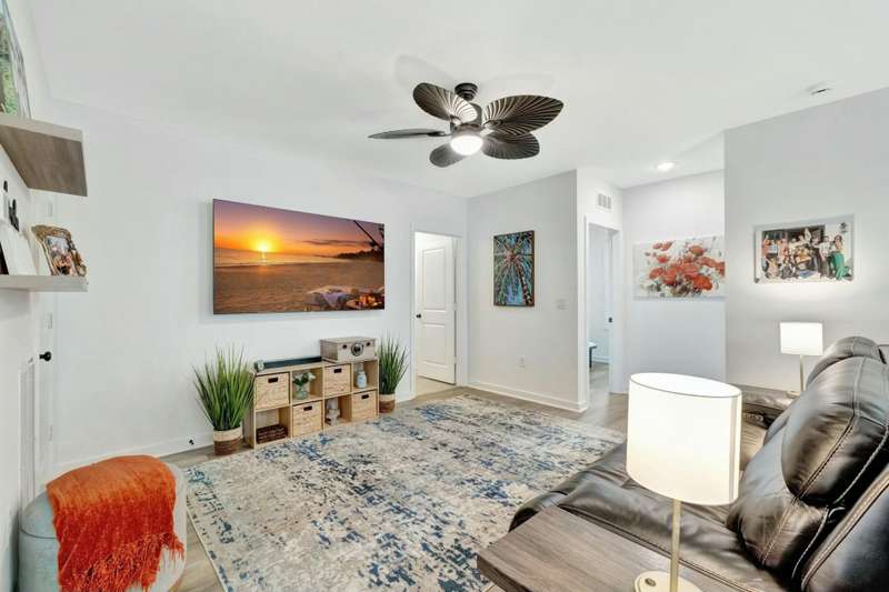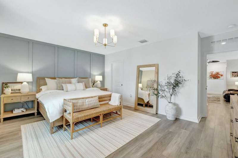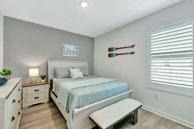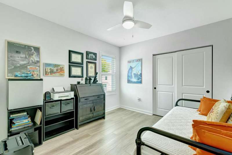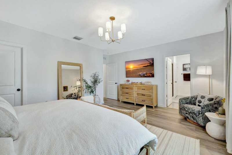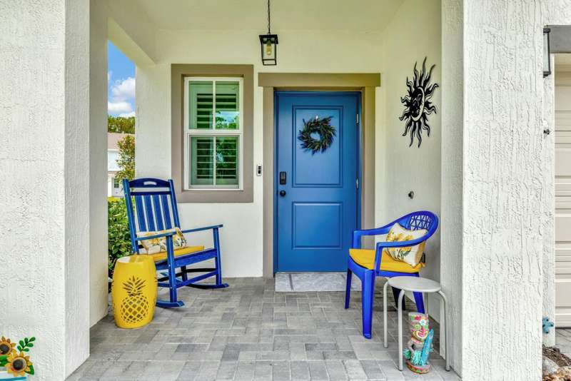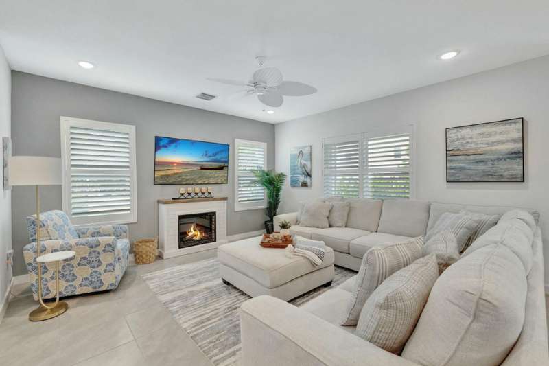 Great Beautiful 4-Bedroom, 2.5-Bath + Den Corner Unit with Farmhouse Charm! Welcome to this spacious and stylish corner unit, designed with a curated Farmhouse Design Palette and upgraded throughout for modern comfort. The home features plantation shutters on every window, engineered hardwood flooring throughout (no carpet!), and designer chandeliers, ceiling fans, and light fixtures that elevate every room. The open-concept layout is perfect for both everyday living and entertaining, with a beautifully screened-in lanai and a private patio framed by lush Clusia bushes, creating your own serene outdoor escape. Inside, enjoy 42 shaker-style cabinets, a stylish tile backsplash, and a versatile den ideal for a home office or flex space.