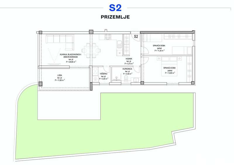 Apartment S-2 - ground floor - living area 65.25 m2 (2 bedrooms + bathroom + laundry) + loggia (12 m2) + uncovered terrace (26 m2) + garden (87 m2) + storage (3.5 m2) + two garage parking spaces (13.75 m2 x 2); net calculated area 103.48 m2 = €322,184