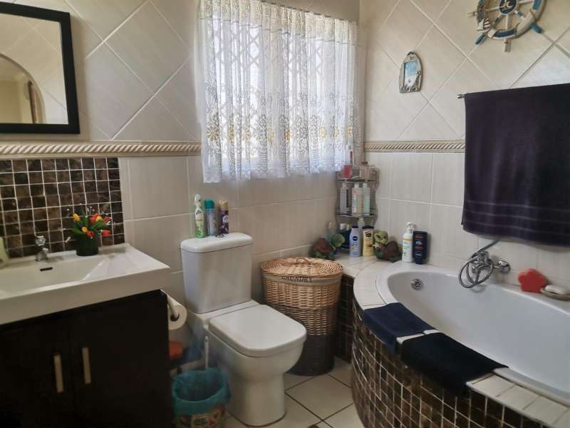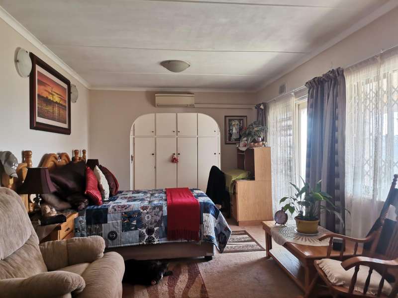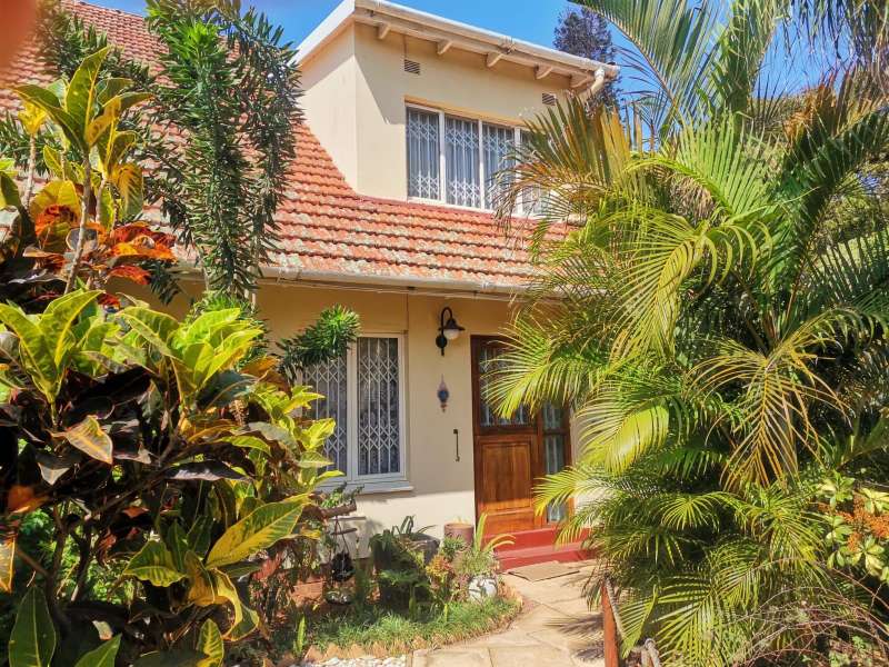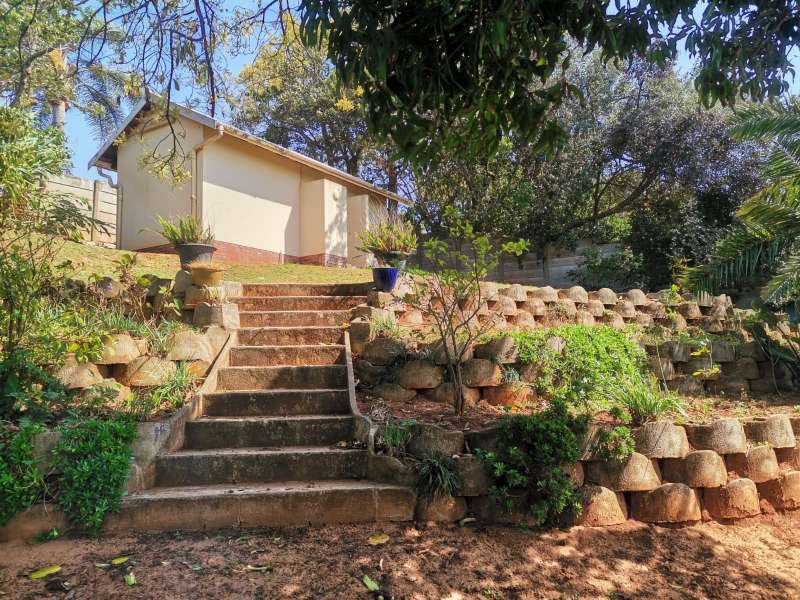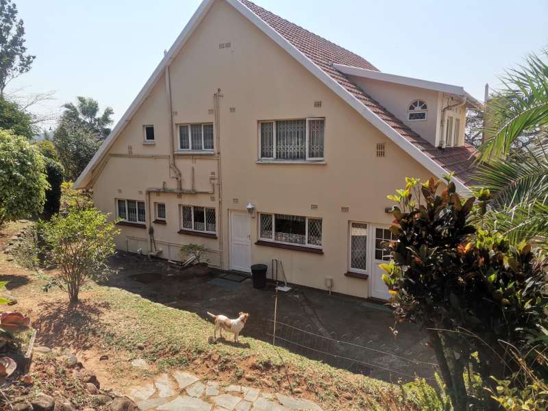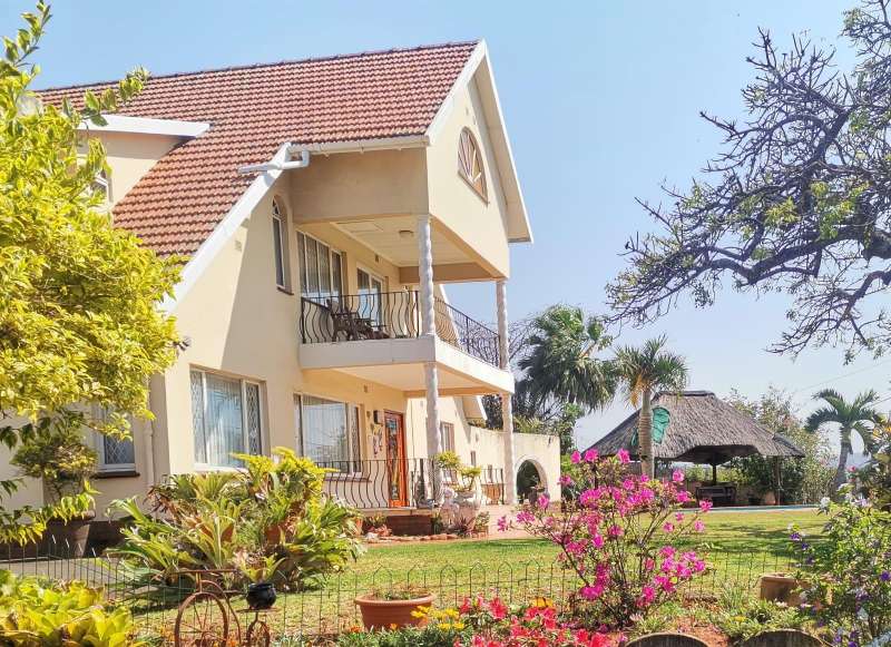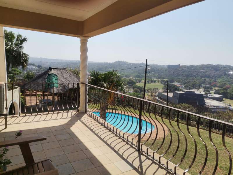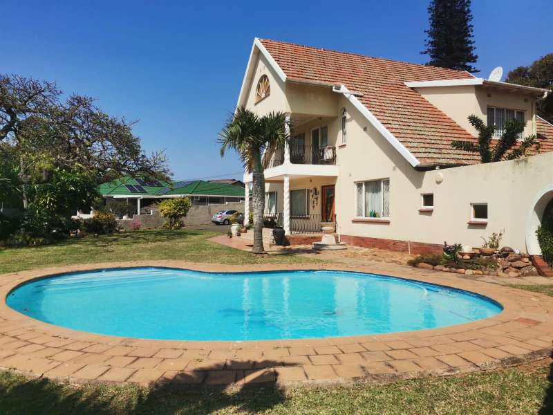 UNIQUE, MODERN HOME - 4 BEDROOMS Set on a hill overlooking Amanzimtoti and the ocean, this very Unique 'A' frame house has everything you could wish for in a home. From the moment you enter through the electric gates, the magnificence of it strikes you. At the top of the driveway, is a large turning circle and three garages and carport, the home is to the right, set in a level manicured garden, with big thatched lapa and lovely swimming pool. As you approach the house up 3 steps, you won't believe the wonderful pivot front door, with a huge lion painted on it. As you enter, to the right is a small office and then a guest bathroom and further down the passage is a lovely guest bedroom en-suite, with its own entrance. There is a double sized lounge with a separate dining room that leads to the most magnificent, granite kitchen with island and scullery. In the centre of the hallway is an imposing stairway leading up to three more king sized bedrooms, the main one is en-suite and has a big open balcony overlooking Amanzimtoti and the ocean and another study, that could easily be a fifth bedroom. There is a modern large general bathroom also on this floor. The property also includes a separate two-bedroom unit for staff members. If you are searching for something spectacular that offers modernity, comfort and style in a great location, close to beaches and all amenities, then this is for you.