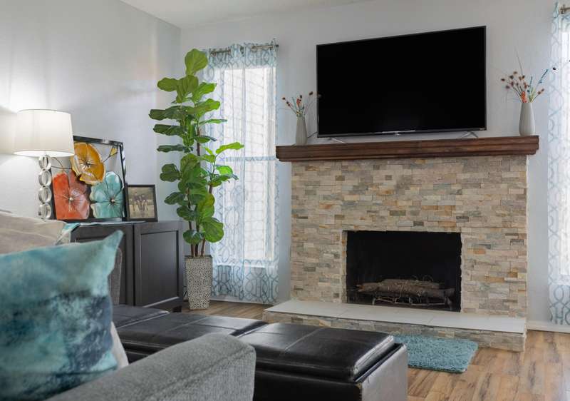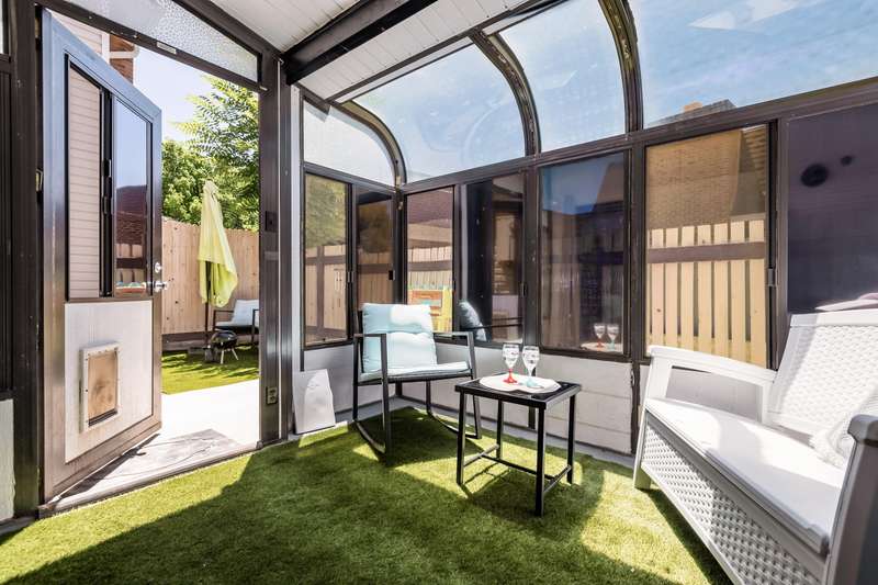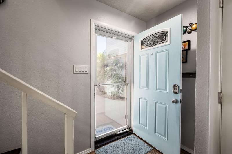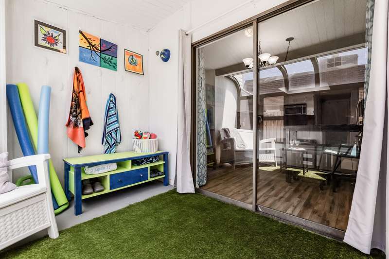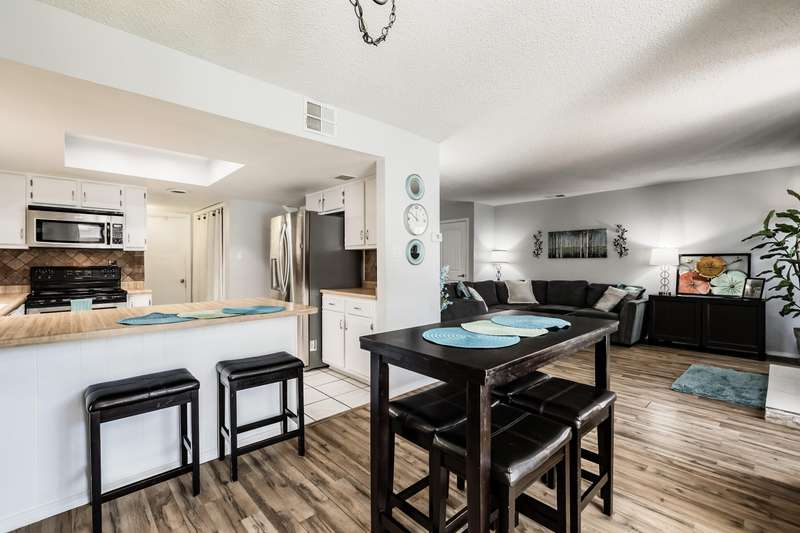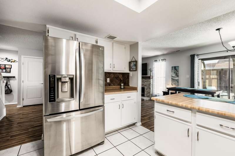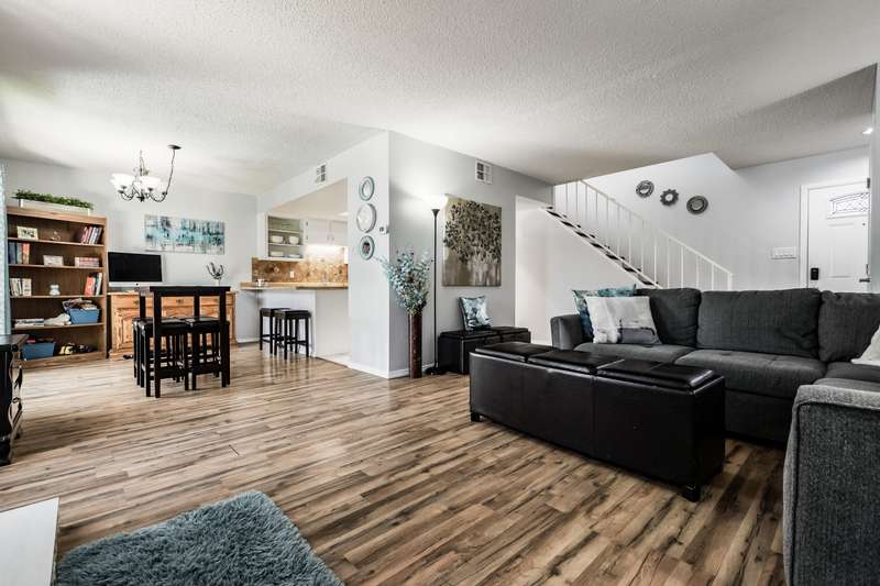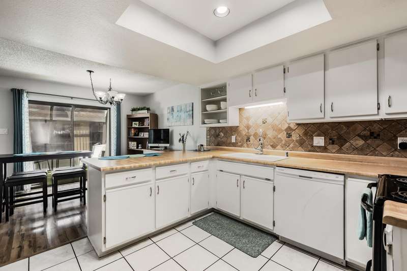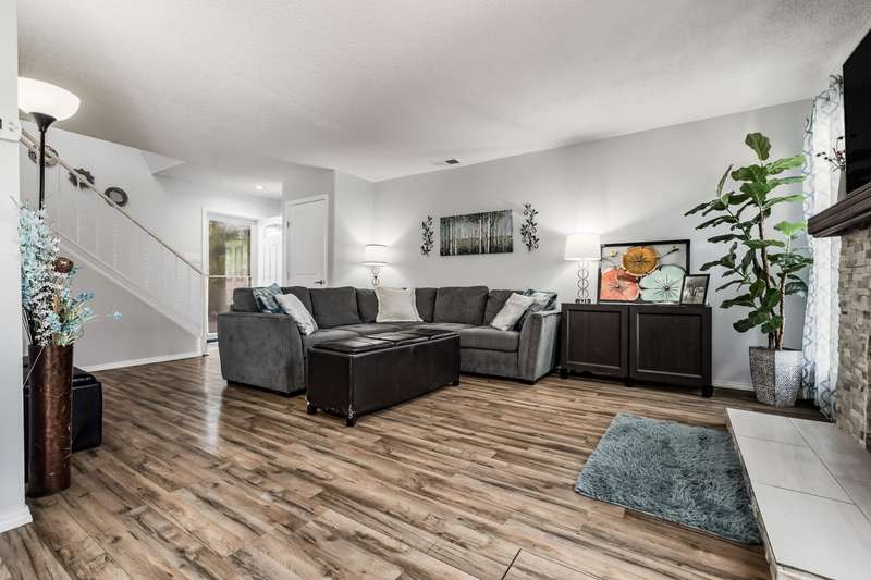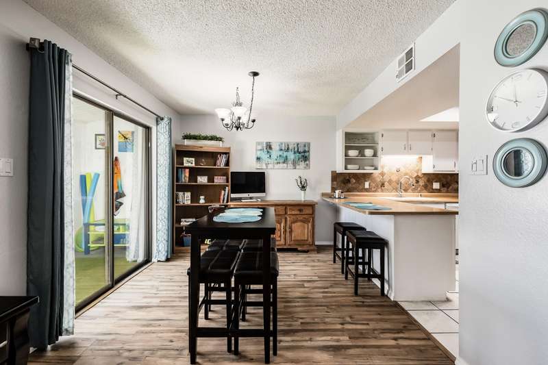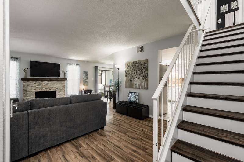 The Shores townhome community provides for a convenient lifestyle with pool, tennis courts, common area and clubhouse. This community is perfect for low maintenance--HOA covers the exterior of the residence (roof and siding) plus the sewer line, trash/water/sewer, and exterior insurance. This is an adorable property in great condition! Newly added laminate wood floors in the living and dining areas. Great open concept with cozy wood burning stacked stone fireplace, dining area w/ bar seating at the kitchen peninsula. Ample cabinet and counter space, pretty backsplash, & SS electric stove & microwave. 2 large bedrooms upstairs, the primary room has a great walk-in closet. Nice updates to the bathrooms. Great sunroom and charming yard with gate to common area. 2 car garage and AC! A gem!