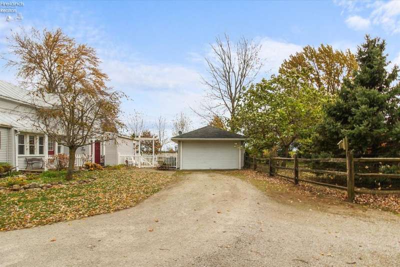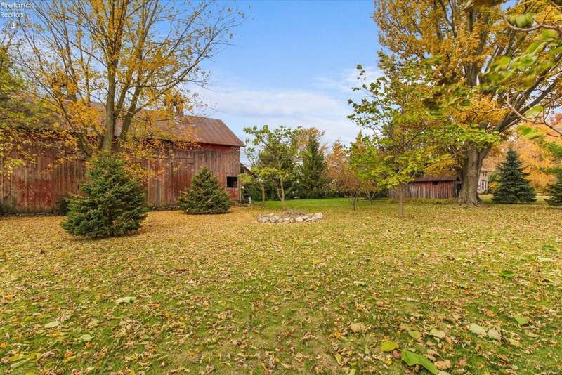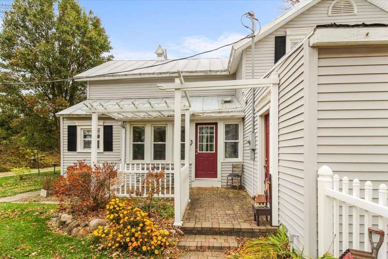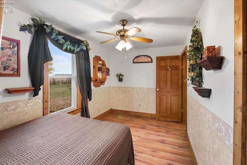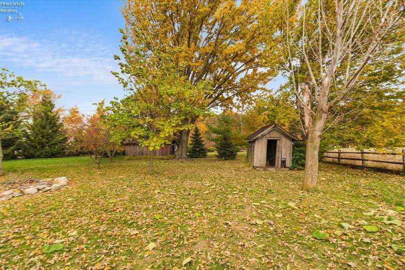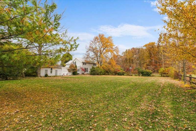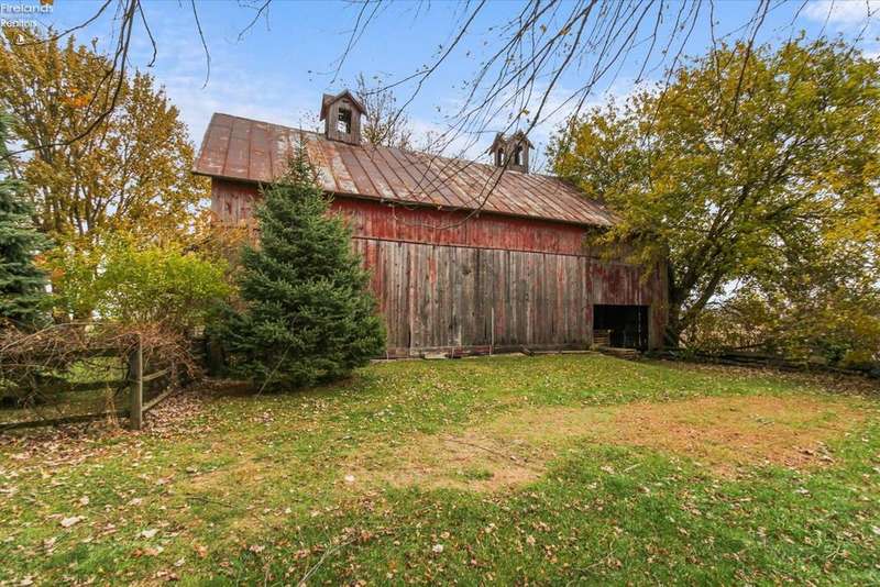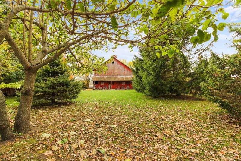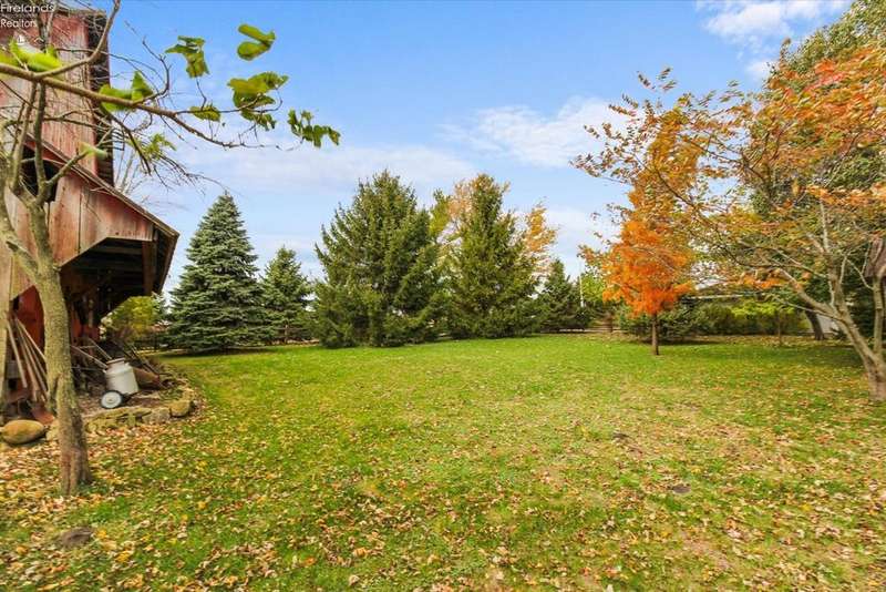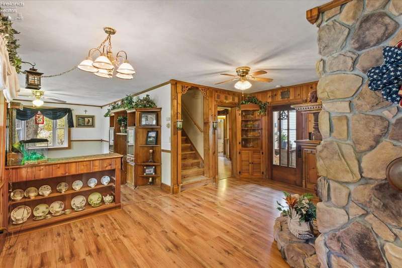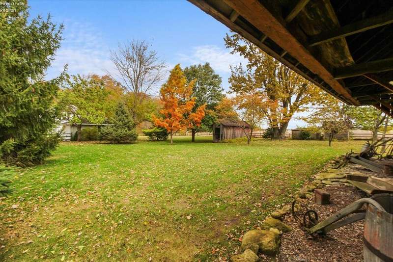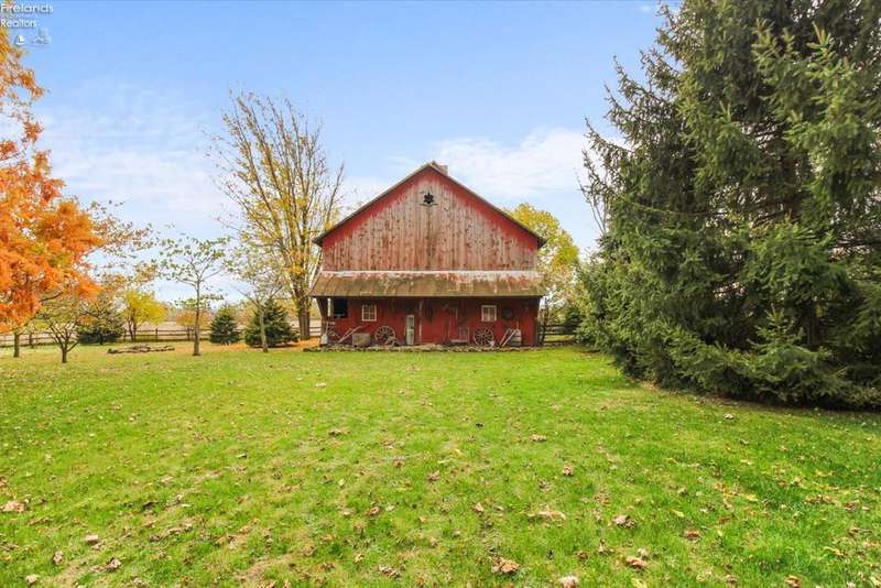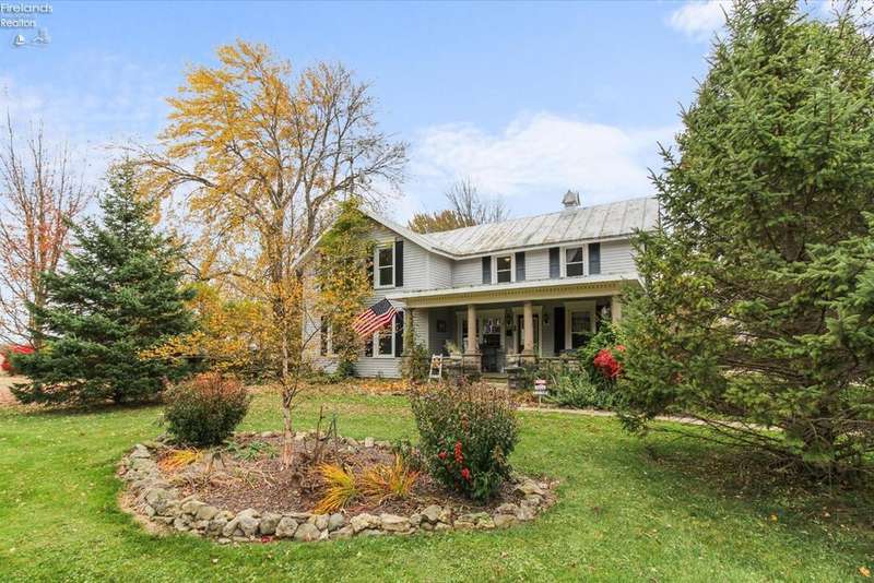 Discover your dream farmhouse in a picturesque setting! This charming 4-5 bedroom, 2 bath home boasts over 2300 sqft of living space nestled on 3.5 acres adorned with beautiful mature trees. Enjoy your morning coffee on the inviting front porch or whip up family meals in the eat-in kitchen equipped with appliances. The formal dining area features a cozy stone fireplace, perfect for gatherings. With a first-floor bedroom, laundry room, and a dedicated office space, this home is designed for convenience. The master bedroom impresses with its vaulted ceiling, while the rear patio and fenced yard offer a serene outdoor retreat. Plus, a spacious 36x56 wood barn adds to the property's charm.