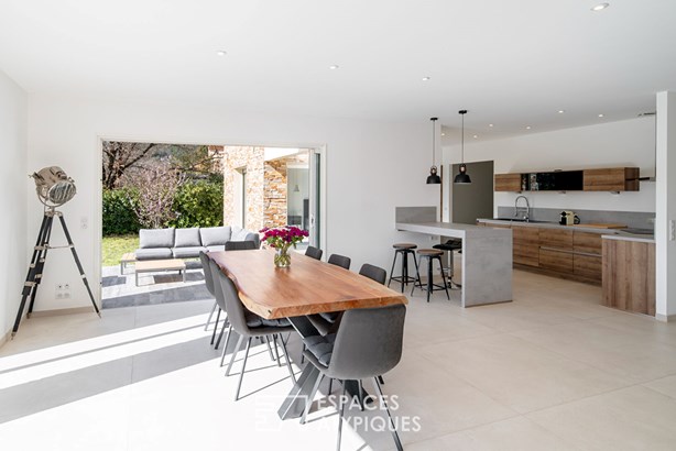 The living room of more than 80 sqm, bathed in light, plays the card of continuity. Thanks to large sliding bay windows, the boundaries between interior and exterior are erased. The living room opens onto the terrace which slides towards the swimming pool which blends into the landscape.