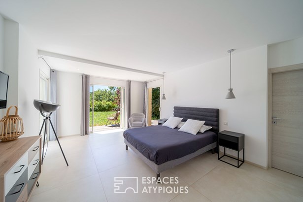 Upstairs, two independent suites each offer a private terrace, like suspended refuges facing the landscape.