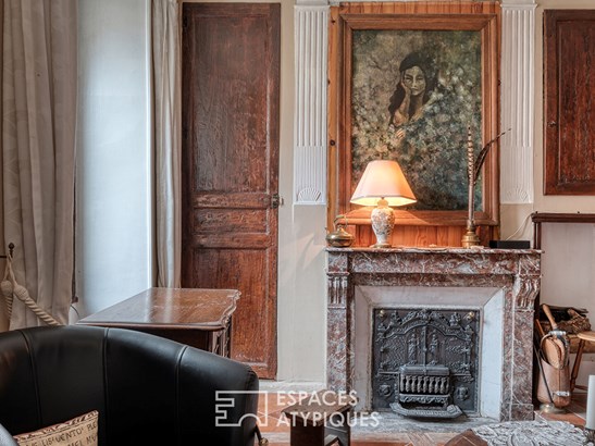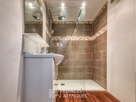 On the ground floor, a vast and inviting living area combines a lounge, dining room, open kitchen, and office space. Authentic materials and a period fireplace infuse the space with warmth and character. A laundry room and a guest bathroom complete this level.