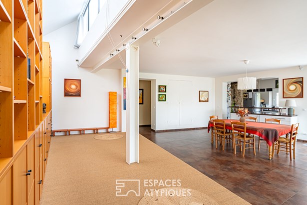 The outdoor spaces all spread over the southwest exposure of the house extend the elegance of the place and offer a panoramic view of the hill of Villennes. The garden, a true haven of peace, is divided between relaxation areas and a small wooded corner, a large natural stone terrace with soft and rounded shapes, a wooden terrace and the two outbuildings delicately leaning against the enclosed limits of walls of this incredible and rare Villennes property where historic charm and modernity intertwine to offer the exceptional on a daily basis.