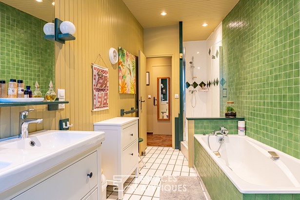 The ground floor opens onto an entrance with a restored exposed stone wall, followed by a large dressing room and guest toilet, a fitted kitchen opening onto a vast indoor-outdoor living space of 90m2; a Scandinavian wood stove, an open dining room and a library make up an elegant ensemble flooded with light in this space. Three bedrooms, two bathrooms (one with a separate shower), and another separate toilet complete this level.