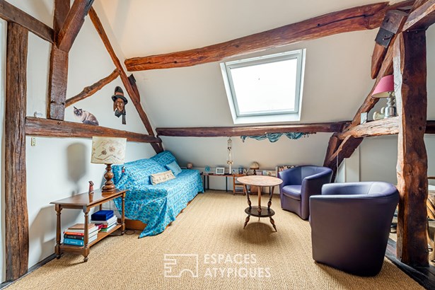 Upstairs, under a beautiful exposed truss frame, a large modular landing leads to a bathroom with toilet, large storage under the slope and three bedrooms. A full mezzanine under the farmhouse also enhances the practical life of this residence in large spaces, laundry room, storage, two separate rooms, boiler room and heated garage for a car + bicycles or motorcycles.