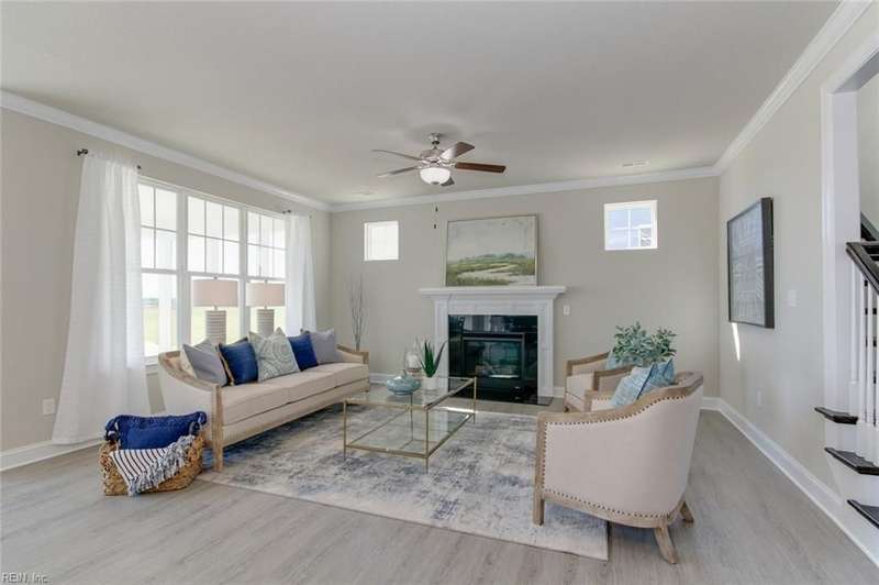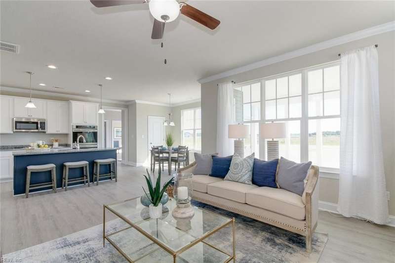 Ethans Mill II plan with 4 BR plus flex room; lots of included features like huge 29' x 8' front porch, natural gas fireplace, ceramic shower & flooring in primary bath, granite tops in kitchen and primary bath, LVT flooring most of 1st floor, double convections ovens & 4 burner gas cooktop, 7 ft kitchen island; soft close cabinet doors & drawers; approx 1/2 acre home sites