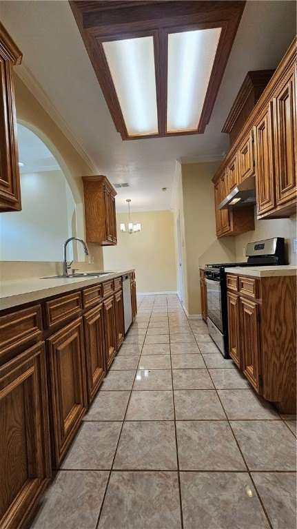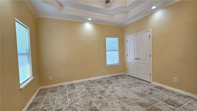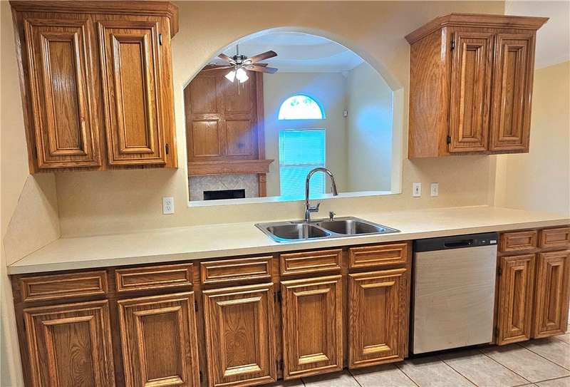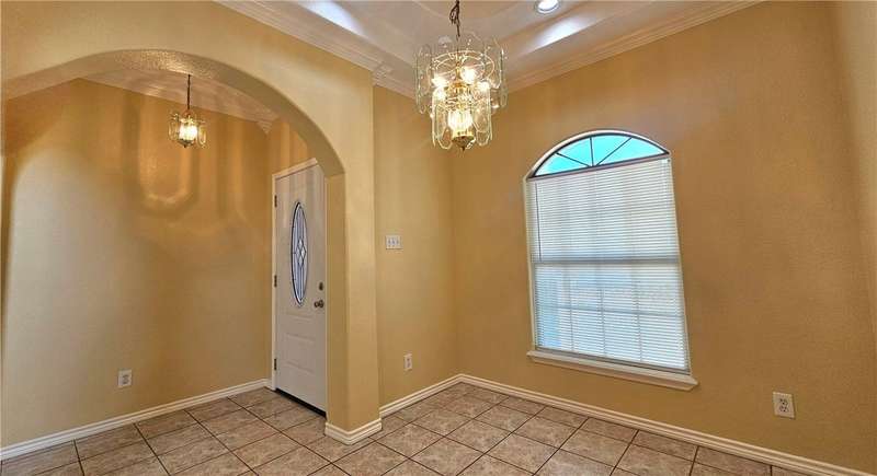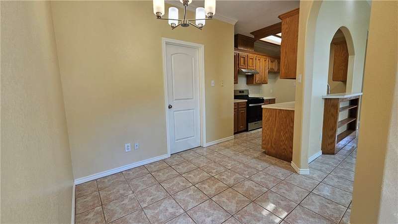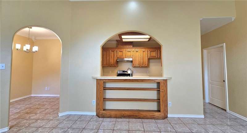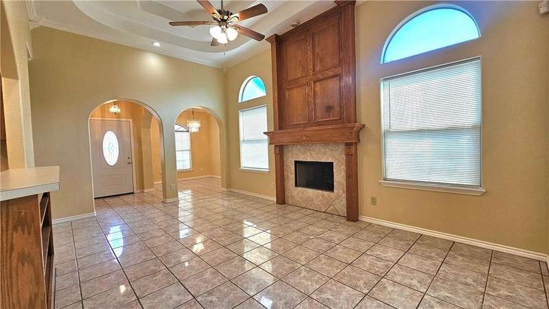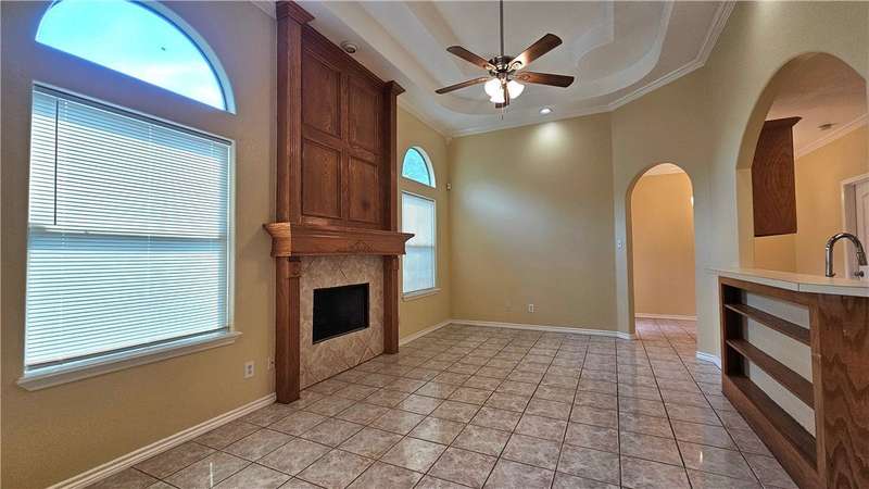 Custom oak cabinets throughout and lots of counter space are a major bonus in this 3/2/2! Double tray ceilings, crown molding and recessed lighting! Arched entries and arched windows! Built-in shelves compliment the beautifully accented fireplace! Stainless-steel with black stove dishwasher and overhead vent! An oversized laundry room located just off the garage can double as a mud room with the ample counters and cabinets. Tiled throughout! Open patio!