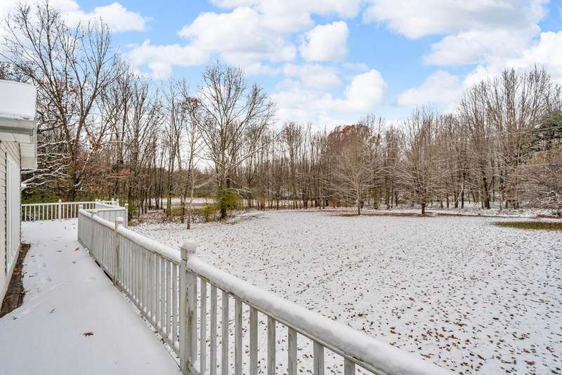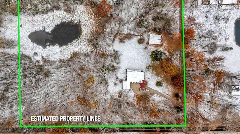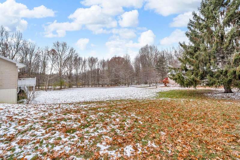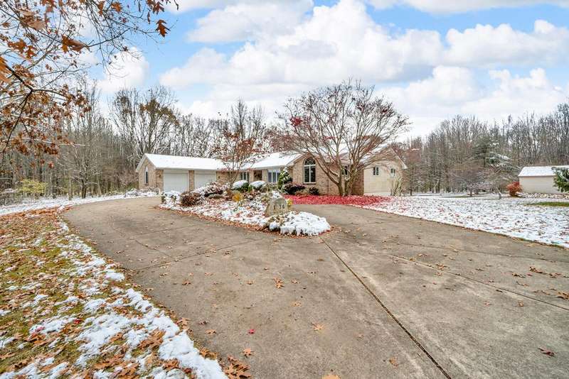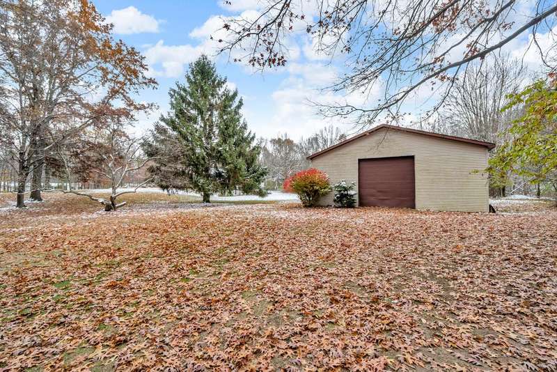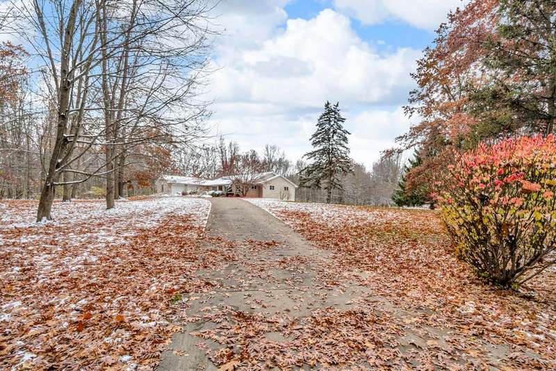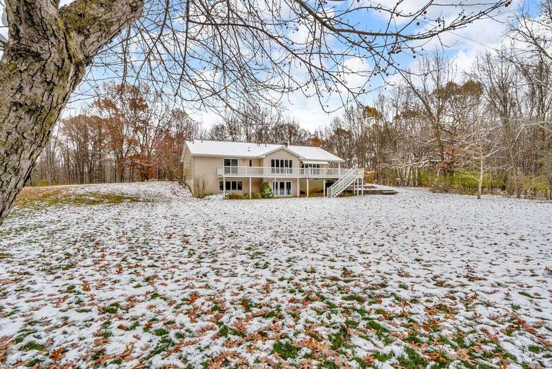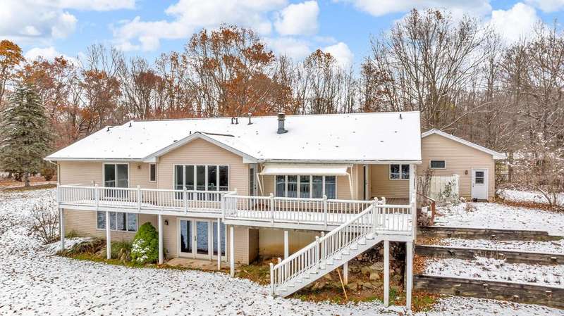 Situated on 14.75 wooded acres you will find this Pristine sprawling ranch home offering 3BR/2BA, with finished walk out lower level, a 758 sq ft attached garage w/workshop & 1728 sq ft Pole Barn in Western School District. Enter into large foyer, home office, Kitchen w/pantry & cherry cabinetry, dining room, living room w/3-sided gas fireplace. Main floor laundry, primary bedroom w/private bath and huge walk-in closet. All bedrooms have walk-in closets! Wrap around deck overlooks beautiful yard! Lower level has large family room, den, workshop, storage & utility rooms and plumbed for 3rd Bath. Anderson Casement Windows, Natural Gas, Central Air. Updates include: Roof (2019), Water Heater (2020), Furnace (2024) & Water Softener (2022).