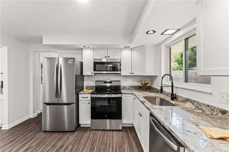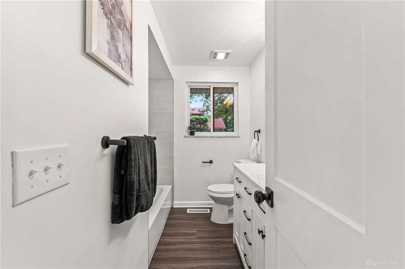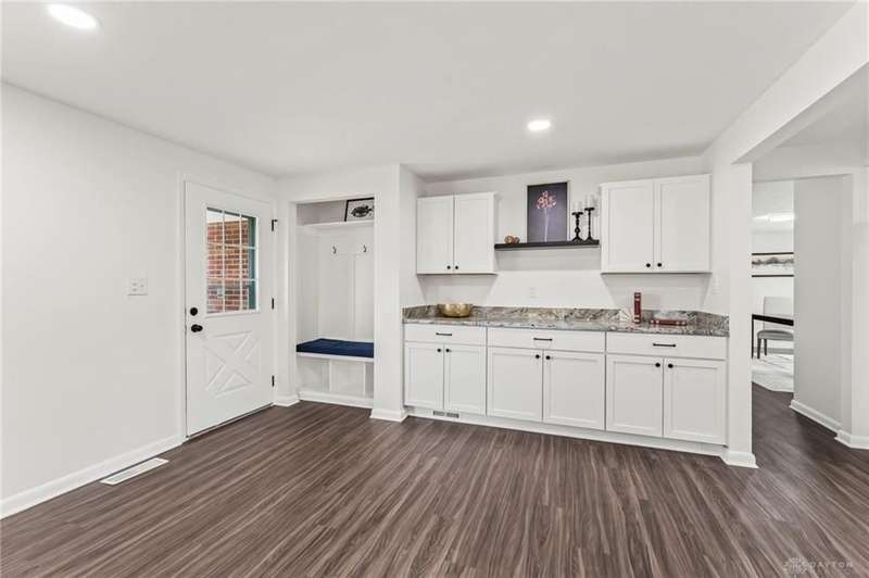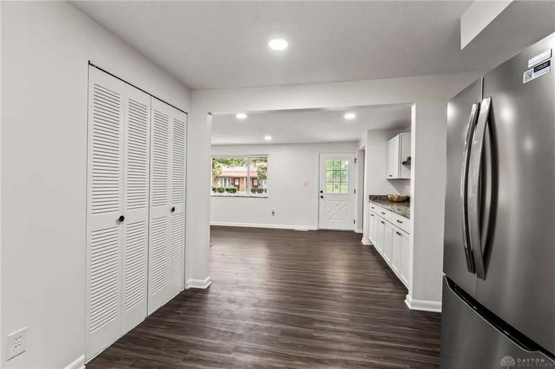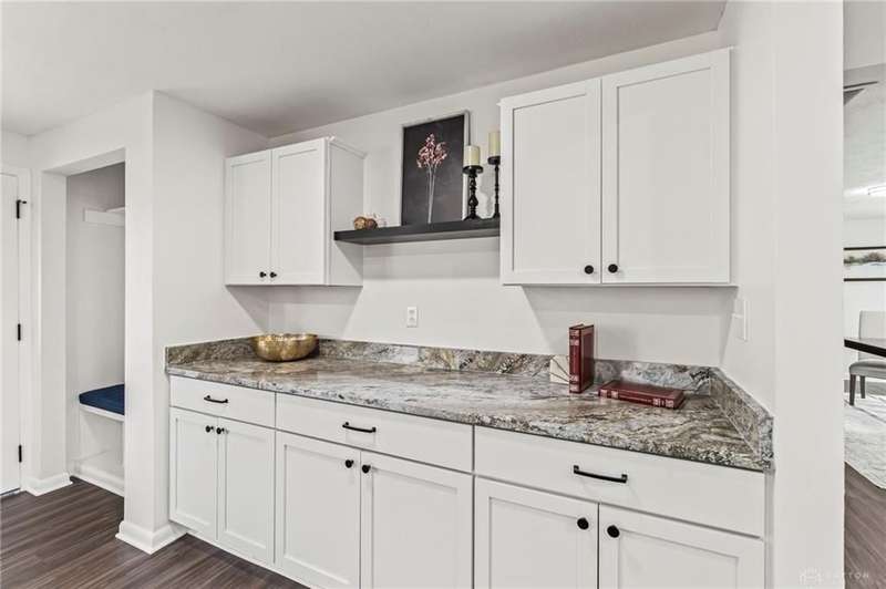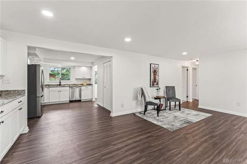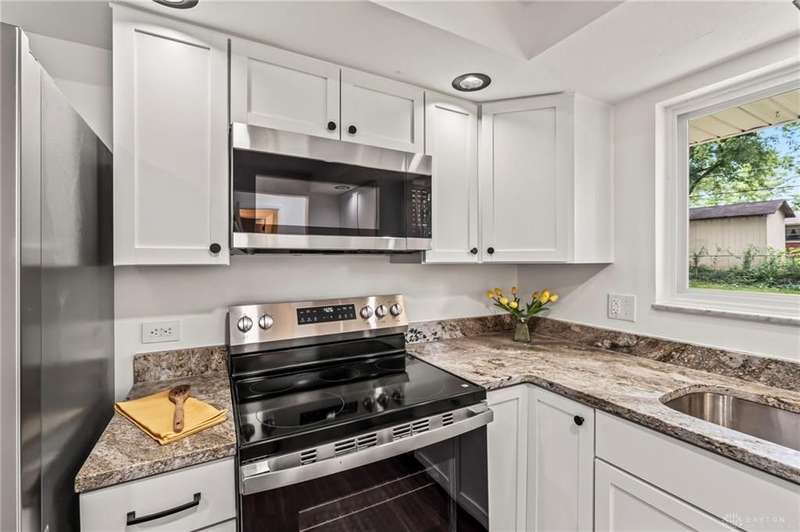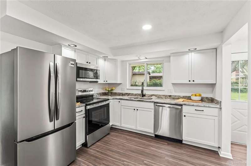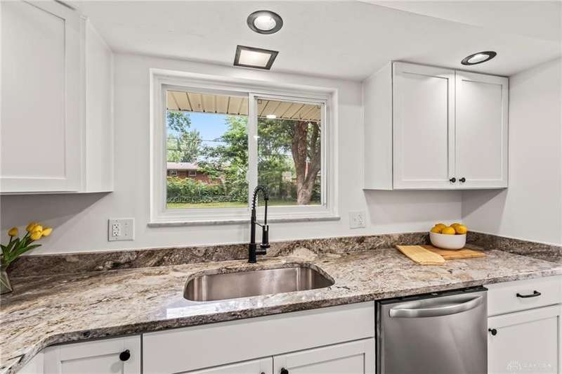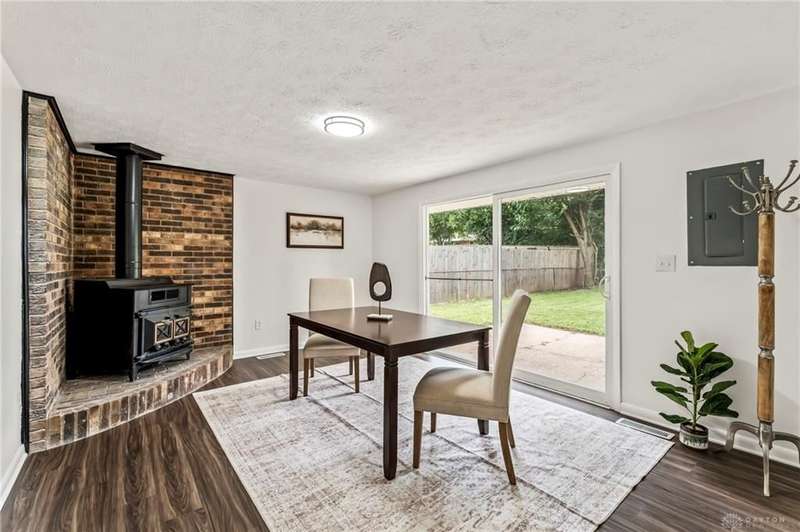 Welcome to this beautifully updated three-bedroom brick ranch in the heart of Kettering! Abundant natural light pours through the large picture window, highlighting the home's open-concept design. The spacious living room is perfect for entertaining, featuring a custom built-in hall tree with bench and cubby storage, complemented by a sprawling granite-topped dry bar that flows seamlessly into the kitchen. A true chef's delight, the kitchen boasts new shaker-style cabinetry, matching granite countertops, stainless steel appliances, and a deep single-basin sink with a picture-perfect view of the backyard. Just beyond, the family room offers a cozy wood-burning stove, laundry closet, and a new sliding glass door leading to the back patio. Enjoy the ease of single-level living with three bedrooms, an updated owner's suite half bath, and a freshly tiled full bath with dual-sink vanity. Step outside to a fenced backyard and patio, ideal for relaxing or hosting friends and family. All this, just blocks from Lincoln Park, Wenzler Park, The Fraze Pavilion, and Fairmont High School!