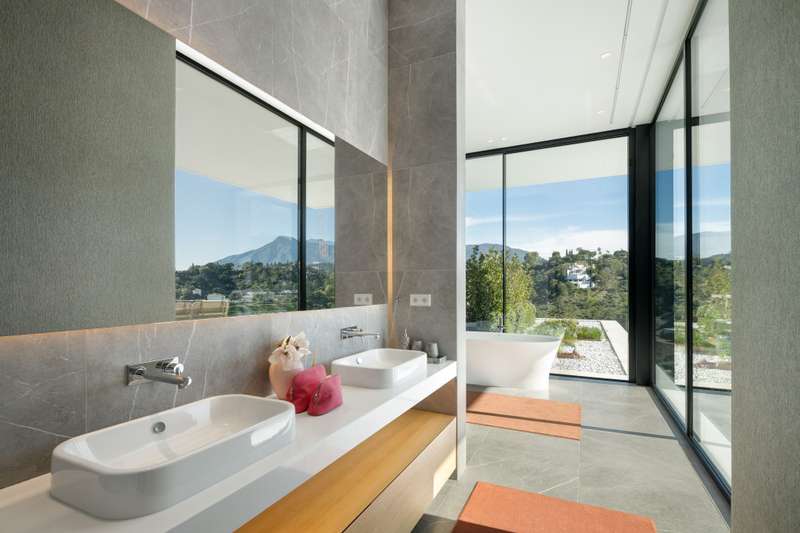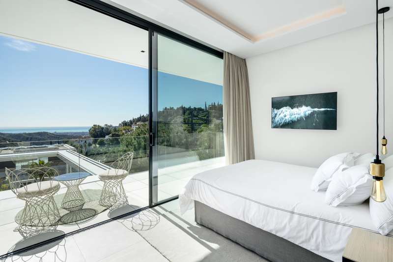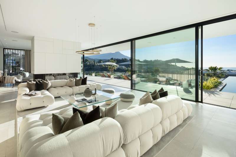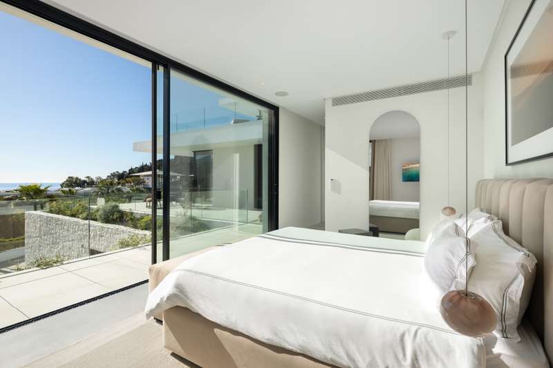 Villa Serenidad is an exquisite modern home located within the prestigious and serene gated community of El Madroñal, nestled in the hills of Marbella. This stunning property perfectly combines cutting-edge design with exceptional comfort, offering mesmerizing views of the Mediterranean Sea. Crafted by renowned AMES Architect, the villa’s every detail speaks to both luxury and practicality, blending seamlessly with its natural environment. The villa features eight spacious en-suite bedrooms and two additional guest bathrooms, making it ideal for both families and guests. The open-plan living and dining areas flow effortlessly into a state-of-the-art Gaggenau kitchen, fully equipped with the latest appliances. The high ceilings and floor-to-ceiling windows flood the interior with natural light, creating bright and inviting spaces that frame the breathtaking sea views. A contemporary fireplace adds an extra touch of elegance and warmth to the living area. The outdoor spaces are equally