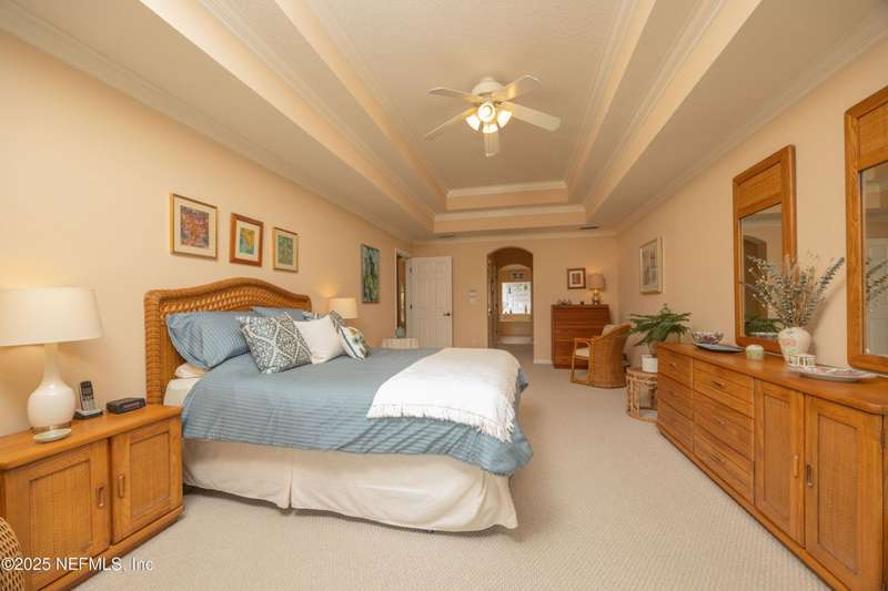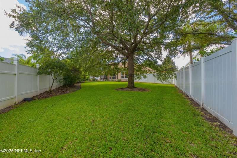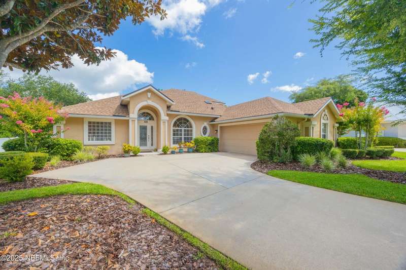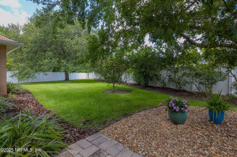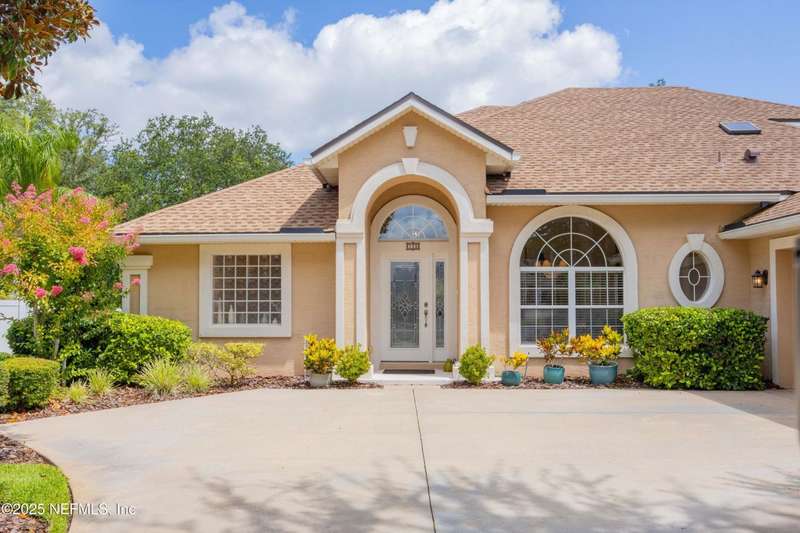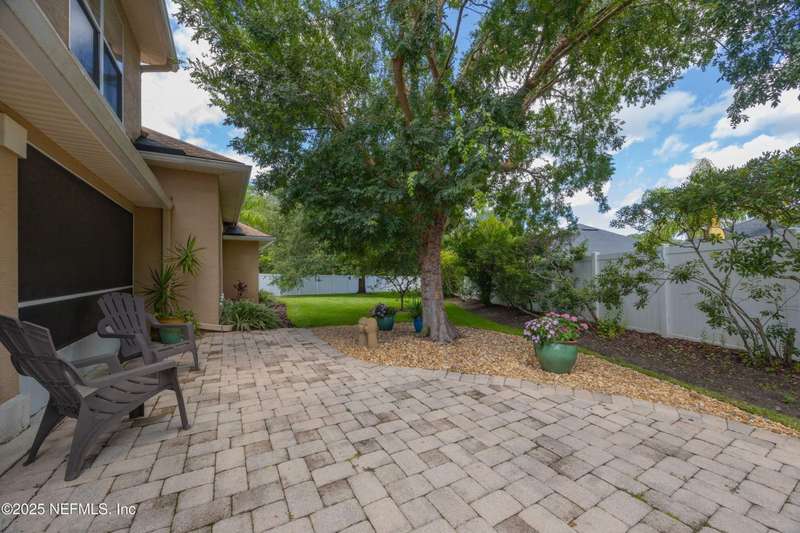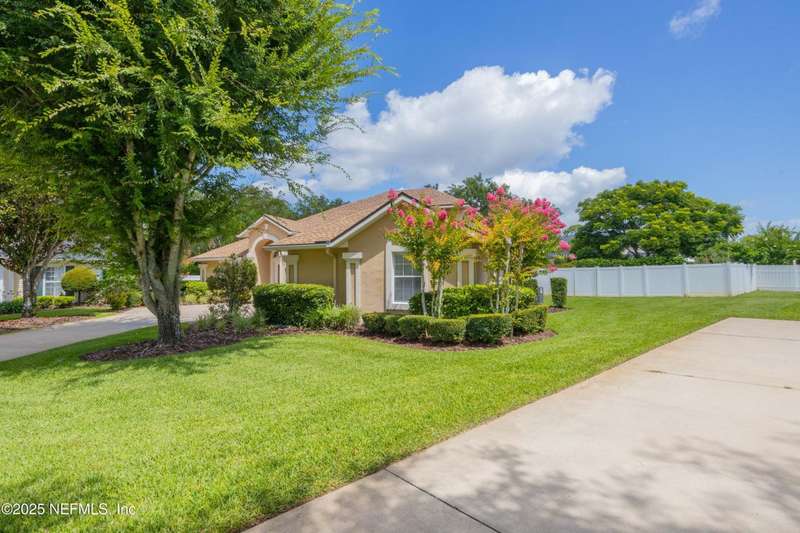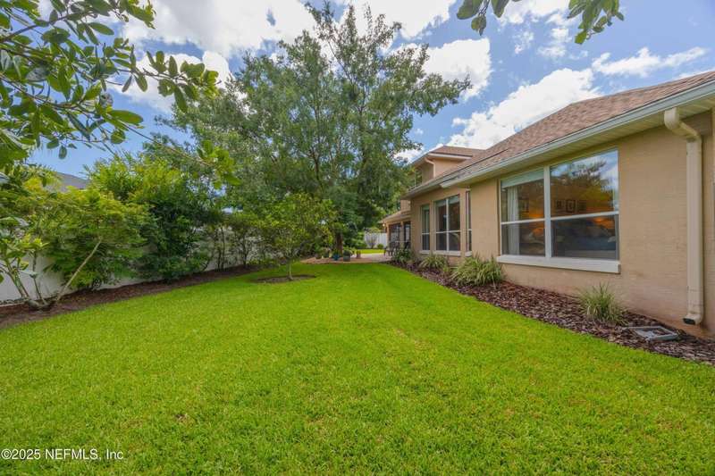 ELEGANT 4BR/3BA CONCRETE BLOCK HOME ON BEAUTIFULLY TREED CUL-DE-SAC. Possible in law or generational suite! New roof 2 years ago! Light, bright & beautifully maintained with rich wood floors, high ceilings with crown molding, formal dining room, huge kitchen with loads of cabinets, lots of counter space, an island & 8x10 eating space that leads to 20 ft long screened lanai overlooking huge, fully fenced back yard with double gate. Kitchen overlooks large living room with fireplace & lots of windows. Split bedroom plan, 24 ft long owner suite with 2 walk in closets, double tray ceiling with crown molding, plus owner bath with 2 vanities, walk in shower, garden tub & water closet. Split BR plan has other 2 bedrooms on other side of home, plus a huge ensuite BR/BA bonus room with 4x5 air conditioned closet. 7x9 Utility room leads to 2 car side entry garage. AWESOME LOCATION! 7 miles to the beach, 1.3 miles to shopping & 7/10 mi to school!