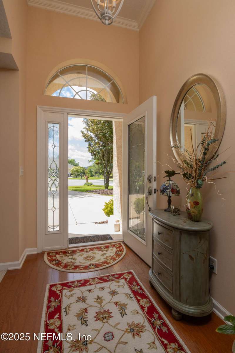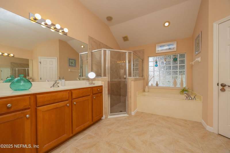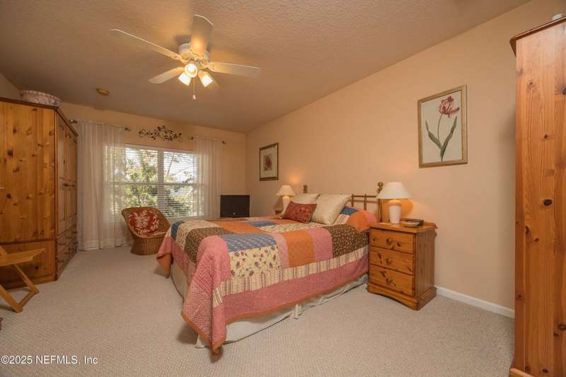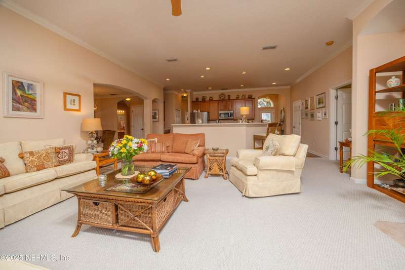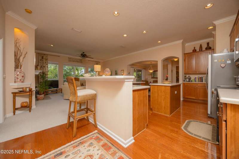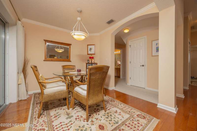ELEGANT 4BR/3BA CONCRETE BLOCK HOME ON BEAUTIFULLY TREED CUL-DE-SAC. Possible in law or generational suite! New roof 2 years ago! Light, bright & beautifully maintained with rich wood floors, high ceilings with crown molding, formal dining room, huge kitchen with loads of cabinets, lots of counter space, an island & 8x10 eating space that leads to 20 ft long screened lanai overlooking huge, fully fenced back yard with double gate. Kitchen overlooks large living room with fireplace & lots of windows. Split bedroom plan, 24 ft long owner suite with 2 walk in closets, double tray ceiling with crown molding, plus owner bath with 2 vanities, walk in shower, garden tub & water closet. Split BR plan has other 2 bedrooms on other side of home, plus a huge ensuite BR/BA bonus room with 4x5 air conditioned closet. 7x9 Utility room leads to 2 car side entry garage. AWESOME LOCATION! 7 miles to the beach, 1.3 miles to shopping & 7/10 mi to school!