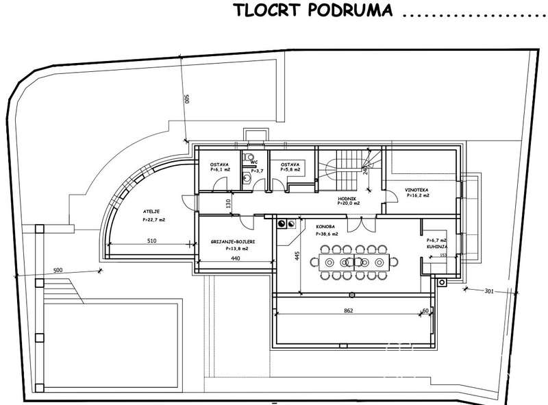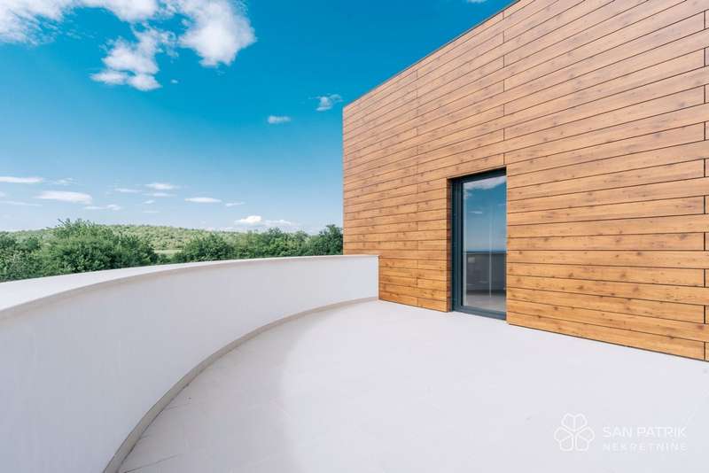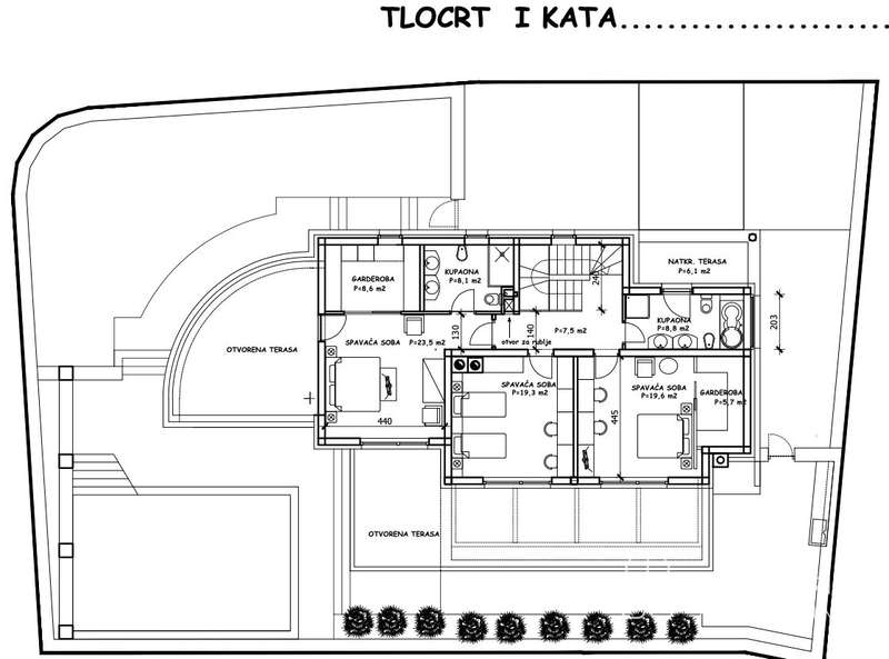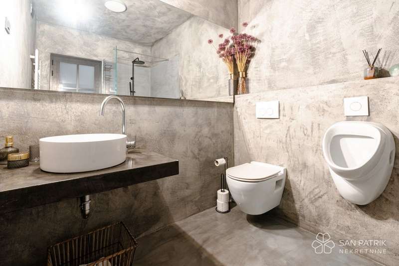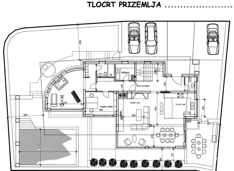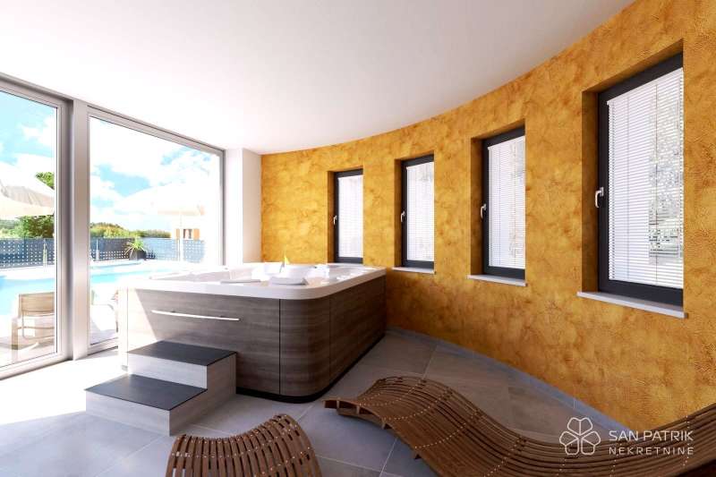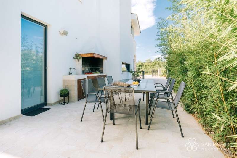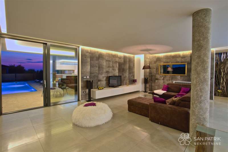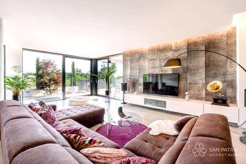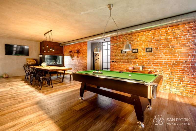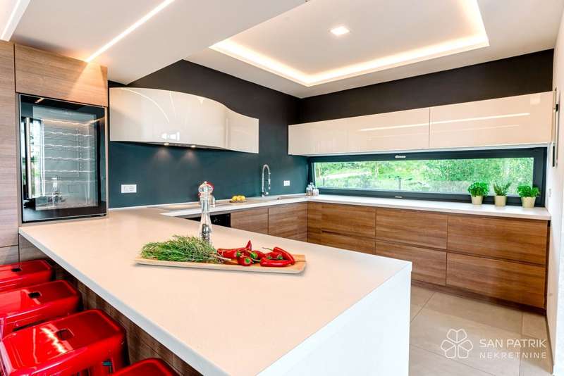On a plot of 650 m2 for sale is a designer villa with a total area of 370 m2 which on three floors (basement, ground floor and first floor) consists of 4 bedrooms, walk-in closet, 3 bathrooms, 4 terraces, 2 kitchens, private outdoor pool, large living room and dining room with fireplace, tavern, study room, lush garden with automatic watering system, 3 parking spaces.
