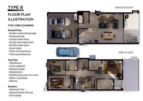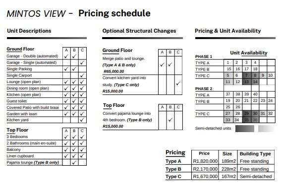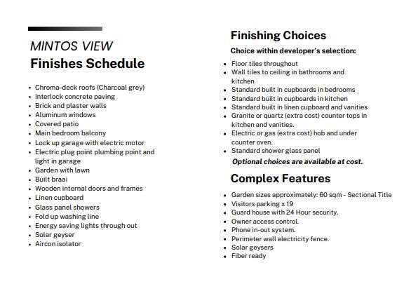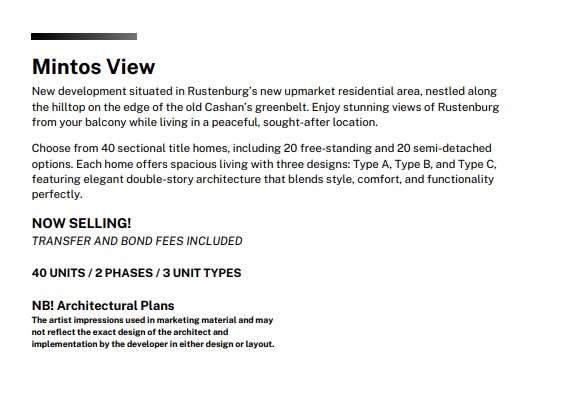 Welcome to Mintos View, a new development in Cashan. Type B, phase 2. The Property has 3 Bedrooms, 2 Bathrooms. Main Bedroom has an En-Suite Bathroom and walk-in Closet and Pyjama Lounge. Enjoy your coffee on the balcony with stunning views There is a Lounge, Open plan Kitchen and Dining area. Guest Toilet downstairs. The property also has a Linen Cupboard. The house is fitted with Energy-saving lights and solar geysers The property has a double garage. On the outside there is a covered Patio with Built-in Braai. You also have your own Pet-friendly private garden with a fold-up washing line. The property has Fibre connectivity Optional upgrades are available! Security is top notch with a 24/7 security access control. Phone-in/out system for visitors Don’t miss out, buy your home today in Mintos View. Call us today for this prime property