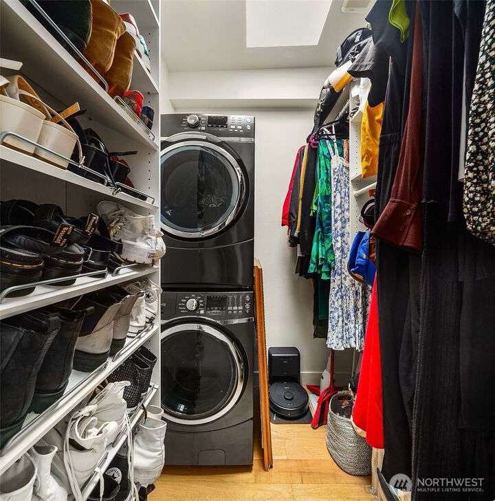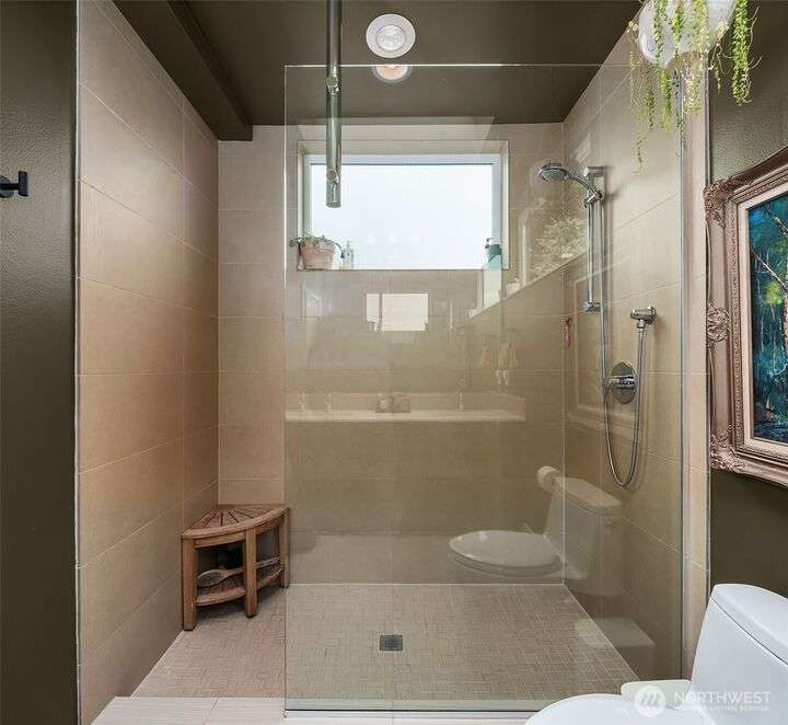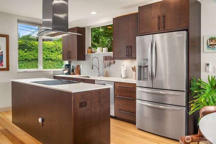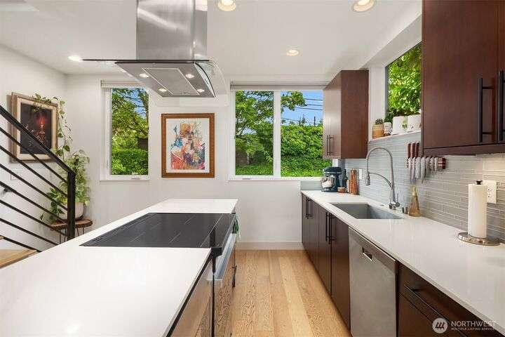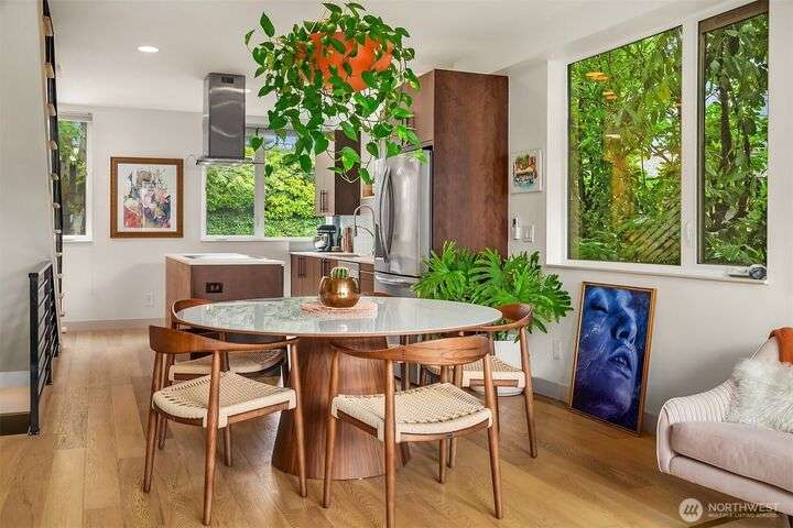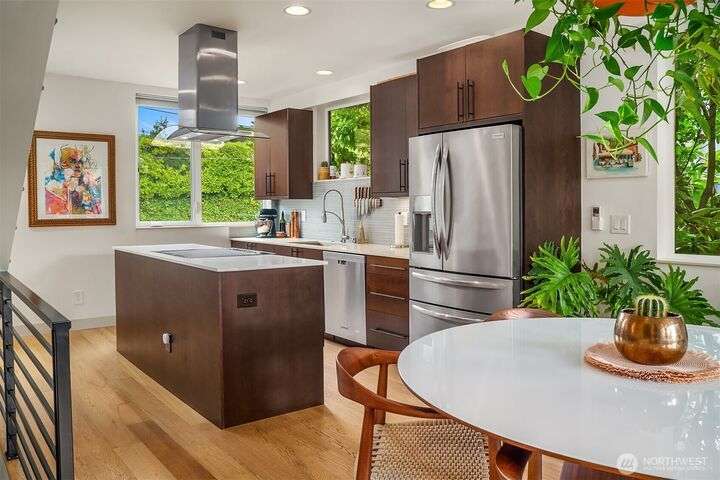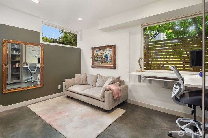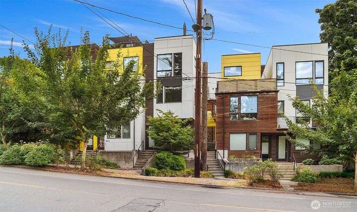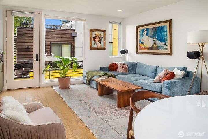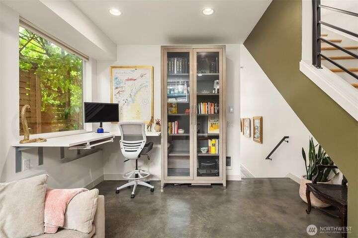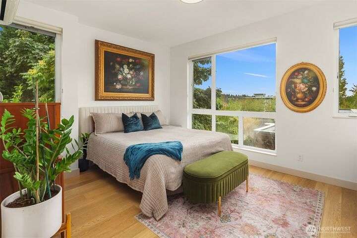 Modern 2-bed Fremont townhome w/ rooftop deck. Designed by award-winning B9 Architects it blends modern design w/ warm, inviting interiors. Light-filled open plan showcases wide-plank hardwoods, oversized windows, built-in media cabs & high-end finishes. Chef’s kitchen boasts quartz counters, new SS appl, sleek cabs & island. Primary Suite has expansive windows w/ treetop views & custom built-ins for addt’l storage. WIC & en-suite ¾ bath w/ skylights. Lower-level flex/rec rm w/ built-in desk for versatility. Entertain on a spacious rooftop deck w/ territorial & city views. Mini-split heat pumps for efficient heating & cooling. Blocks to Fremont dining, shops, parks & easy commute to DT, Ballard & Green Lake. In-city living at its finest.