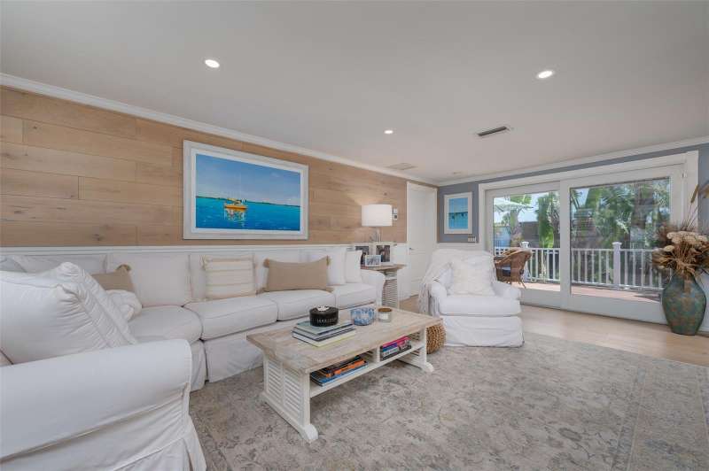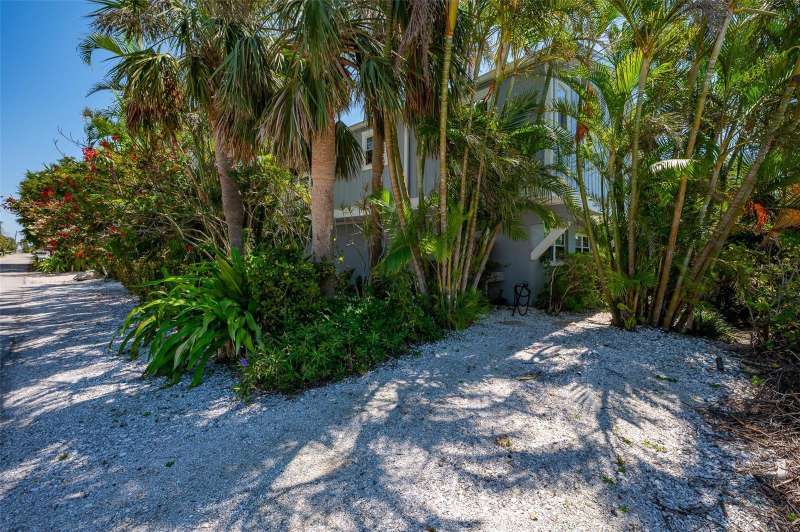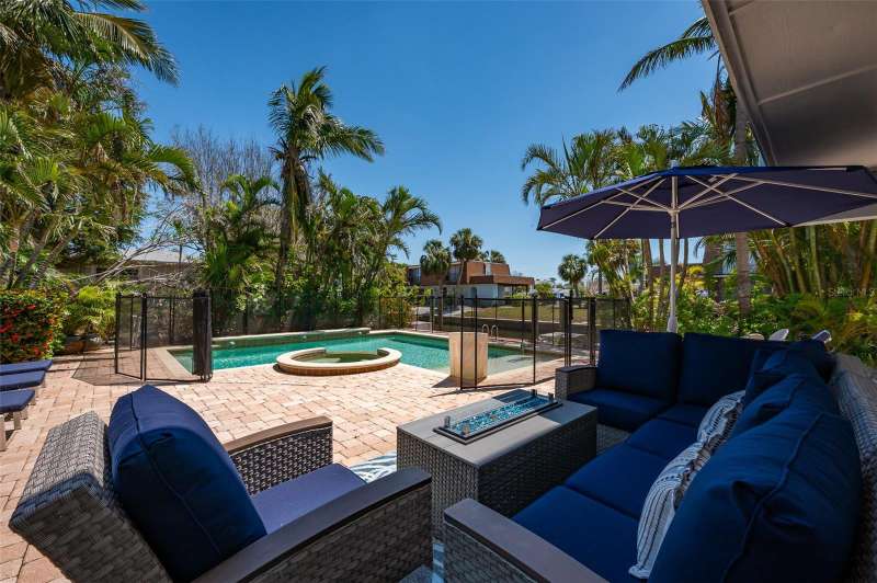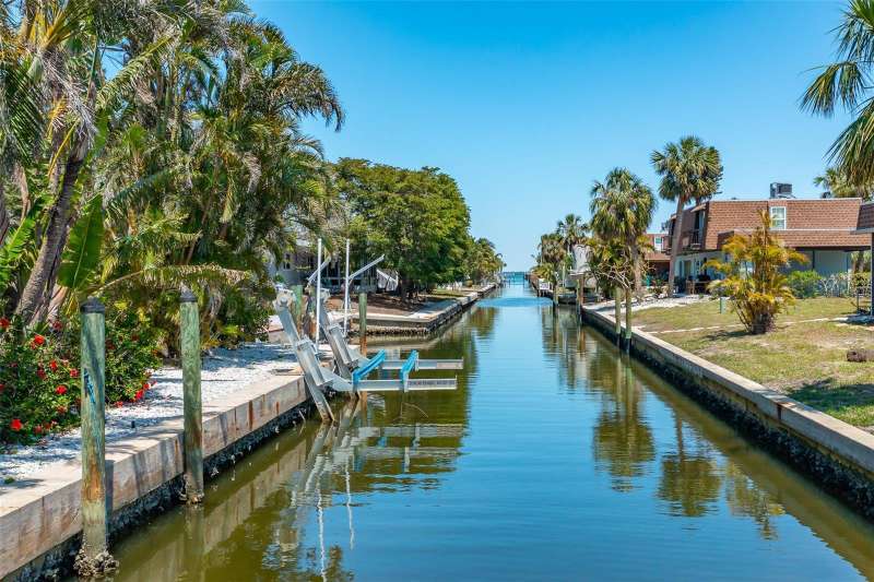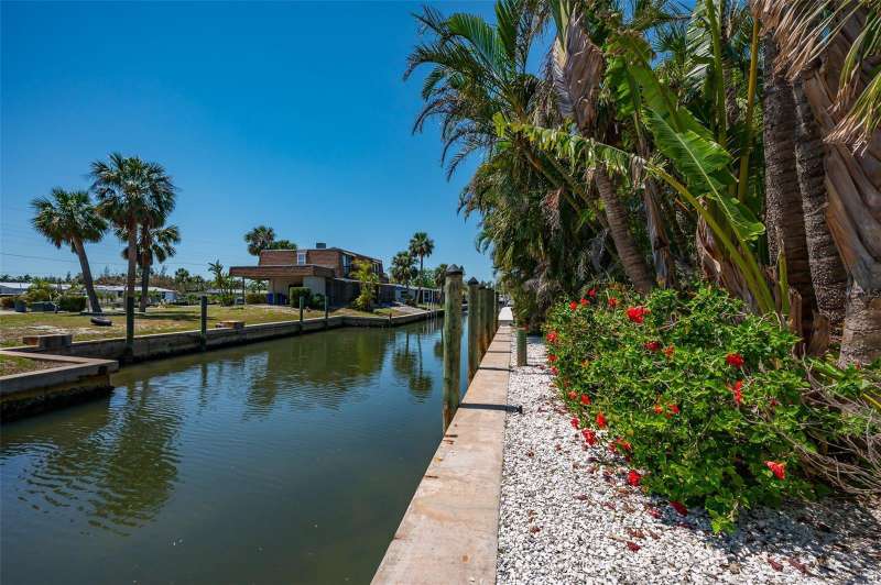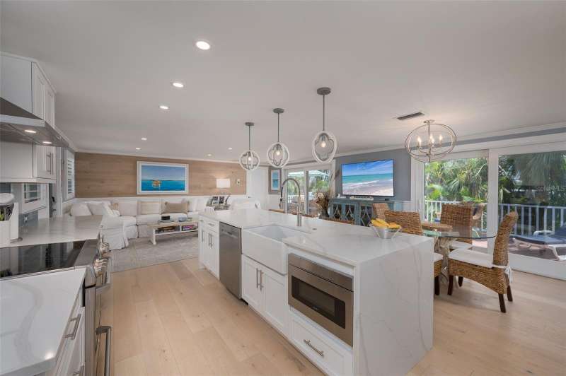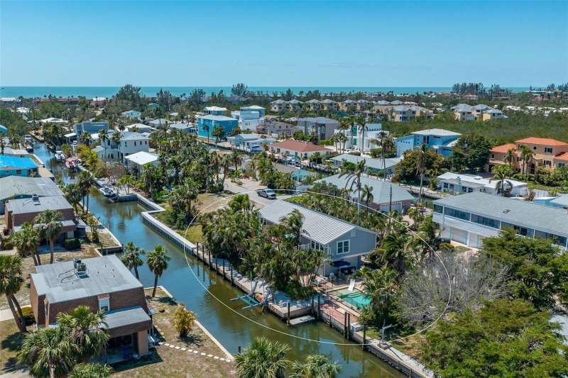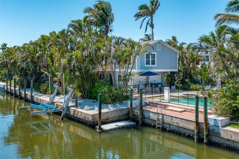 Discover your own tropical paradise on the serene North end of Longboat Key and has deeded beach access, a rare gem that blends privacy, luxury, and coastal charm. This stunning, fully renovated home boasts a thoughtfully designed open split-floor plan, perfect for relaxed living and entertaining. The custom-designed kitchen is a chef's dream, featuring sleek solid countertops, custom cabinetry, and premium stainless-steel appliances. An expansive island bar creates an inviting space for casual dining and social gatherings. Gorgeous, engineered wood floors flow throughout the main living areas, adding warmth and elegance. The spacious master suite offers a tranquil retreat, complete with a newly remodeled spa-like master bath ideal for unwinding after a day spent on the water. A well-appointed guest bedroom with its own private bath ensures comfort and privacy for visitors. Step outside to your private oasis, where a sprawling rear balcony overlooks serene canal views and the heated pool. The expansive paver deck offers ample space for lounging, dining, and soaking up the Florida sun. Boating enthusiasts will be delighted by the 120-foot seawall, 7,000 lb. boat lift, and convenient docking and mooring features providing effortless access to the open water. This property is designed with both style and security in mind. The durable standing seam metal roof and hurricane-resistant impact glass windows and doors provide peace of mind during storm season. The lower level features a versatile guest or in-law suite complete with an upgraded bathroom and kitchenette, ideal for hosting family or accommodating extended stays. Lush, meticulously maintained landscaping showcases a variety of palm trees and fruit trees, creating a true tropical escape. The two-car garage, finished with a sleek and durable epoxy coating, combines style with functionality.