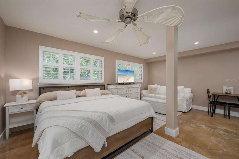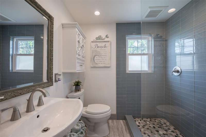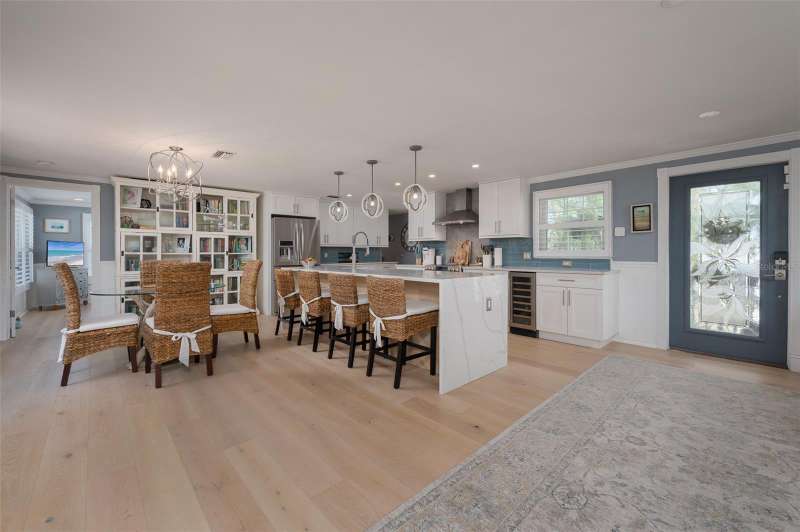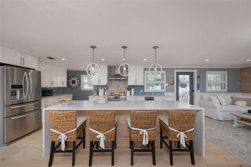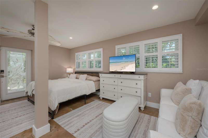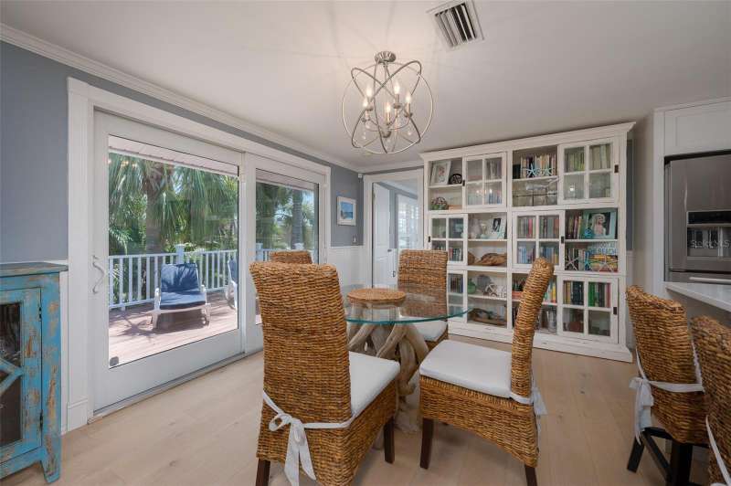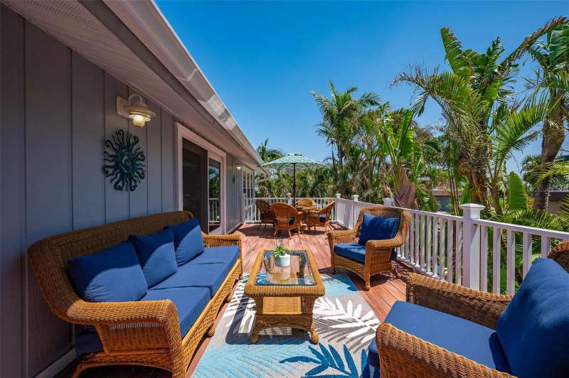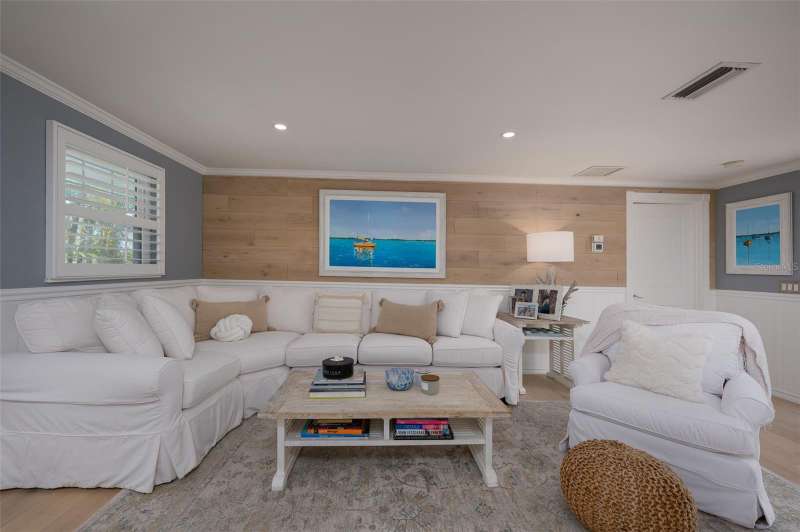 Discover your own tropical paradise on the serene North end of Longboat Key and has deeded beach access, a rare gem that blends privacy, luxury, and coastal charm. This stunning, fully renovated home boasts a thoughtfully designed open split-floor plan, perfect for relaxed living and entertaining. The custom-designed kitchen is a chef's dream, featuring sleek solid countertops, custom cabinetry, and premium stainless-steel appliances. An expansive island bar creates an inviting space for casual dining and social gatherings. Gorgeous, engineered wood floors flow throughout the main living areas, adding warmth and elegance. The spacious master suite offers a tranquil retreat, complete with a newly remodeled spa-like master bath ideal for unwinding after a day spent on the water. A well-appointed guest bedroom with its own private bath ensures comfort and privacy for visitors. Step outside to your private oasis, where a sprawling rear balcony overlooks serene canal views and the heated pool. The expansive paver deck offers ample space for lounging, dining, and soaking up the Florida sun. Boating enthusiasts will be delighted by the 120-foot seawall, 7,000 lb. boat lift, and convenient docking and mooring features providing effortless access to the open water. This property is designed with both style and security in mind. The durable standing seam metal roof and hurricane-resistant impact glass windows and doors provide peace of mind during storm season. The lower level features a versatile guest or in-law suite complete with an upgraded bathroom and kitchenette, ideal for hosting family or accommodating extended stays. Lush, meticulously maintained landscaping showcases a variety of palm trees and fruit trees, creating a true tropical escape. The two-car garage, finished with a sleek and durable epoxy coating, combines style with functionality.