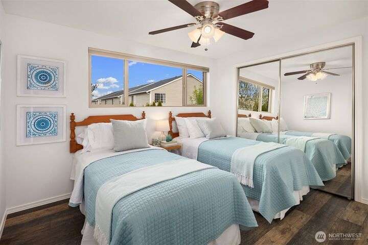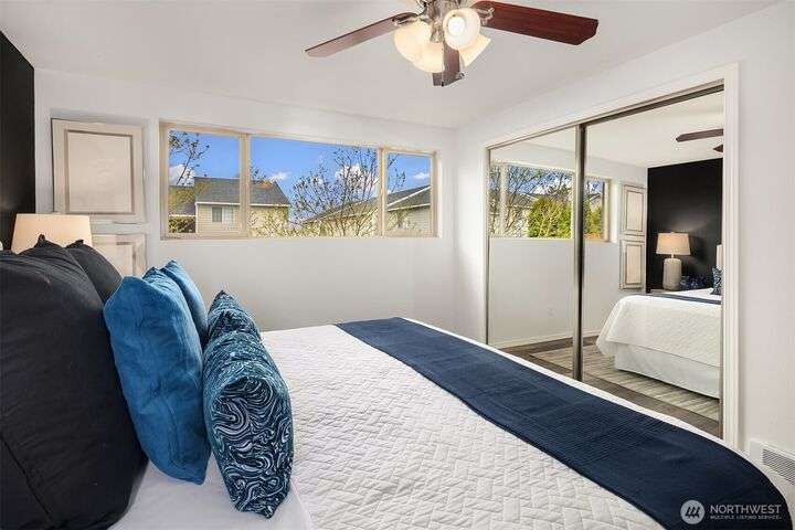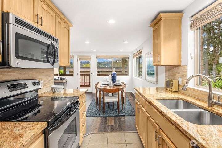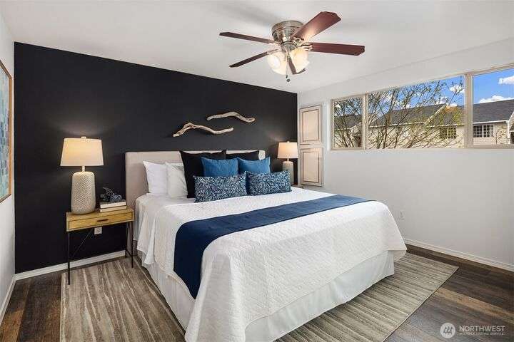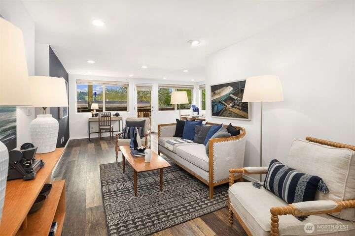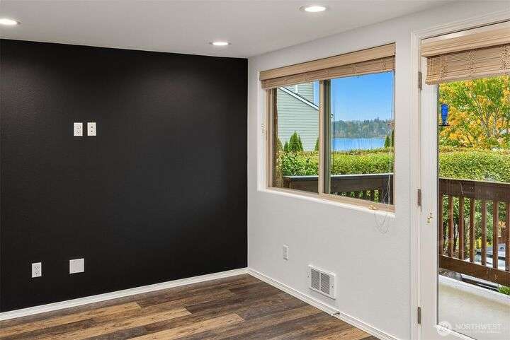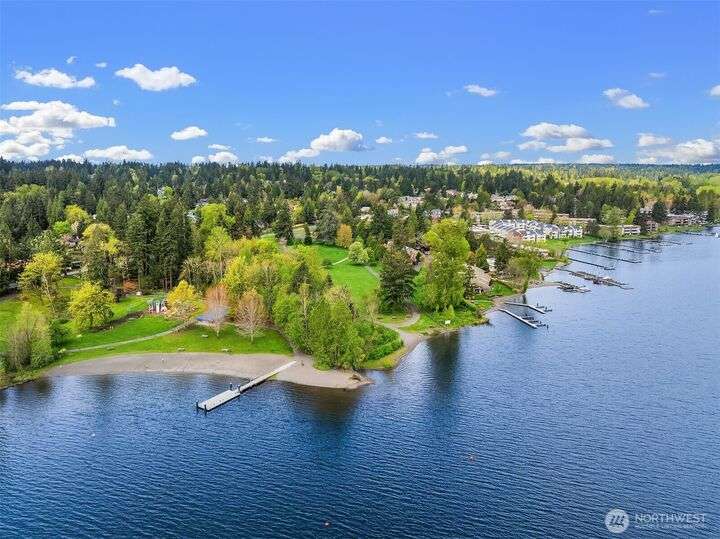 The best value 2-bedroom on Lake Sammamish! Open and bright 2-bed, 1-bath corner unit with lovely water views and a spacious deck facing the lake. Stylish and design-forward unit with $60K+ in seller upgrades include fresh paint, all new flooring, and a fully renovated bathroom with heated ceramic tile. Waterfront features at Lakewood Shores: Private beach, boat dock, fire pit, and picnic area. Optional boat storage and boat slip rental. Enjoy a dedicated parking spot plus guest parking in front of the unit. Located minutes from Microsoft, 520, two Redmond light rail stations, and Marymoor Park. Next door to Idylwood beach park. Strong HOA with plentiful reserves. A peaceful life close to everything— welcome to Redmond's best-kept secret!