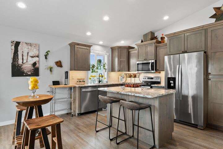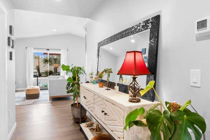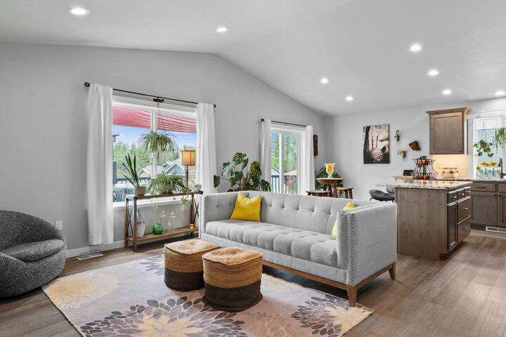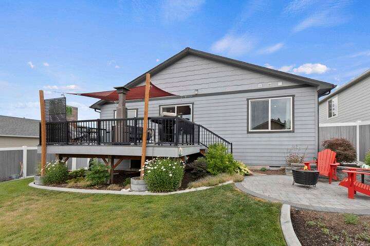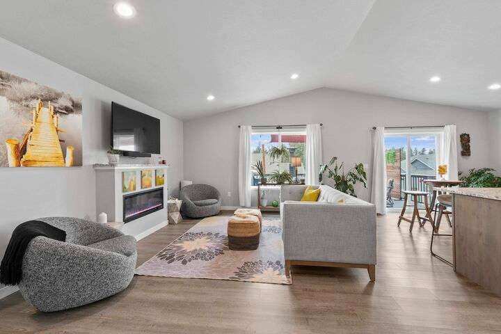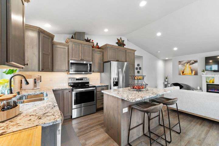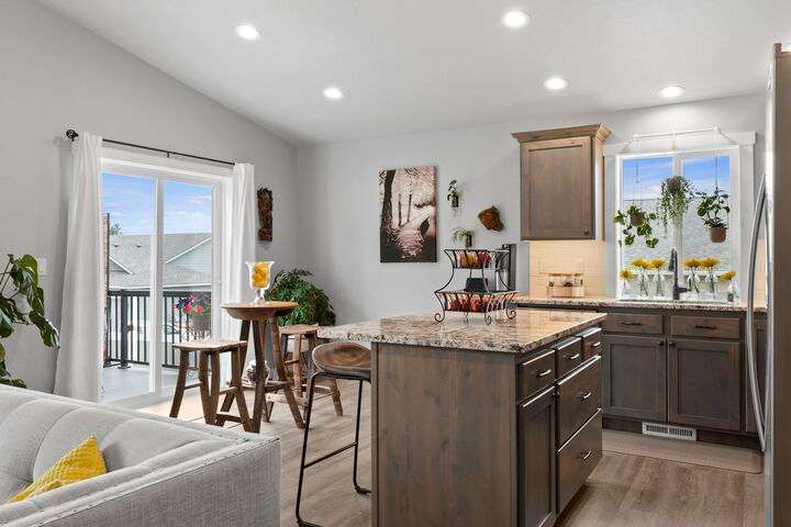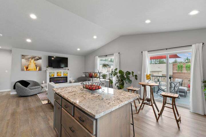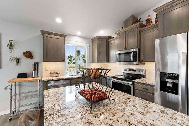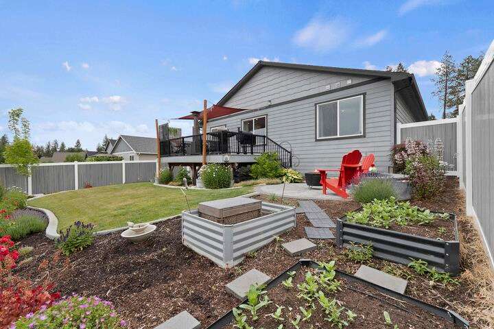 Welcome home to Timberlane Terrace, a sought-after South Valley community! This all 1 level zero step entry craftsman rancher offers the ease of main level living with an open floor plan, a great room w/a vaulted ceiling, LVP flooring and a zero-scape front yard. The kitchen features wood cabinetry w/a built-in pantry, under-mount lighting over the granite counters, a tiled backsplash, stainless steel appliances, center island with seating and is open to the informal dining and great room. The great room lends spacious seating w/a cozy electric fireplace. There is a bright primary suite & en-suite w/a walk-in closet plus 2 additional bedrooms and 1 full bath. The laundry room has a sliding barn door, utility sink, great storage & access to the 2 car garage. Take the sliding glass door out onto the composite decking and look out over the new gorgeous patio and yard complete w/concrete curbing, spray system, drip lines, 3 raised garden beds and privacy fencing. Zoned for coveted CV school district.