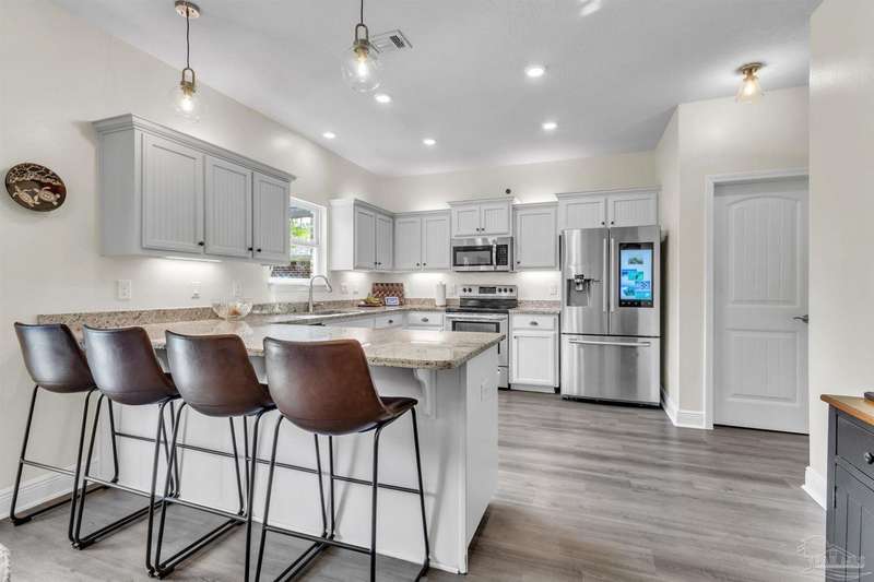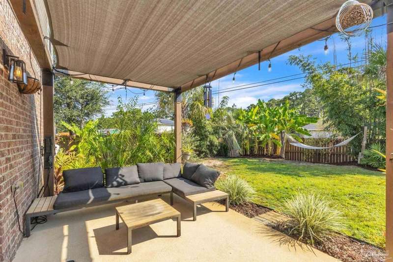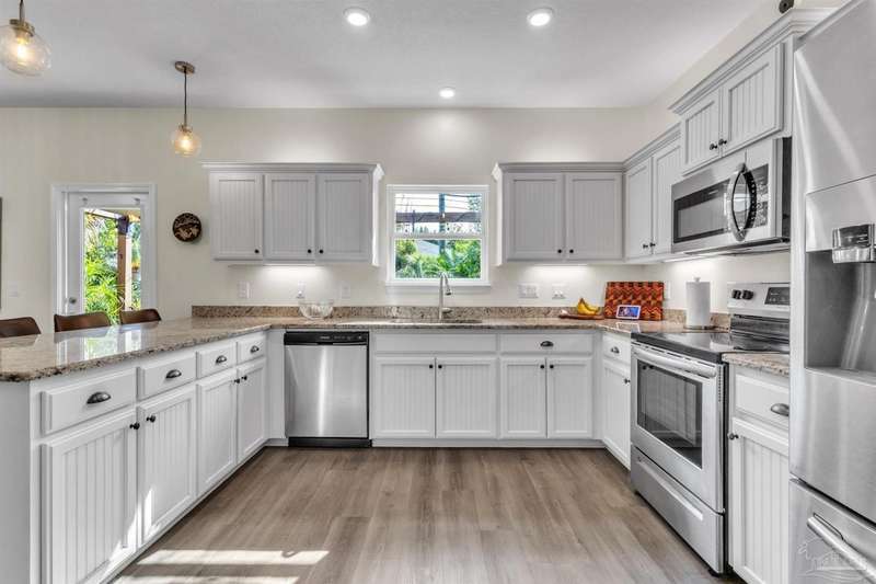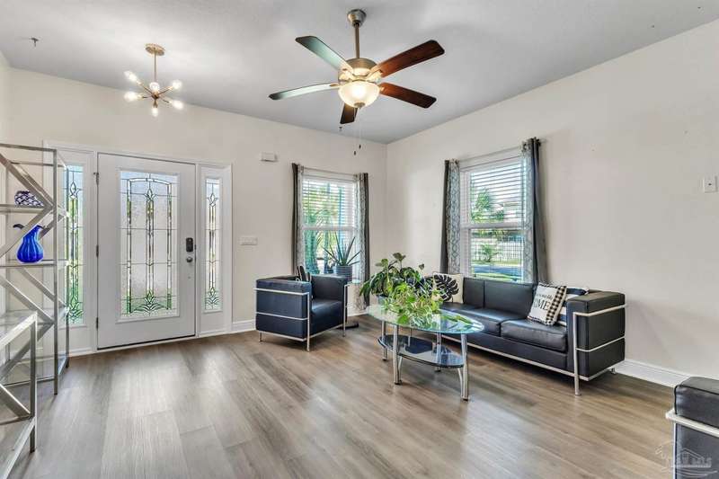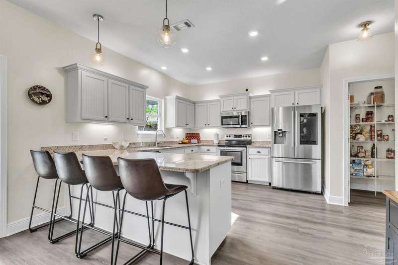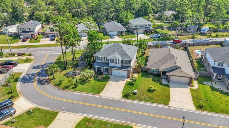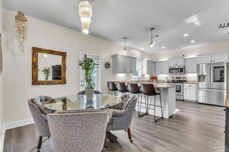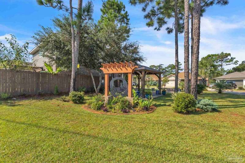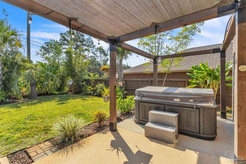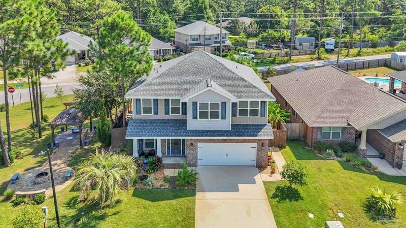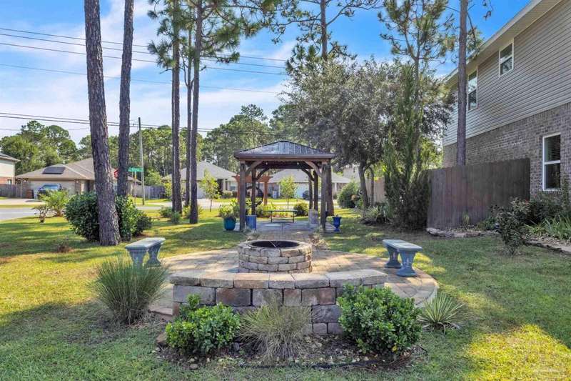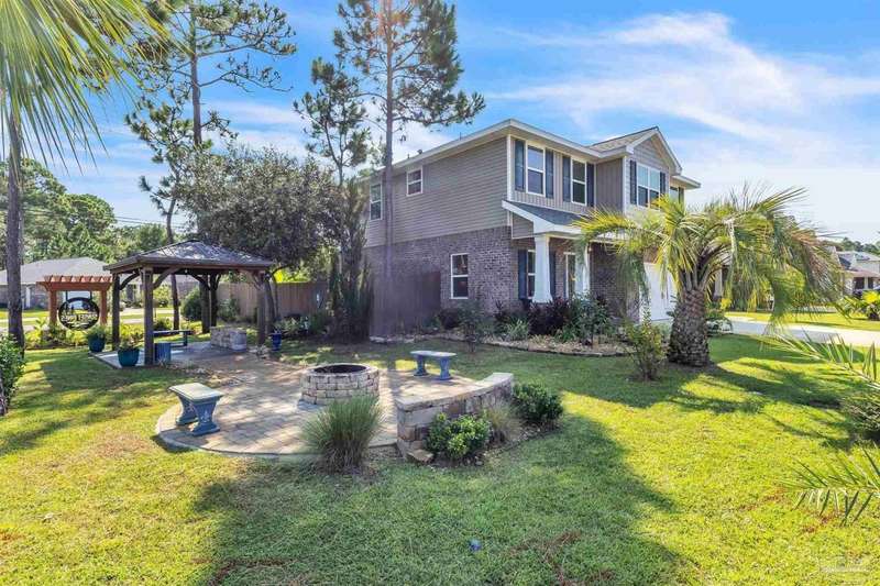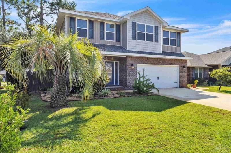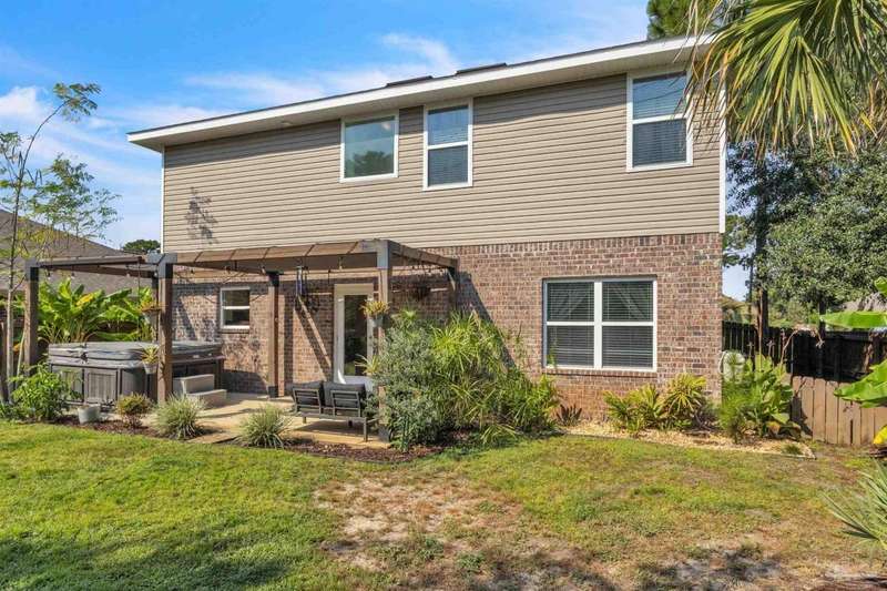 Better Than New! Impeccable Gulf Breeze 4BR/3BA/2-Car Retreat Move right in to this upgraded home in a quiet, one-street neighborhood. The fully fenced backyard is a tropical oasis with over 50 subtropical and edible plants, including multiple banana varieties, pineapple, berries, fig, olive, loquat, elderberry, and more. Canary, Silvester, Pindo, Sabel, Saw, and Sago palms create a resort feel, while a modern wood and steel pergola offers the perfect space for entertaining or relaxing. Designed for beauty and ease, the landscaping is low-maintenance and climate-ready for ease of care year-round. Inside, windows fill the home with natural light, highlighting LVP flooring in main areas, plush new carpet, and upgraded LED lighting throughout. The perfect floor plan for multi-generational living features a downstairs guest suite/office with full bath, bonus loft upstairs, and a spa-like master suite with soaking tub, shower, dual vanities, and huge closet. The kitchen boasts granite countertops, stainless smart refrigerator, smooth-top range, stainless appliances, breakfast bar, and walk-in pantry. Extras include a Nest thermostat, security cameras, sprinkler system on private well, transferable WDO bond. Convenient to A-rated schools, award-winning beaches, East Bay Trail, parks, golf, shopping, dining, and military bases.
