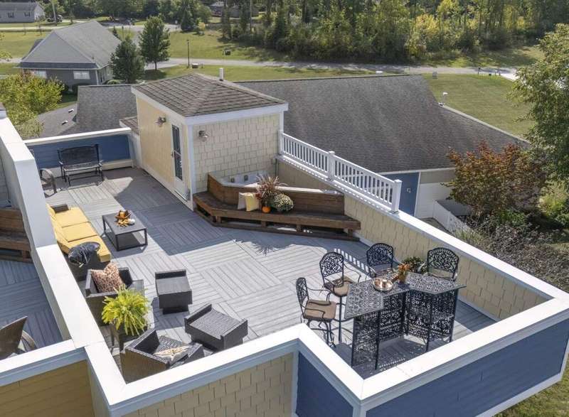 Carefree Coastal Living in New Buffalo! Experience easy, maintenance-free living at one of New Buffalo's premier condominium communities. Enjoy year-round amenities including an indoor swimming pool and spa, a fully equipped fitness center, and a spacious gathering room with a full kitchen-perfect for entertaining family and friends. This beautifully renovated end-unit condo offers approx 2,000 sq. ft. of living space across three levels, bright and airy with ample natural light with windows at every turn and featuring 3 bedrooms and 3 full baths. The open-concept main floor includes an inviting living area with a gas fireplace, hardwood floors, and a modern kitchen with granite countertops and stainless-steel appliances. Two ensuite bedrooms feature walk-in showers and private balconies. The expansive rooftop deck showcases panoramic views of Lake Michigan-ideal for sunset watching or summer fireworks. Conveniently located near downtown New Buffalo's shops, restaurants, schools, beaches and the Amtrak Station. This home is perfect for a getaway retreat or full time residence.