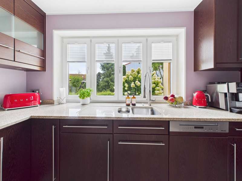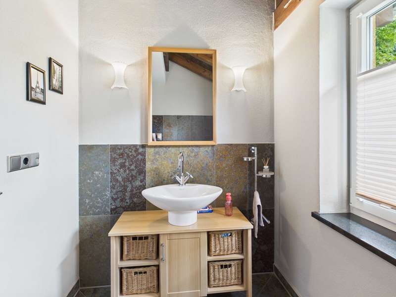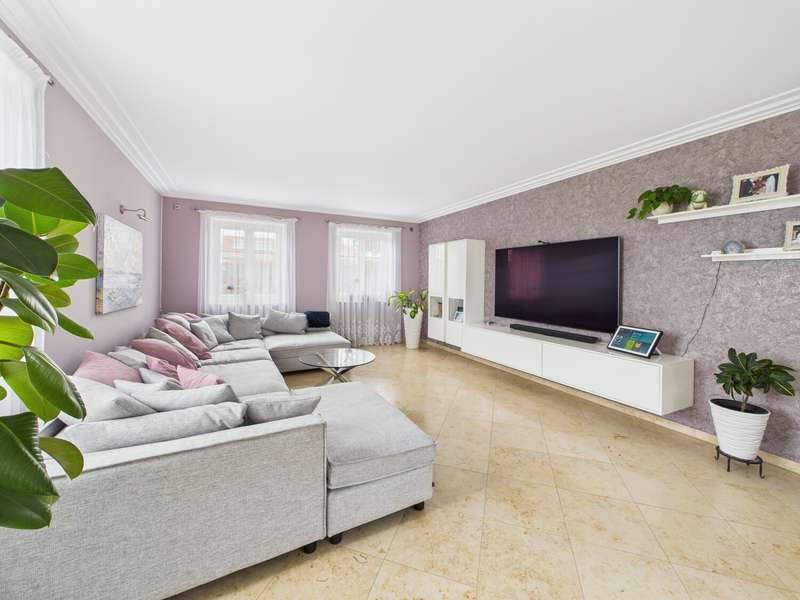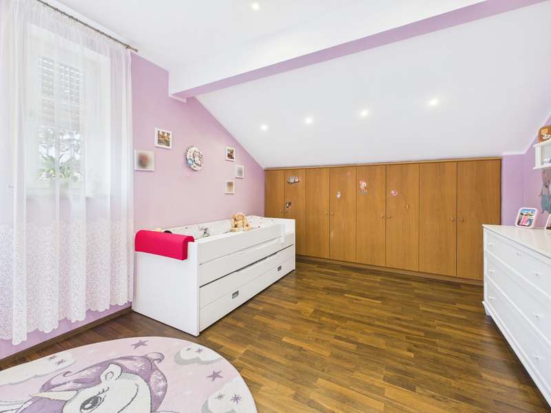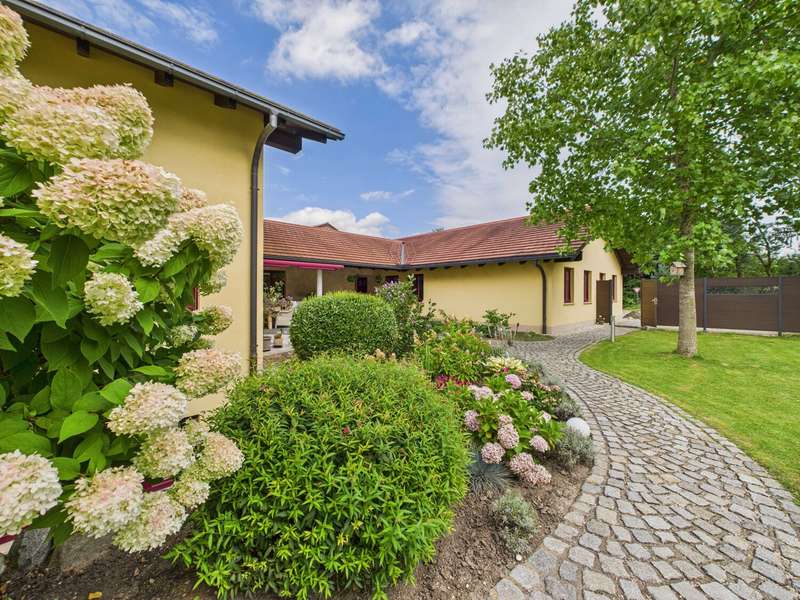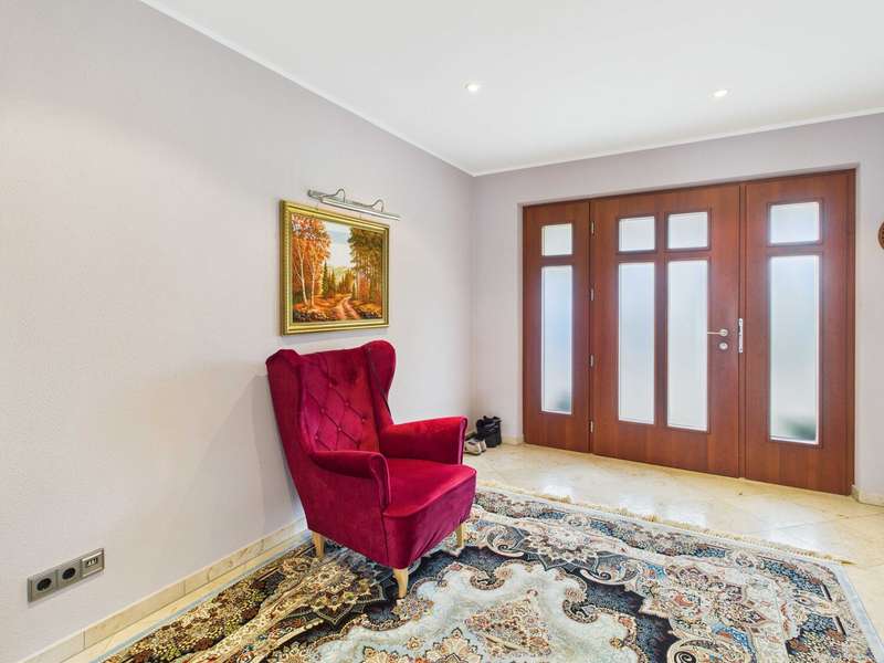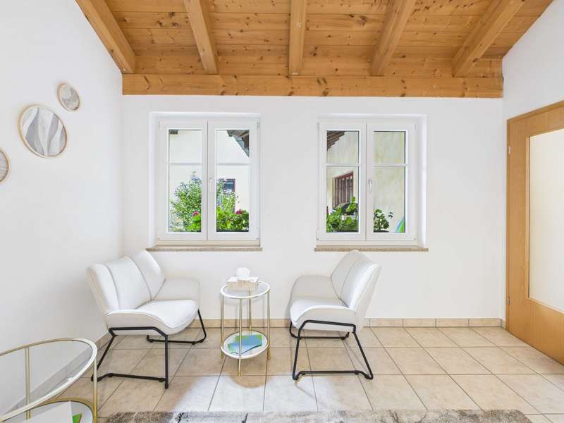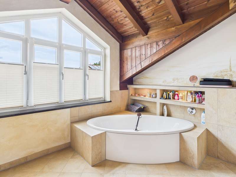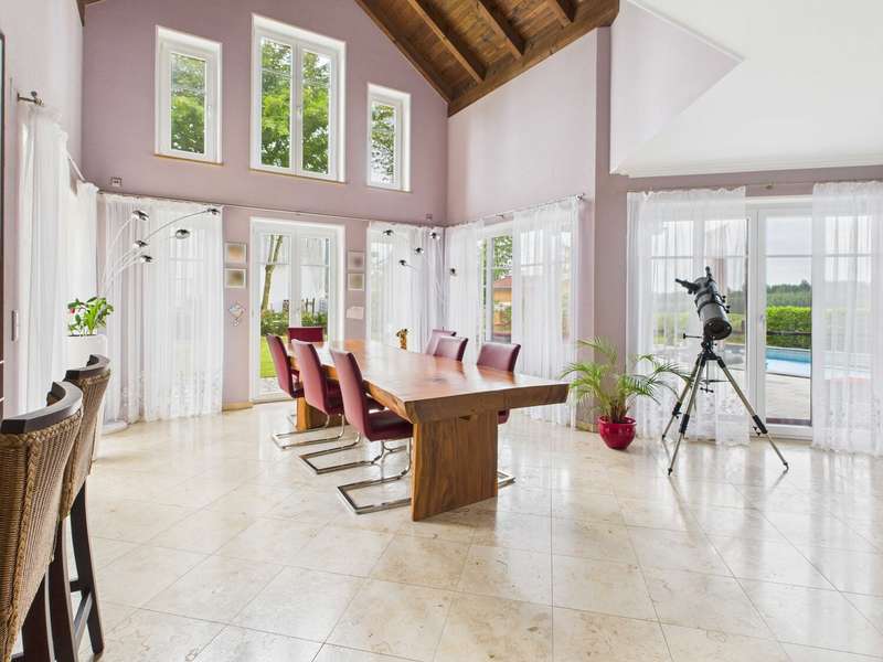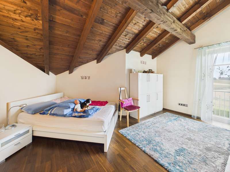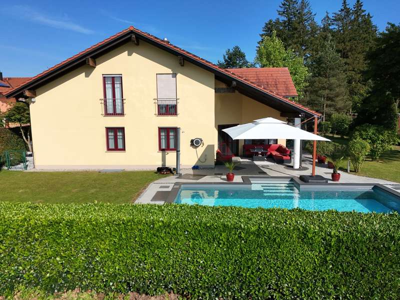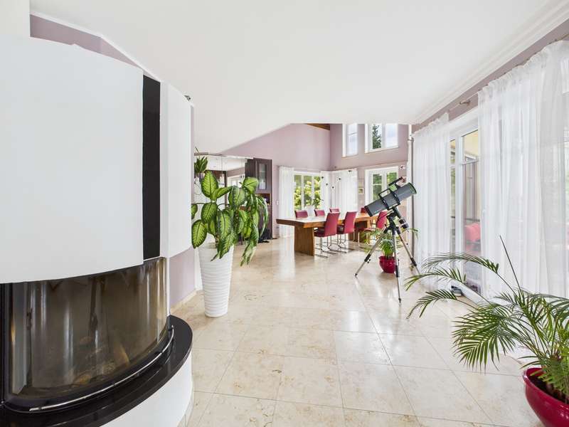 As soon as you enter this property, you can feel the spaciousness and warm ambience. The north side leads into the bright entrance hall, from which the rooms on the first floor open up harmoniously. The heart of the house is the spacious living and dining area with fireplace - a place where family and friends love to gather. High ceilings with exposed roof trusses create a feeling of freedom, while the large windows offer views of the garden. Directly adjacent is the modern kitchen with high-quality fitted kitchen and dining area - perfect for cooking and enjoying meals together. The spacious wellness area invites you to take some time out: A fitness room, sauna and direct access to the covered inner courtyard create an oasis of well-being in your own home. Three cozy bedrooms and two elegantly appointed bathrooms await you on the upper floor. The corner bathtub with a view of the greenery promises relaxing hours. All rooms are characterized by the open roof truss and convey warmth and comfort. Another highlight: the commercial part of the house. With an office, training room (which can also be used as a double garage), utility room and separate WC, it offers self-employed people and entrepreneurs the best opportunities to combine living and working under one roof - and to benefit from tax advantages. The outdoor area is as well thought-out as it is prestigious: a well-tended, low-maintenance garden with garden shed forms the setting, while the heated pool (8 x 4 m) with counter-current system and integrated steps becomes the focal point of summer hours. From here, you can enjoy an unobstructed view over the expansive landscape - like a little vacation in everyday life. The house also impresses with brightness in the basement: thanks to the large atrium, the basement rooms are flooded with light and can be used in a variety of ways - whether as a hobby room, studio or additional office space. High-quality materials such as wenge parquet flooring, natural Jura stone, granite staircases and the sophisticated fittings with underfloor heating, fireplace, central vacuum cleaner system and indirect lighting round off this offer.