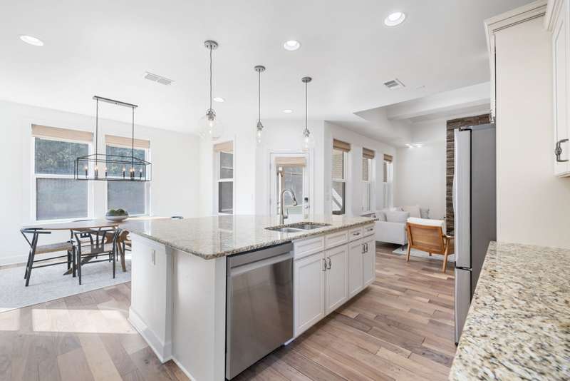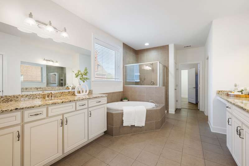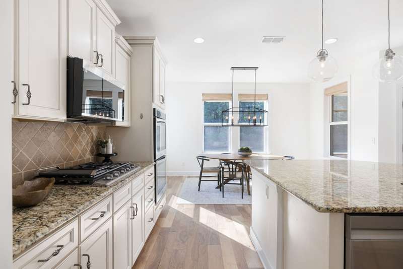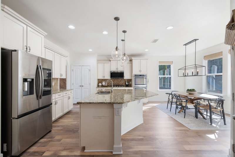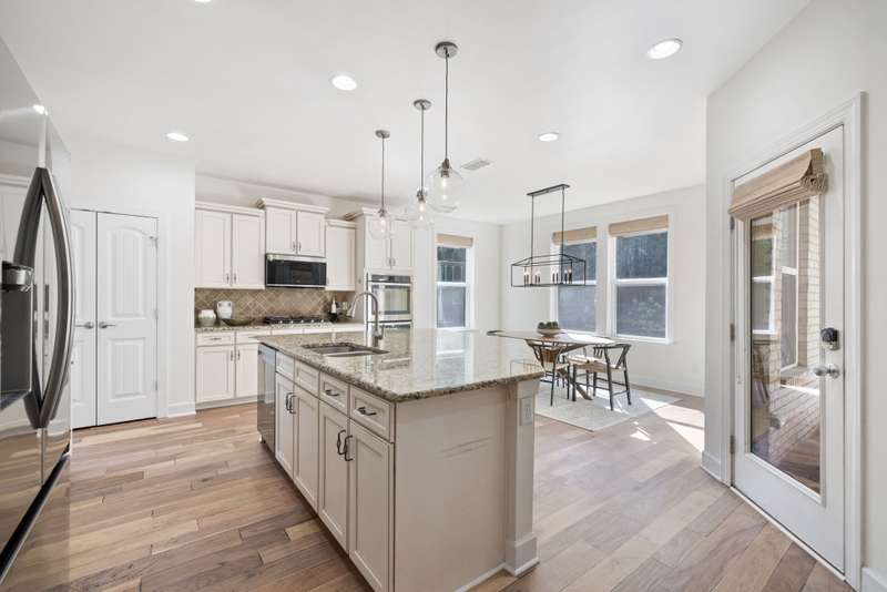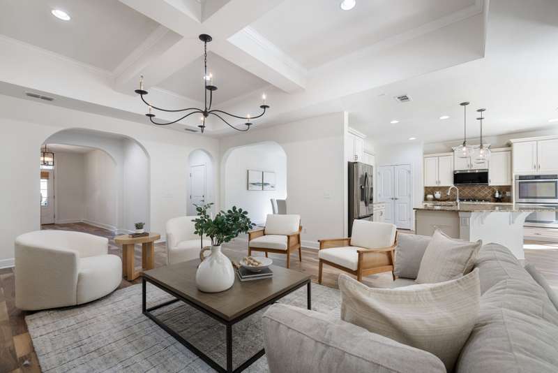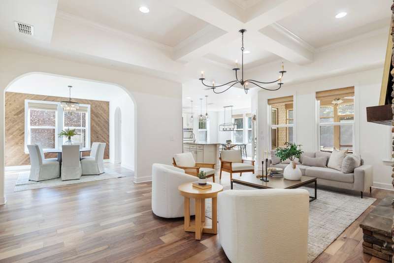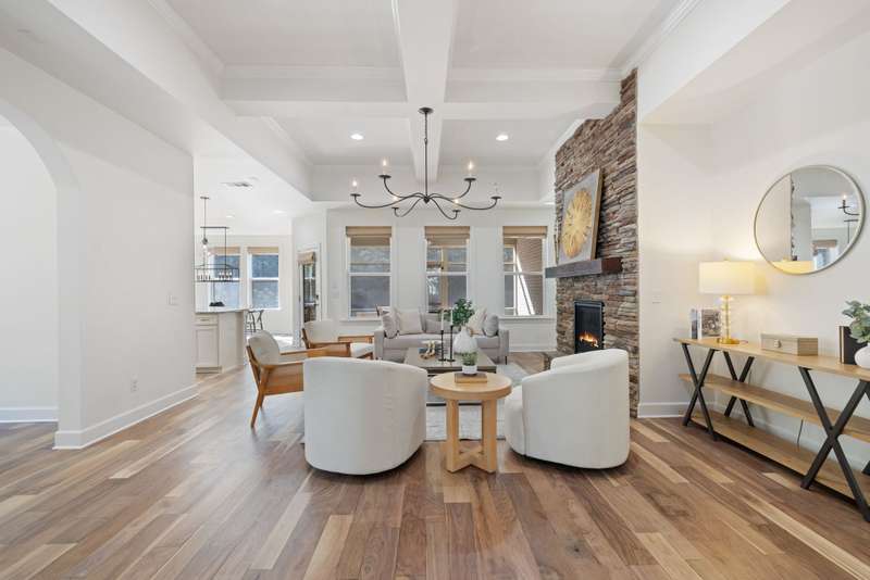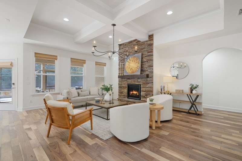 Welcome home to this stunning property with a layout that truly has it all! The gourmet kitchen is the heart of the home, featuring a large island and breakfast area that open to the great room with its cozy stone gas fireplace and beautiful coffered ceiling. Just off the foyer, the formal dining room shines with arched doorways and a wood accent wall that adds warmth and charm. The main level offers a relaxing primary suite with double closets plus a private guest ensuite--perfect for visitors. Upstairs, you'll find plenty of space with an oversized bonus room, a media room for movie nights, and two additional bedrooms, along with extra storage. Fresh white paint throughout makes every room feel bright and welcoming. Enjoy the outdoors year-round with a screened flagstone porch, a patio for grilling, and a level fenced backyard with irrigation--ideal for play, pets, and entertaining. A 3-car garage tops it all off.