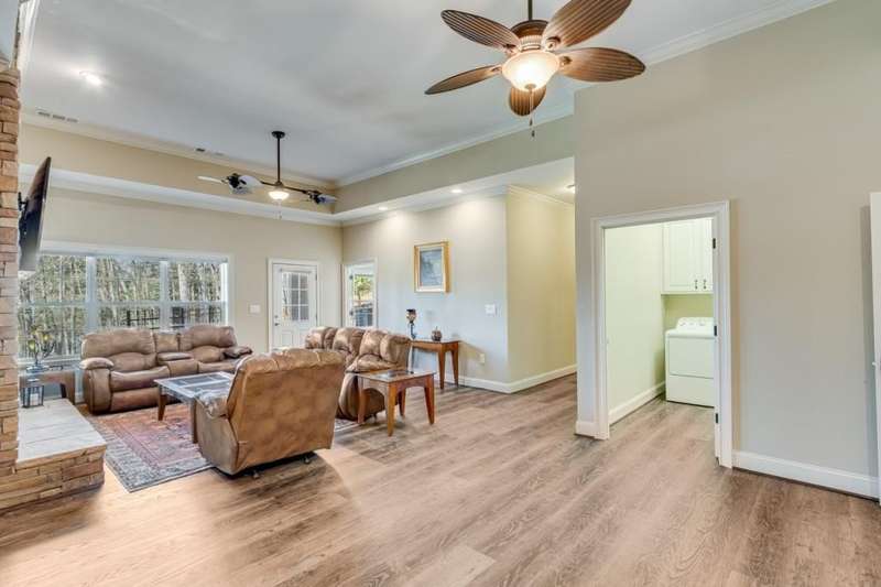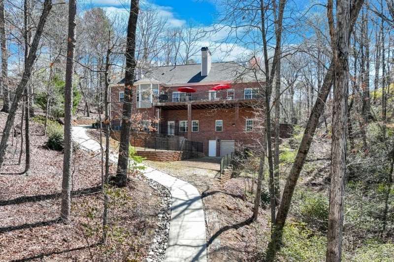This elegant, traditional Lake Lanier home has everything you need for fine lake living! Conveniently located just 10 minutes from downtown Gainesville, The Rowing Venue, the hospital district, shopping, and restaurants, this home is designed for the ultimate lakefront lifestyle. With stunning lake views from most rooms, it also features a paved path leading to a single-slip party dock in deep, calm, no-wake waters-perfect for lounging and swimming. Situated on a double lot with a low CORPS line, the property offers a circular driveway and abundant parking, along with a drive-around access to the lower-level double garage-ideal for a golf cart, boat toys, a workshop, and extra storage. Inside, the main floor boasts an open layout with all hardwood floors. The great room, featuring a striking stone wood-burning fireplace, flows seamlessly into the kitchen, which includes granite countertops, a double gas range, and high-end Thermador appliances. A dining room and a study/office complete this space. The oversized primary suite is a true retreat, featuring a sitting area, double custom closets (one with a double-stack washer/dryer), heated travertine tile floors, a jacuzzi tub, a spacious shower, and double granite vanities. Additionally, the main level includes a second ensuite bedroom, a powder room, and a large laundry room. Upstairs, you'll find a guest bedroom, a full bath, and a large bonus room over the garage. The beautifully finished terrace level, completed in 2015, offers luxury vinyl flooring, a family room with a second stone wood-burning fireplace, a full kitchen with all appliances, a dining area, a large game room, a full guest bath, and an ensuite with its own private bath-perfect for entertaining or multi-generational living. Every bathroom is equipped with heated travertine tile floors, and the home features only hardwood and luxury vinyl flooring-no carpet. This exceptional Lake Lanier property combines elegance, functionality, and the best in lakeside living!