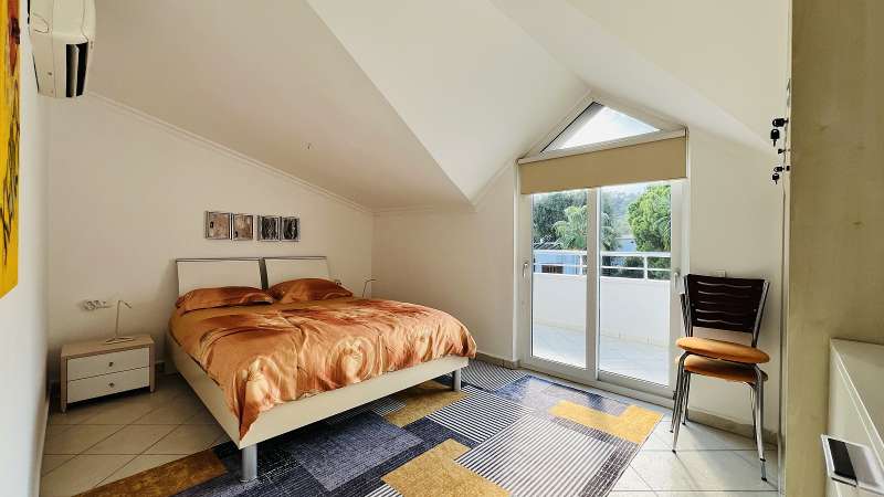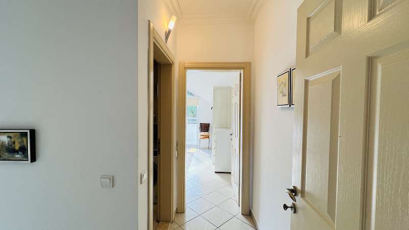 The apartment for sale in Kemer, Antalya, is a duplex located on the top floor. It offers a total living space of 90 m² and it is fully furnished. On the first floor, there is a living room, an open-plan kitchen, a toilet, and two balconies. The second floor consists of two bedrooms, a bathroom, a toilet, and a balcony.