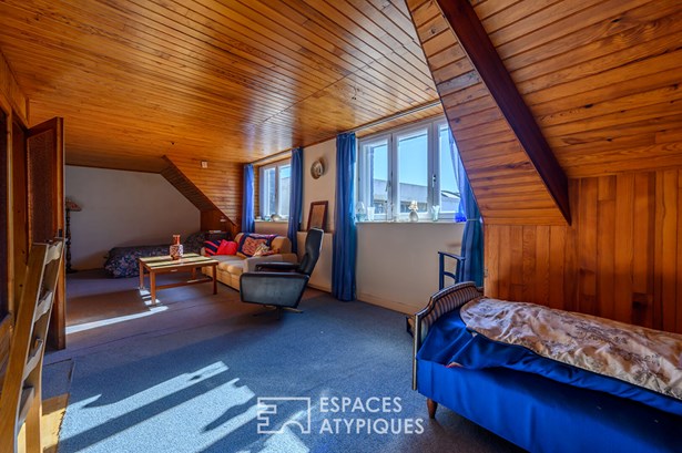 Au premier etage, une chambre lumineuse, une salle de bain avec WC, une cuisine et une piece de vie sur parquet apportent chaleur et caractere. Les combles amenages, d'une surface de 33 m2, avec un point d'eau, permettent une configuration modulable selon les besoins, ideale pour creer un espace supplementaire.