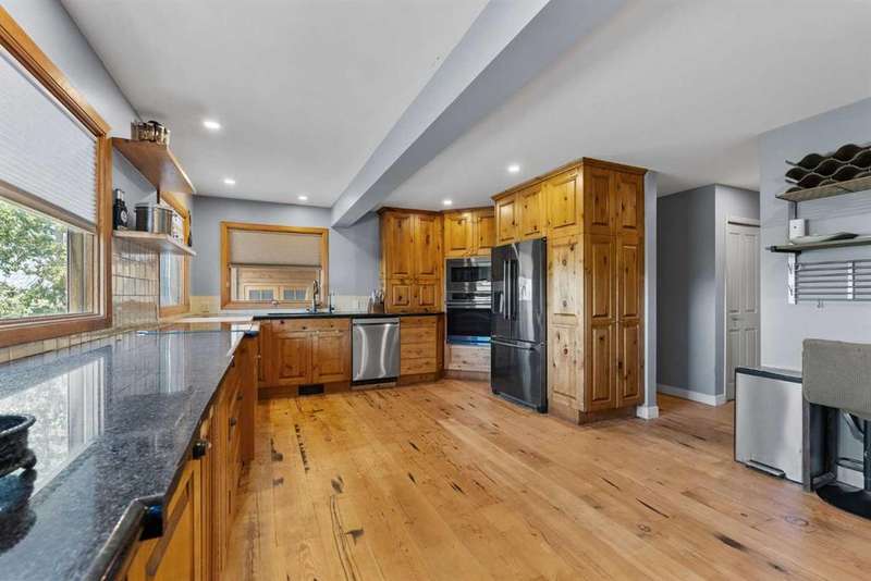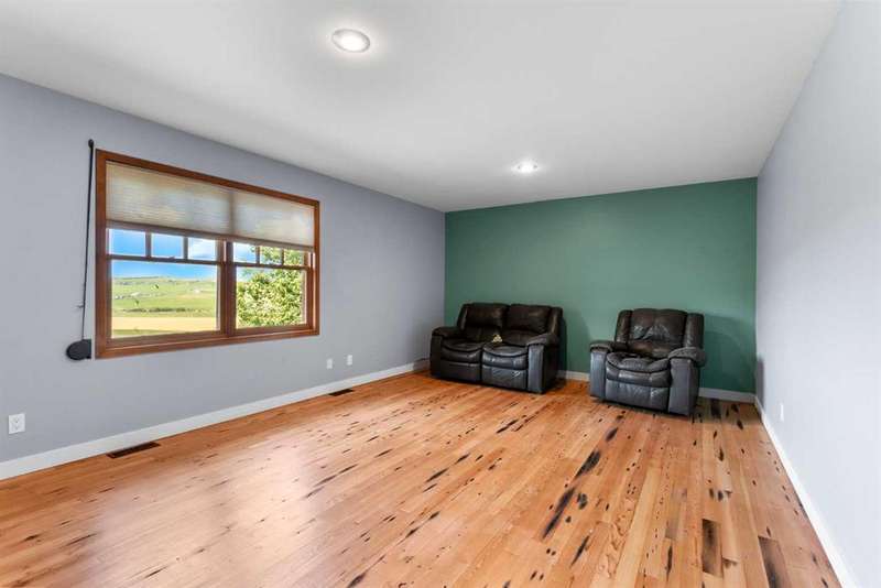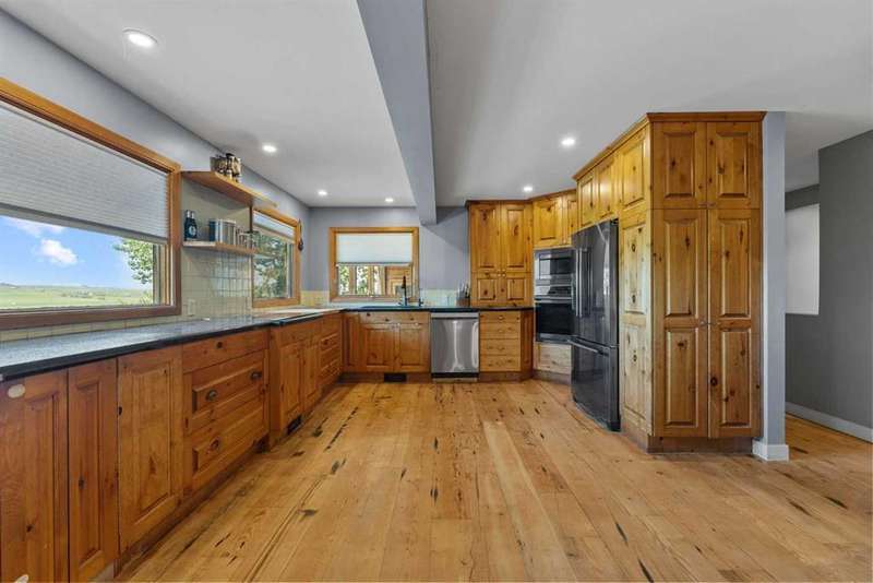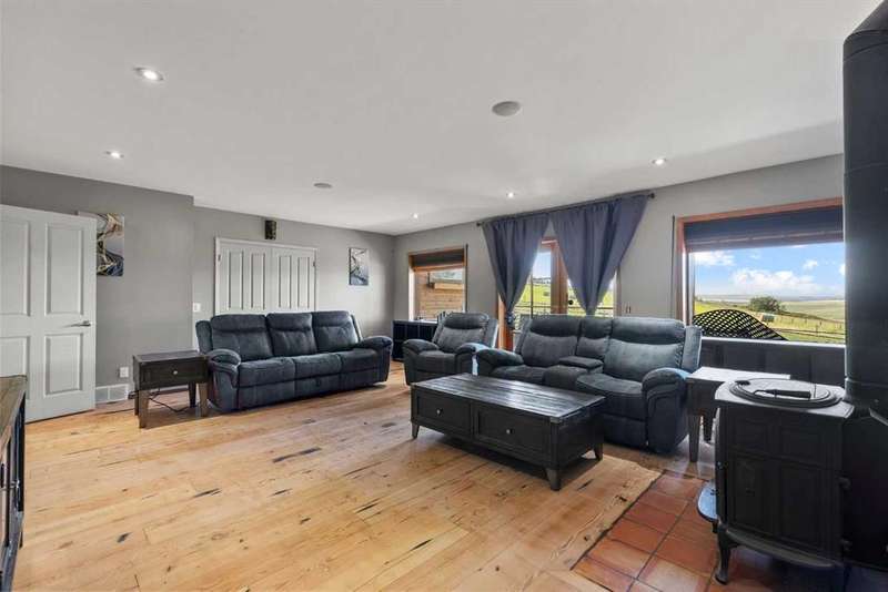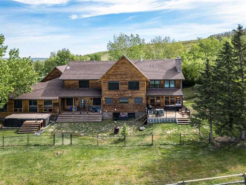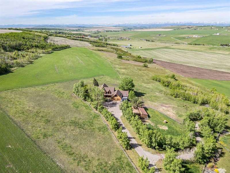 Discover the ultimate retreat at this secluded hilltop estate, boasting breathtaking mountain views and nestled on over 5 acres of lush land. YOU WILL NOT FIND A BETTER PRICE PER SQUARE FOOT HOME! This stunning cedar-wrapped residence features 8 spacious bedrooms and 8 bathrooms, offering nearly 8,200 square feet of beautifully developed space. Fully fenced and perfect for horses or family pets, this property provides ample room for a large family to thrive. Enjoy the serene surroundings, complete with mature trees and expansive views. The home includes two master bedrooms, a main floor bedroom, and a separate office space. A remarkable 1,363 square-foot recreation/flex room awaits, ideal for a dance or art studio, games room, or even converting back into an indoor pool. Step outside to unwind around the fire pit, take a dip in the new swim spa, or explore the picturesque walking and riding trails among the mature landscaping. With plenty of accommodations for out-of-town guests, including RV parking, this home is perfect for entertaining. Special features such as hand-scraped hardwood flooring throughout, granite countertops, upgraded appliances, a cozy wood-burning stove, and generously sized bedrooms and bathrooms enhance the appeal of this family haven. Conveniently located just a short 7-minute drive from Okotoks, this estate offers the perfect blend of privacy and accessibility.