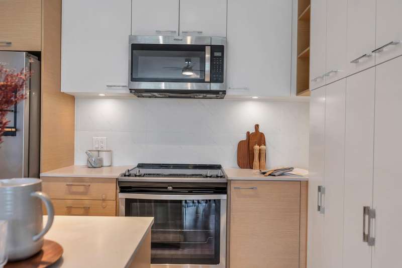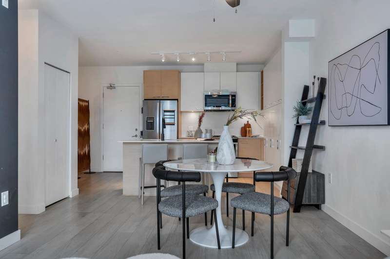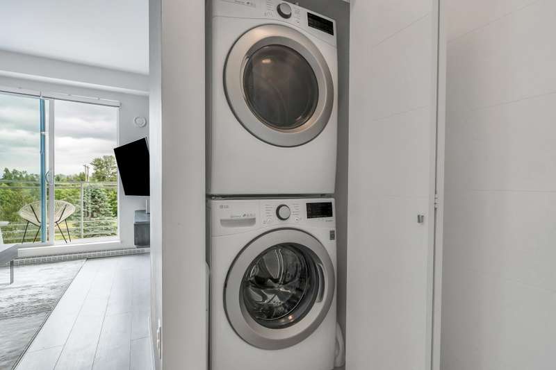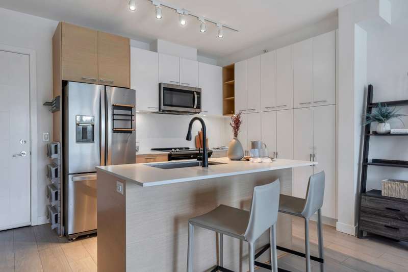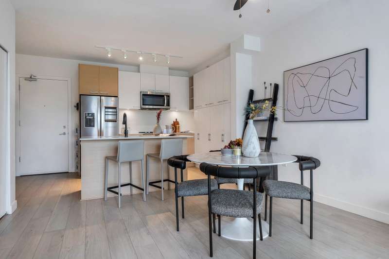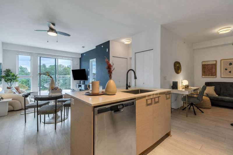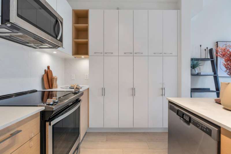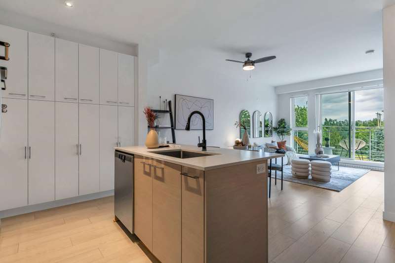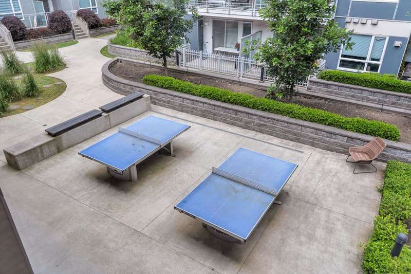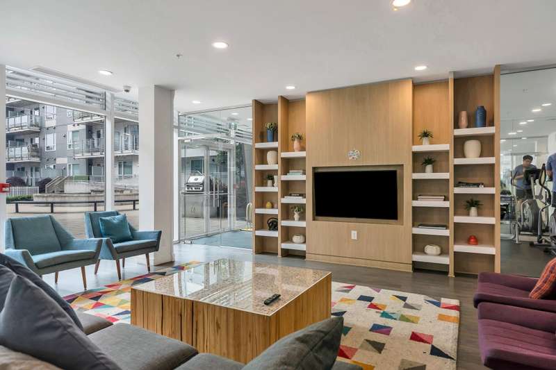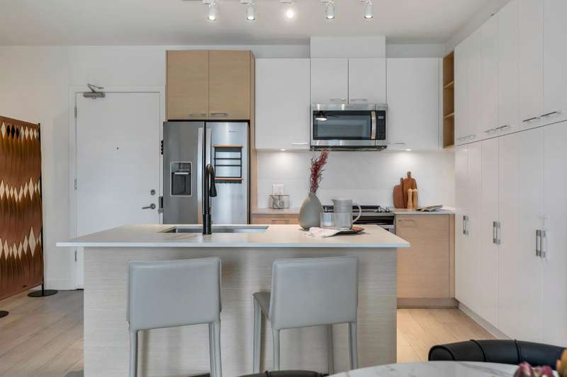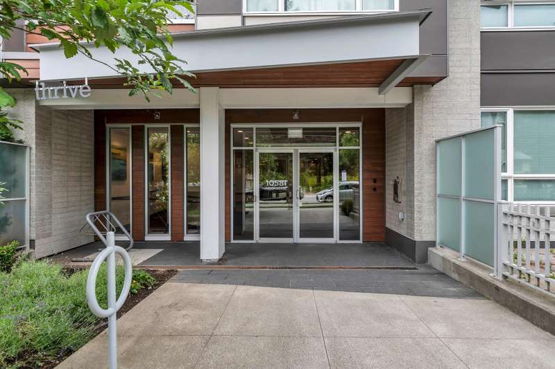 "THRIVE" at home. This spacious 1 BR and Den provides great comfort for both working and living at home. Top floor and east facing unit overlooking into the mountains. A large Den can be used as a professional home office, a home gym, or a sleeping space for the overnight guests. The primary bedroom is upgraded with laminate flooring and has a generous closet space. Lots of storage space with the well designed built-in pantry to keep all your things organized and hidden away. Enjoy the many amenities at THRIVE such as EV charge stations, full gym experience with weights, exercise machines, yoga studio, party room, outdoor ping pong table and lounge area. Convenient location and minutes to elementary school, supermarkets, parks, skytrain and shopping mall.