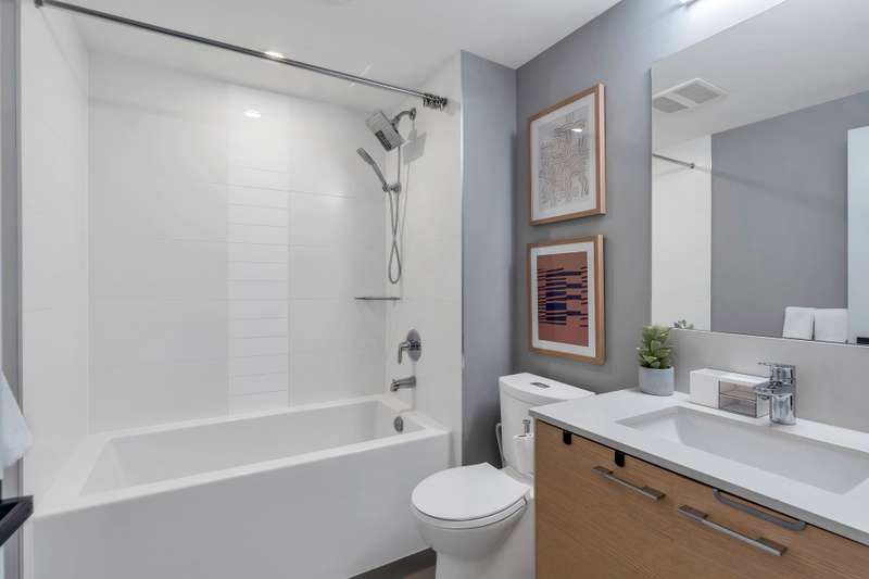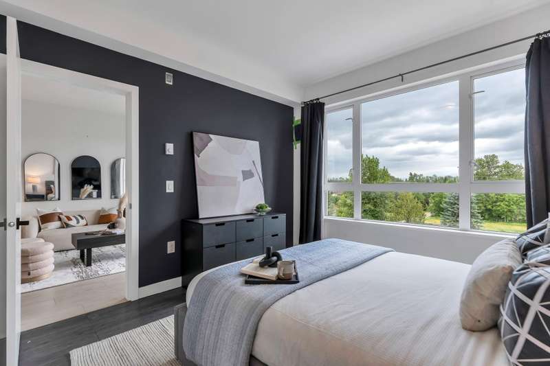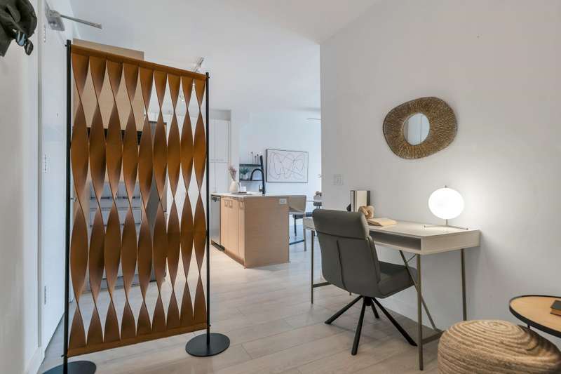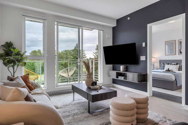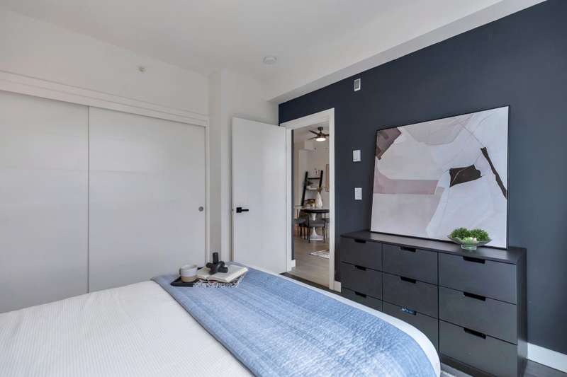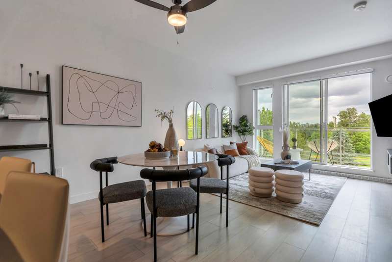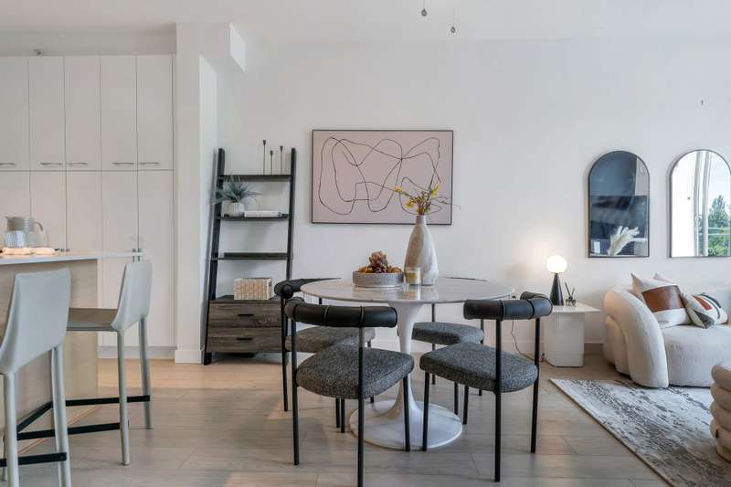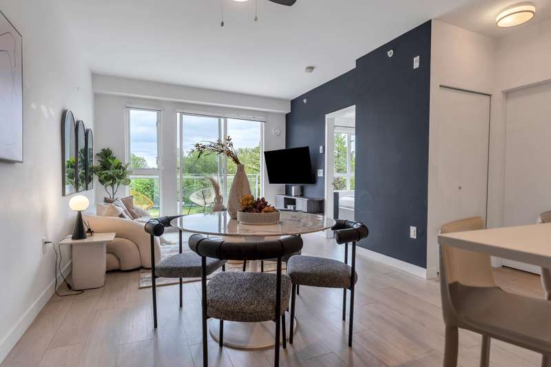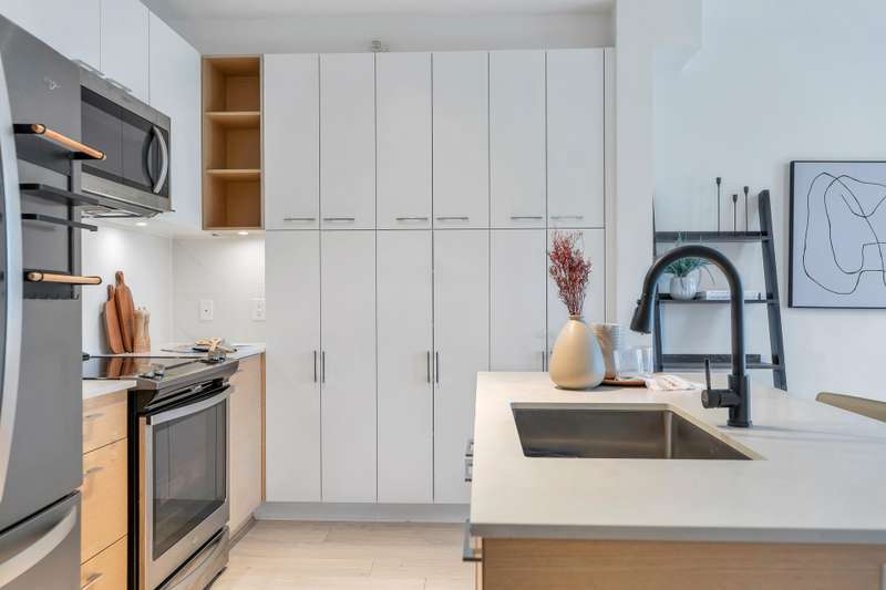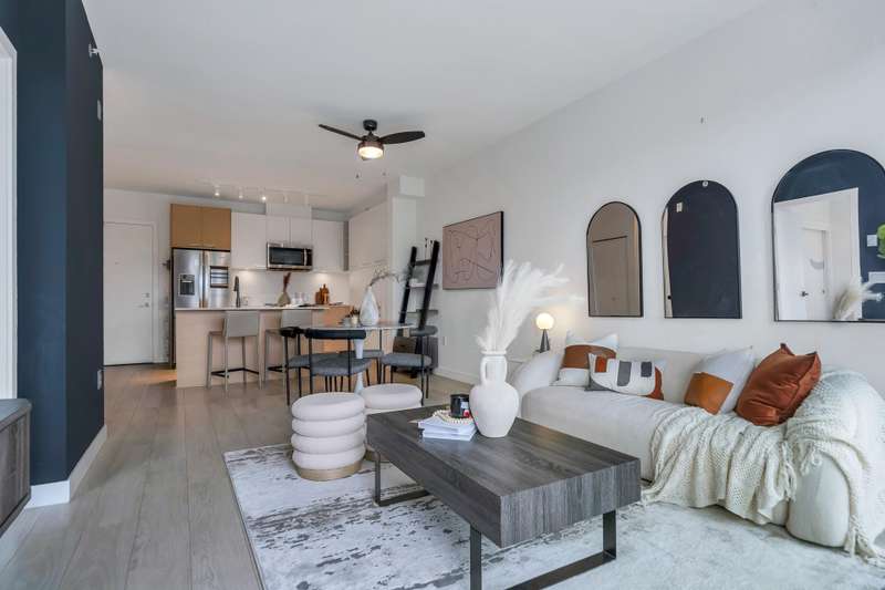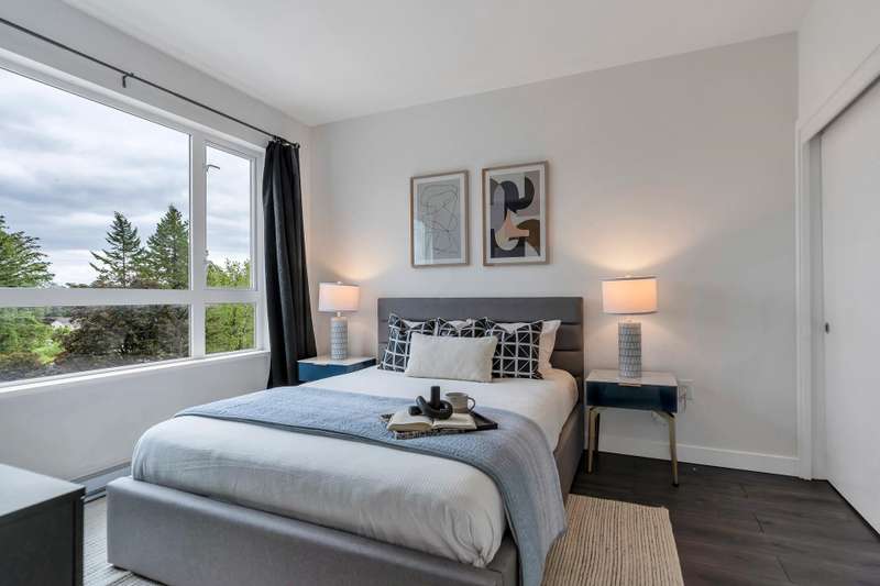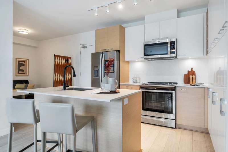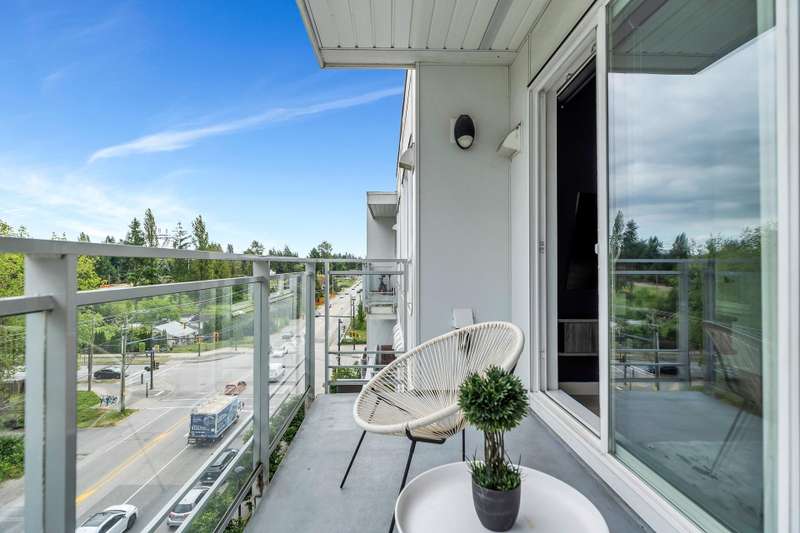 "THRIVE" at home. This spacious 1 BR and Den provides great comfort for both working and living at home. Top floor and east facing unit overlooking into the mountains. A large Den can be used as a professional home office, a home gym, or a sleeping space for the overnight guests. The primary bedroom is upgraded with laminate flooring and has a generous closet space. Lots of storage space with the well designed built-in pantry to keep all your things organized and hidden away. Enjoy the many amenities at THRIVE such as EV charge stations, full gym experience with weights, exercise machines, yoga studio, party room, outdoor ping pong table and lounge area. Convenient location and minutes to elementary school, supermarkets, parks, skytrain and shopping mall.