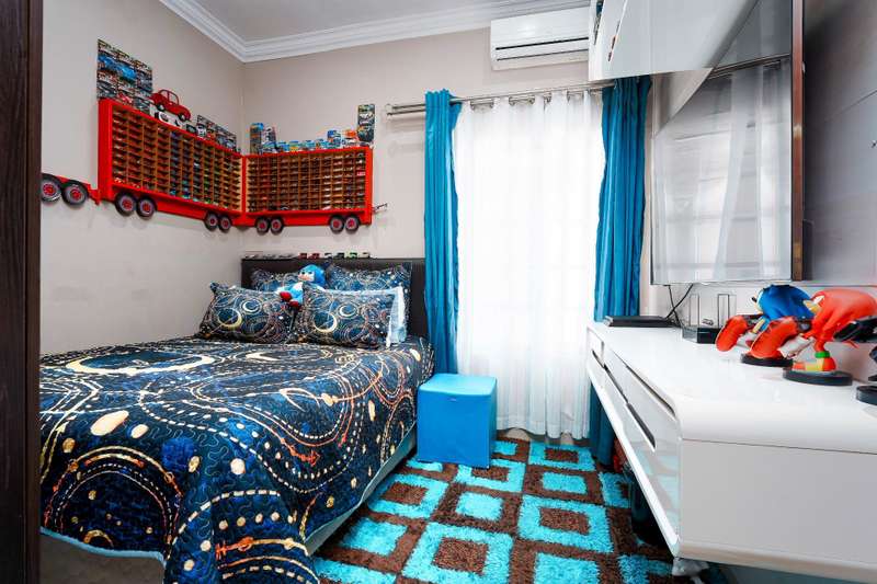The living room adds an extra layer of sophistication with two dazzling chandeliers and a fireplace, offering warmth and ambiance for those chilly winter evenings. Both the master and second bedrooms are outfitted with air-conditioning and built-in TVs, providing personal entertainment at your fingertips. The master bedroom also includes an ensuite bathroom, complete with a bath, shower, and his-and-her sinks. Each of the three bedrooms features tall, spacious cupboards that complement the elegantly high ceilings. A second bathroom, conveniently located, serves as a guest toilet with a bath and sink.