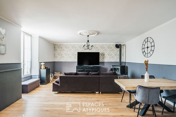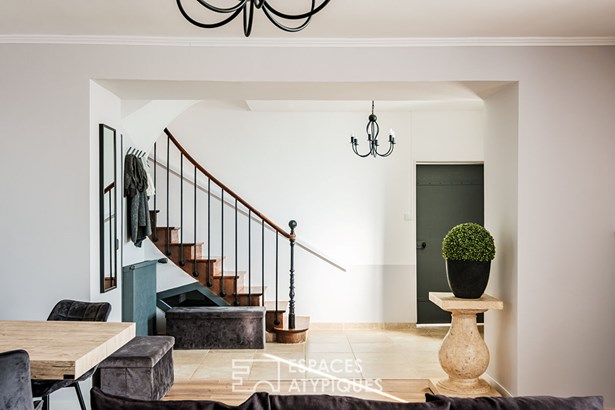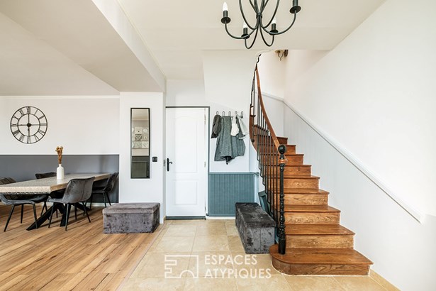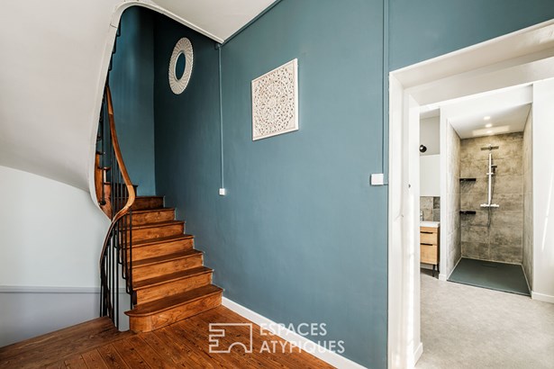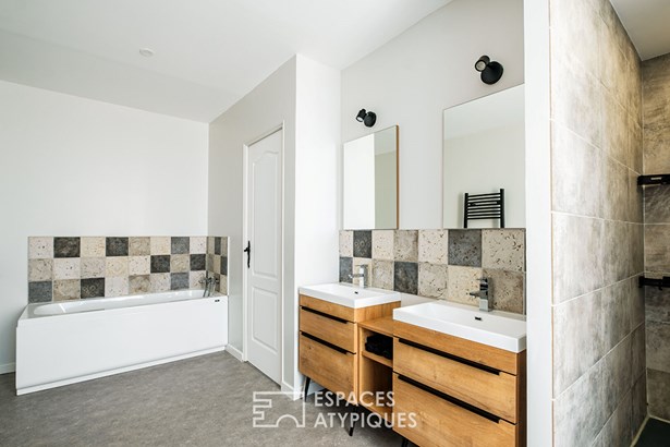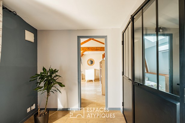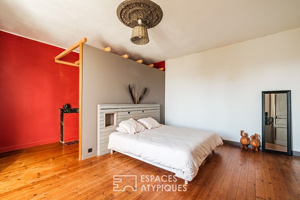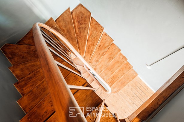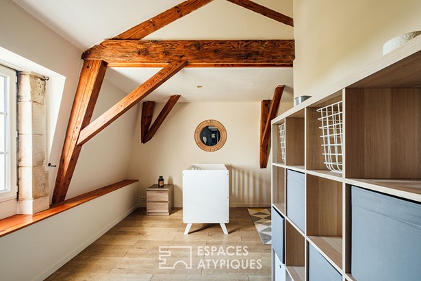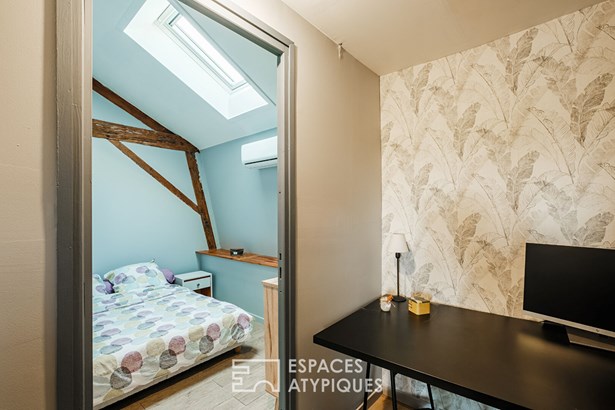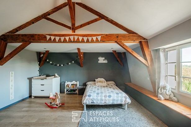 With a surface area of approximately 17 sqm, it has a bathtub, shower, and storage. The master bedroom includes a dressing room with an old fireplace adding charm to the whole. On the second floor, the staircase leads to three bedrooms, revealing the exposed timbers. One of them offers an office area, discreetly placed behind a workshop door.
