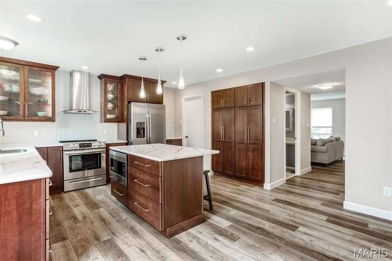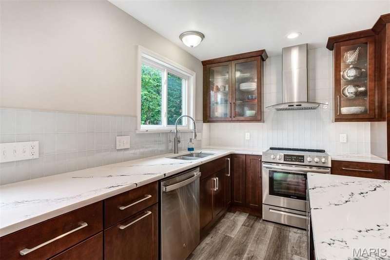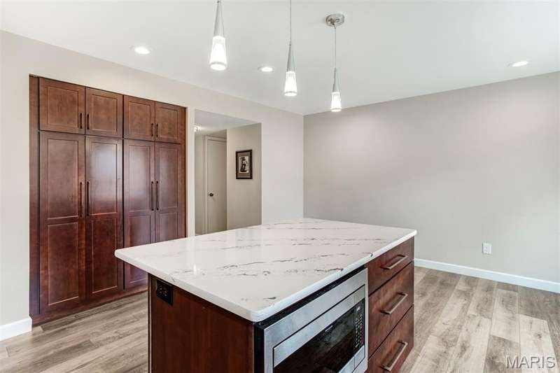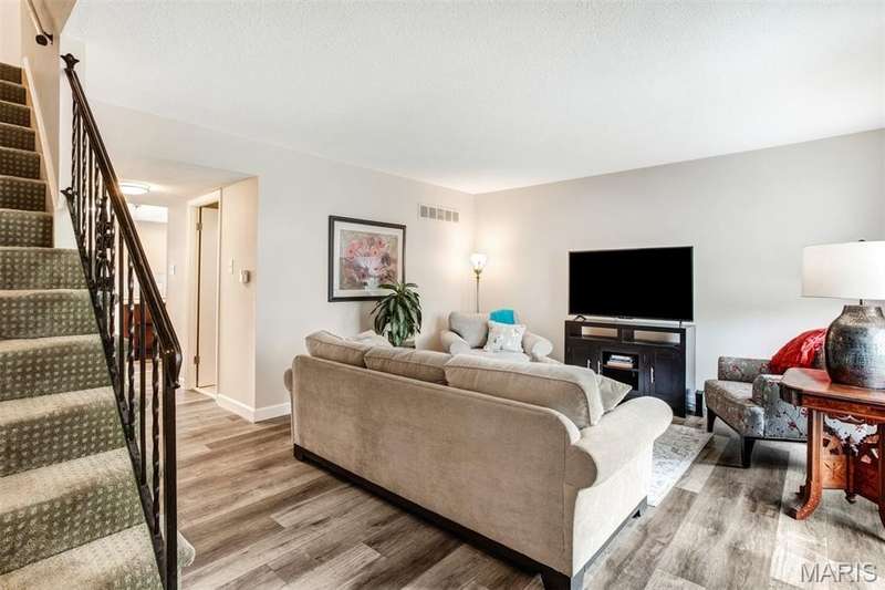 OPEN SUNDAY 1-3...Rare Opportunity to own this stunning 3-bedroom, 2.5-bathroom end unit townhome...with a fabulous, large, remodeled eat-in kitchen, boasting elegant quartz counters, custom cabinets (featuring glass doors and convenient roll-out shelves), center island with diode pendant lighting, stainless steel appliances, a spacious walk-in pantry, and beautiful under-cabinet and in-cabinet lighting. Sliding glass doors lead from the kitchen to a private patio, perfect for morning coffee and outdoor enjoyment. Freshly painted and newer flooring on main level. This townhome also includes a carport with two dedicated spaces just off fenced in patio and a full basement for ample storage or future finishing. Enjoy unparalleled convenience with Westport Plaza, shopping, dining, grocery stores, entertainment, coffee shops, and more just moments away. Opportunity is knocking...will you answer? Make an appointment and take a look today!