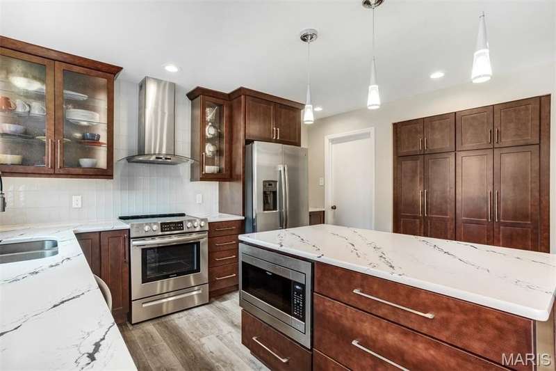 Discover this stunning 3-bedroom, 2.5-bathroom end unit townhome...with a fabulous, large, remodeled eat-in kitchen, boasting elegant quartz counters, custom cabinets (featuring glass doors and convenient roll-out shelves), center island with diode pendant lighting, stainless steel appliances, a spacious walk-in pantry, and beautiful under-cabinet and in-cabinet lighting. Sliding glass doors lead from the kitchen to a private patio, perfect for morning coffee and outdoor enjoyment. Freshly painted and newer flooring on main level. This townhome also includes a carport with two dedicated spaces just off fenced in patio and a full basement for ample storage or future finishing. Enjoy unparalleled convenience with Westport Plaza, shopping, dining, grocery stores, entertainment, coffee shops, and more just moments away. Opportunity is knocking...will you answer? Make an appointment and take a look today!