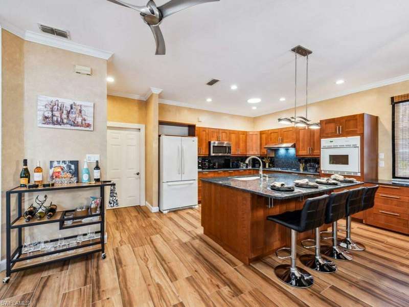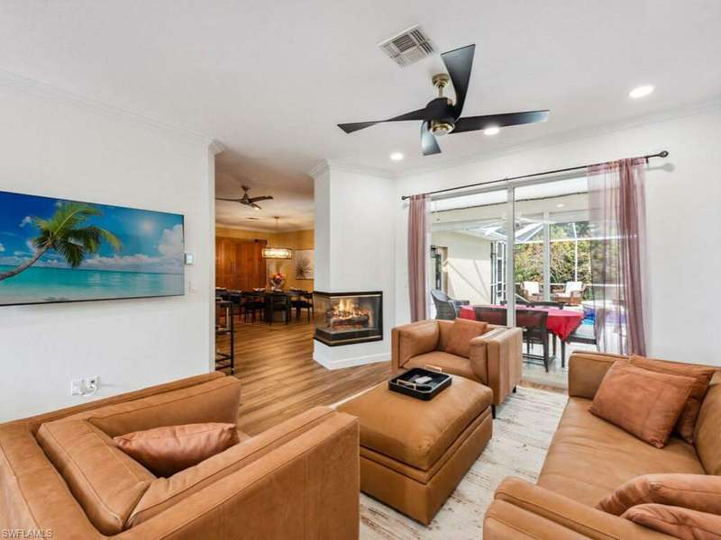 Available Summer 2025 and Season 2026. Move-in Ready, Beautifully decorated home, wait and see, not to mention a prime location! Enjoy this 3 bedroom 2 bath spacious home with heated pool and spa-well-appointed chef's kitchen large center island with seating, and dining area. New Appliances: The see-through gas fireplace opens up to the kitchen, dining, and living room. Split bedrooms with walk-in closets. All bedrooms have mounted smart TVs, as well as the kitchen and living room. Equipped with high-speed WiFi you can work and play. Updated bathrooms with step-in showers and bathtub in Master Bedroom. Step into an oversized outdoor entertaining oasis overlooking the heated pool and spa-a private tropical setting to relax and enjoy your outdoor grilling. Go for a bike ride or take a walk in a quiet and peaceful neighborhood-bikes equipped with helmets, cell phone & water bottle holders, beach chairs umbrella, and a workout bench equipped with weights provided. Convenient to grocery, beaches, shops, an array of restaurants, and historic downtown Naples as well as Marco Island. Nearby a Pickleball Community Park, tennis, and botanical gardens. This well-equipped home has everything. Pets are welcome!